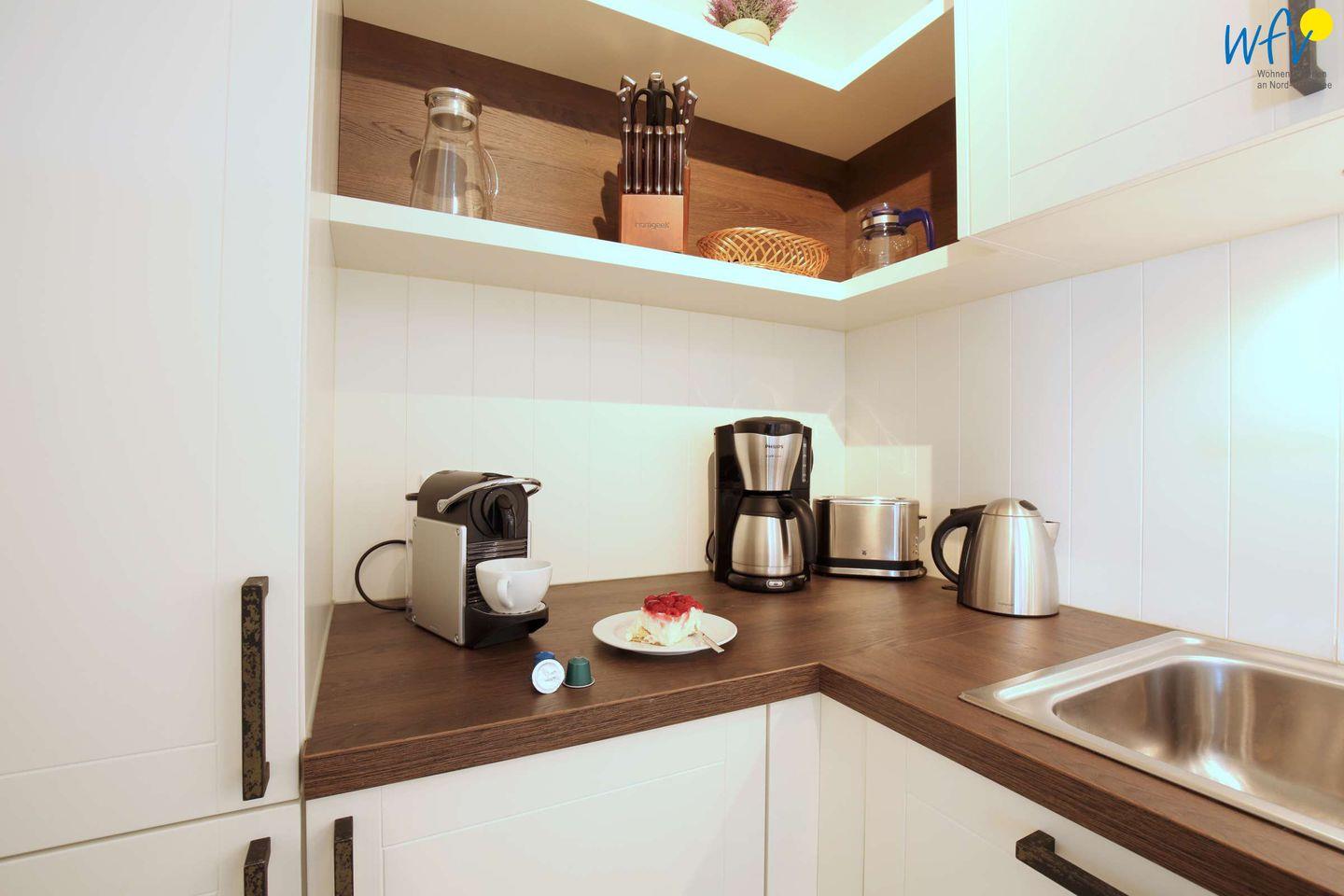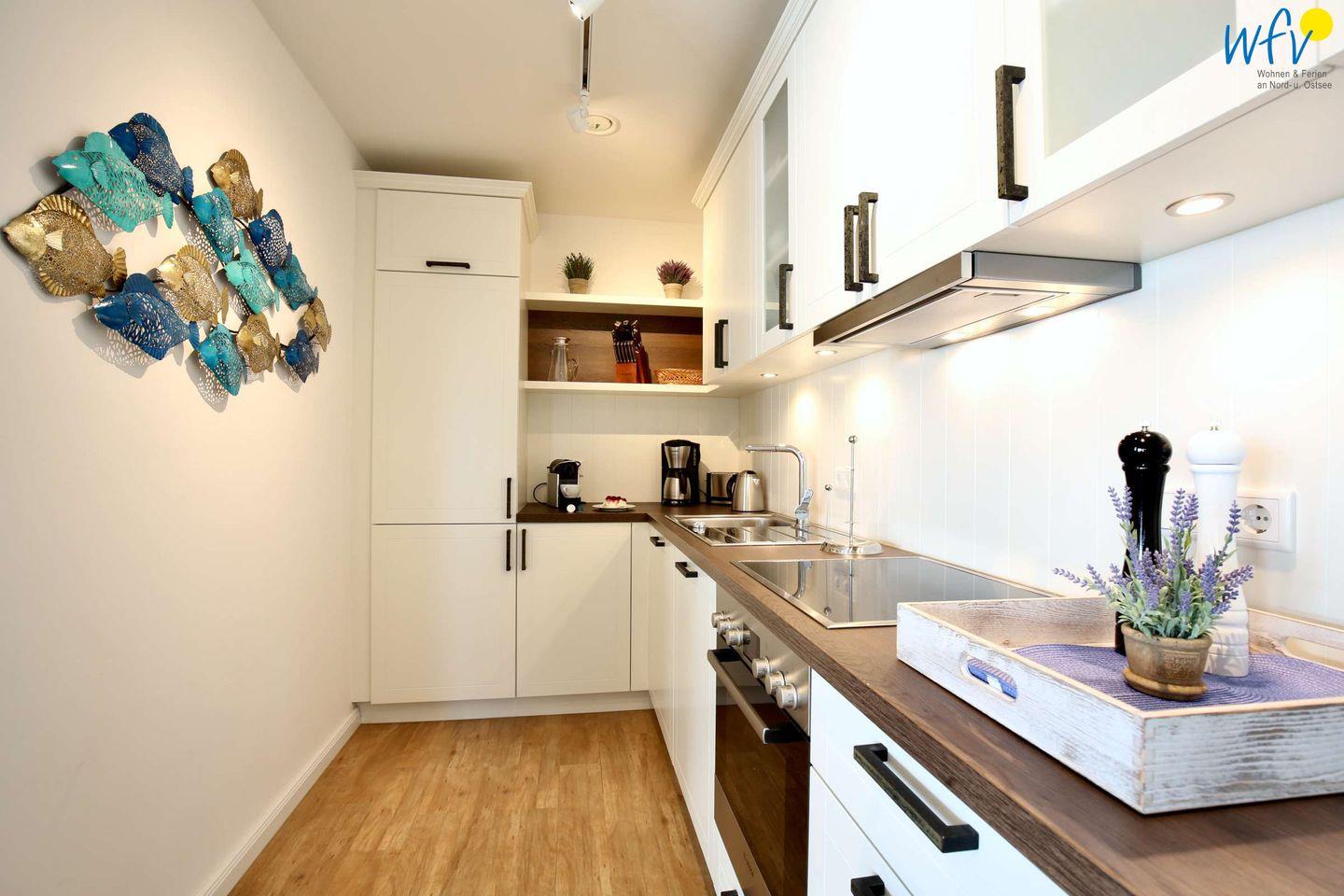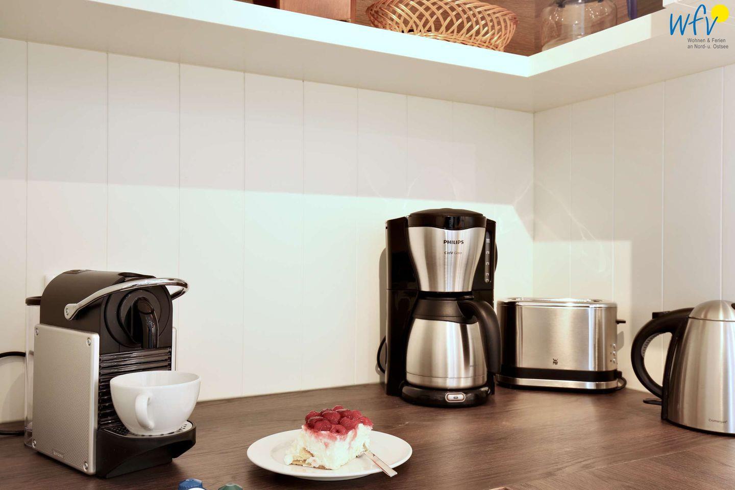 In der voll ausgestatteten Küche (u.a. mit Herd, Backofen, Spülmaschine sowie diversen Kleingeräten) lassen sich bequem leckere Gerichte zaubern. Ein großer Esstisch ist ebenfalls vorhanden.