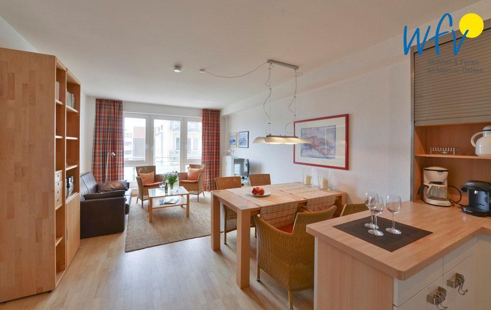 Das Kochen macht im Urlaub richtig Spaß! In der Küche mit Ceranfeld, Backofen und Mikrowelle lassen sich leckere Gerichte zaubern. Den Abwasch übernimmt die Spülmaschine. Oder Sie lassen sich verwöhnen und speisen auf der schönen Meerblickterrasse des hauseigenen Restaurants "Krüsch". Auf der Terrasse in direkter Promenaden- und Strandnähe genießen Sie herrliche Stunden mit Meeresbrise.