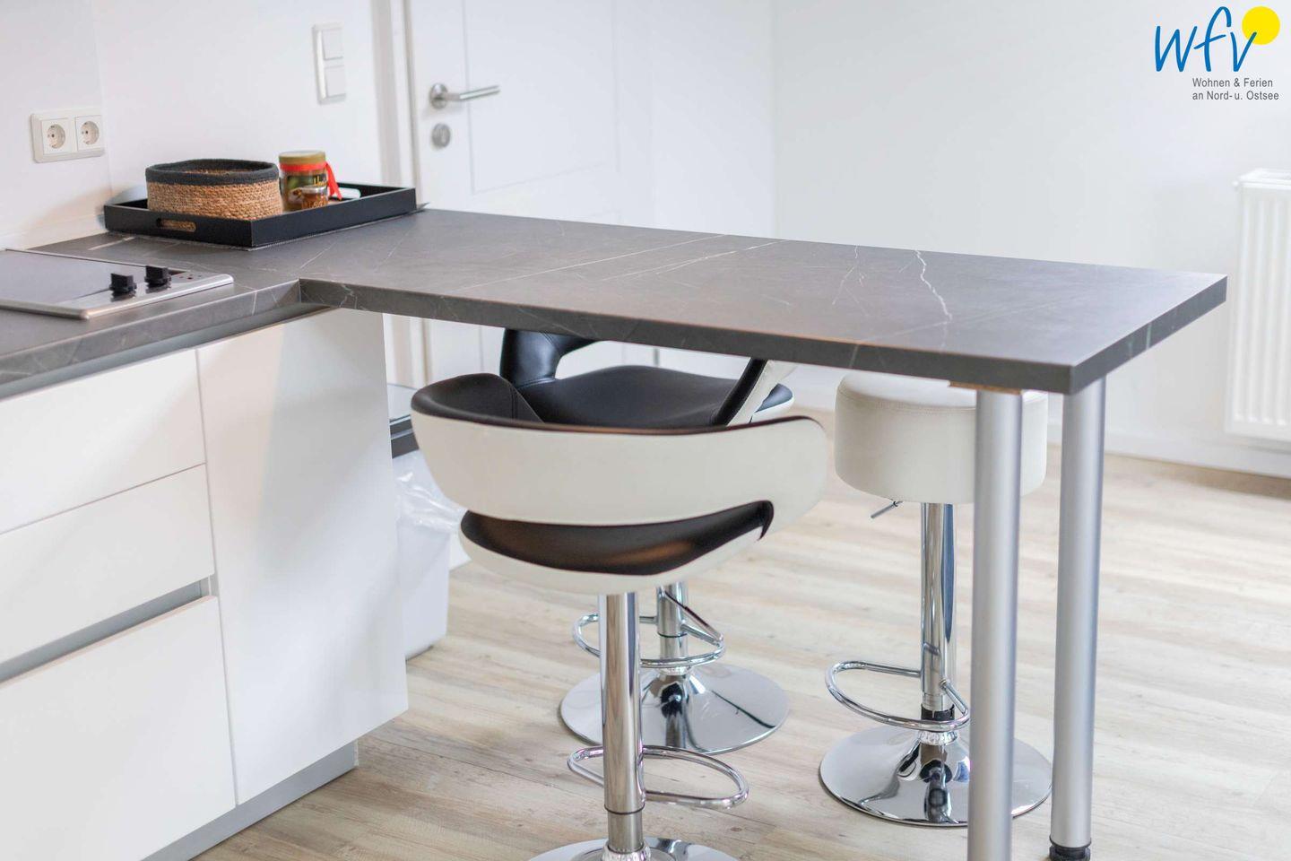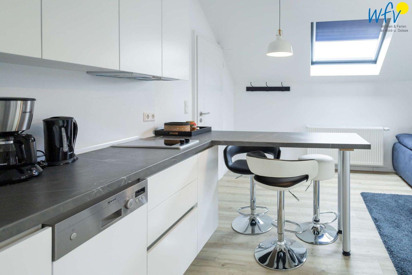 Durch die moderne Küche im Wohnraum können Sie sich in Ihrem Urlaub bequem selbst verpflegen. Sie ist u.a. mit Ceranherd, Backofen, Kühlschrank mit Gefrierfach, Mikrowelle und Geschirrspüler sowie Kaffeemaschine, Wasserkocher, Toaster und Mixer ausgestattet.