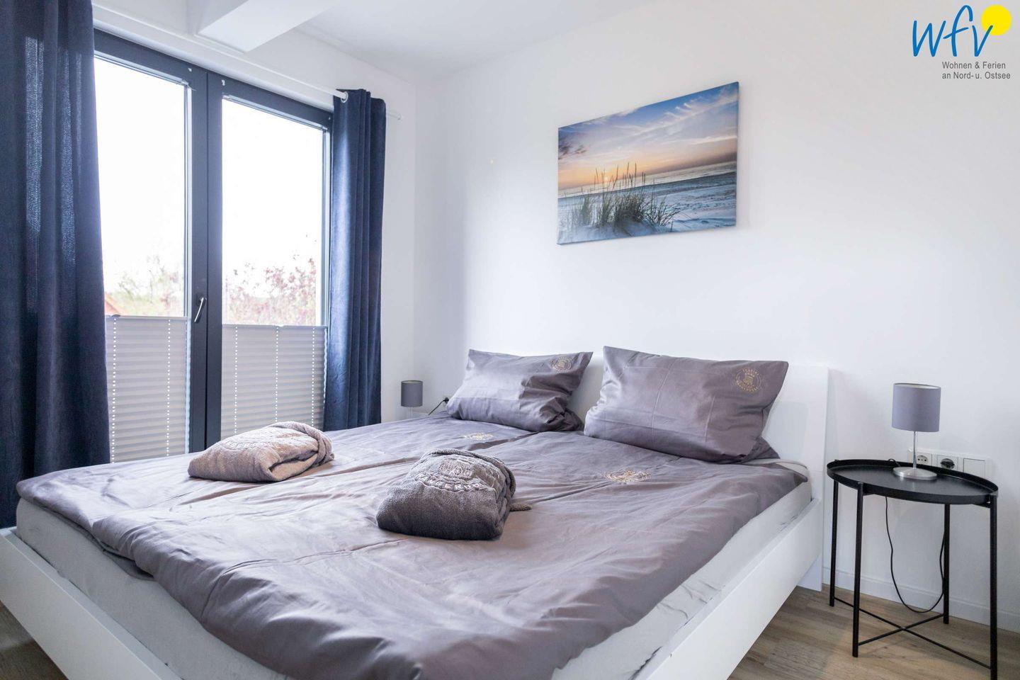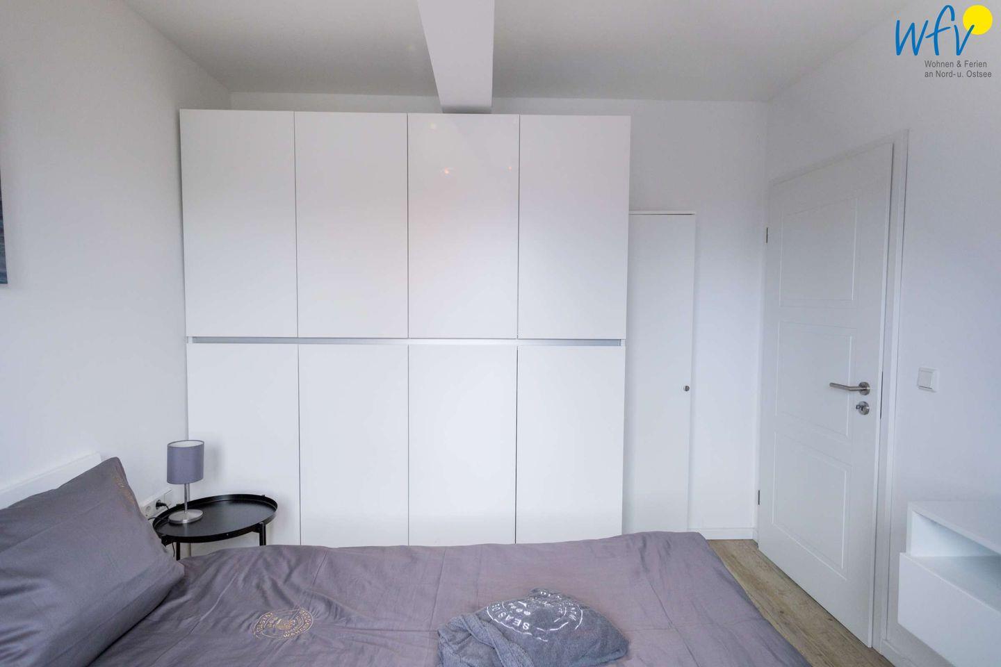 In dem separaten Schlafzimmer der Wangerooger Ferienwohnung befindet sich ein Doppelbett. Ein zweiter Fernseher bietet zusätzlichen Komfort. Ihre Urlaubsgarderobe findet Platz im geräumigen Kleiderschrank.