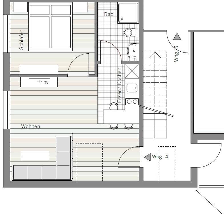 Die Wohnung 4 befindet sich im 1. Obergeschoss und verfügt über einen großzügigen Wohnraum mit Couchecke, eine offene Küche, ein separates Schlafzimmer und ein Duschbad.