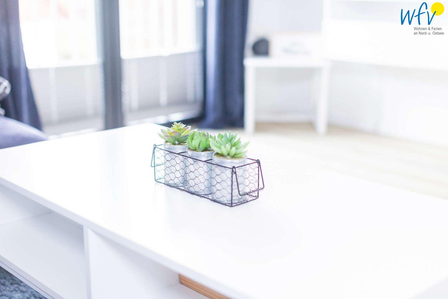 Wunderbar entspannen können Sie vor allem in dem stilvoll eingerichteten Wohnbereich der Wangerooger Ferienwohnung – inklusive Relaxpaket mit gemütlicher Couchecke und modernem TV mit Netflix-Entertainment!