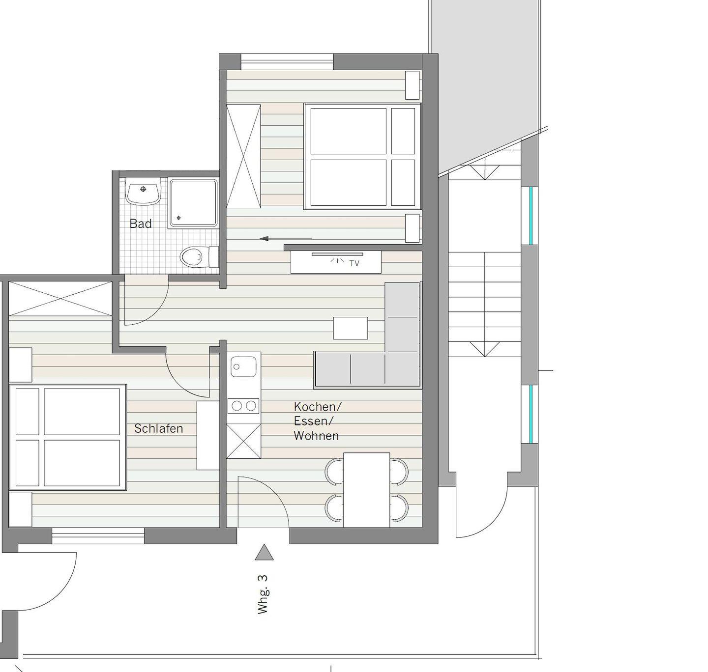 Die Wohnung 3 befindet sich im 1. Obergeschoss und verfügt über einen großzügigen Wohnraum mit Couchecke, Essbereich und integrierter Küche sowie über zwei separate Schlafzimmer und ein Duschbad.