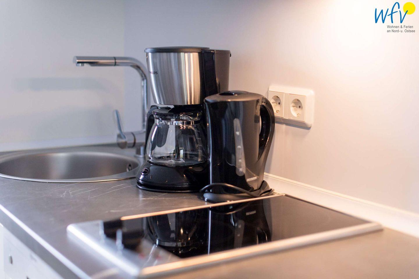 Durch die moderne Küche im Wohnraum können Sie sich in Ihrem Urlaub bequem selbst verpflegen. Sie ist u.a. mit Ceranherd, Backofen, Kühlschrank mit Gefrierfach, Mikrowelle und Geschirrspüler sowie Kaffeemaschine, Wasserkocher, Toaster und Mixer ausgestattet.