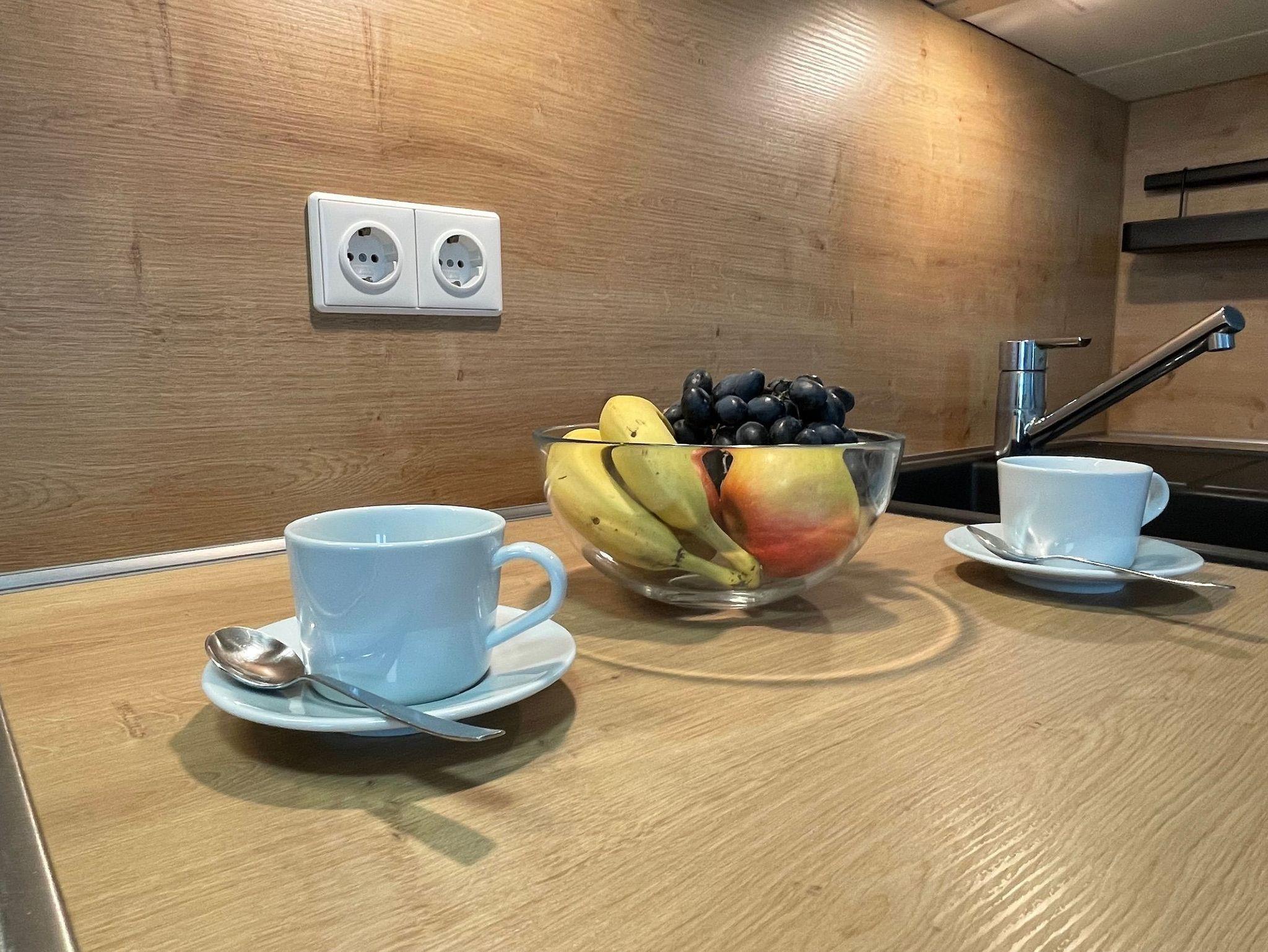Treten Sie auf unsere Terrasse in einer parkähnliche Gartenanlage und genießen Sie den Ausblick auf vorbeifahrende Boote und Ausflugsschiffe. Im modern eingerichteten Appartment ist Platz für 2 Erwachsene und max. 2 Kinder. Es steht ein Doppelbett im separaten Schlafzimmer und eine Schlafcouch im Wohnbereich bereit.