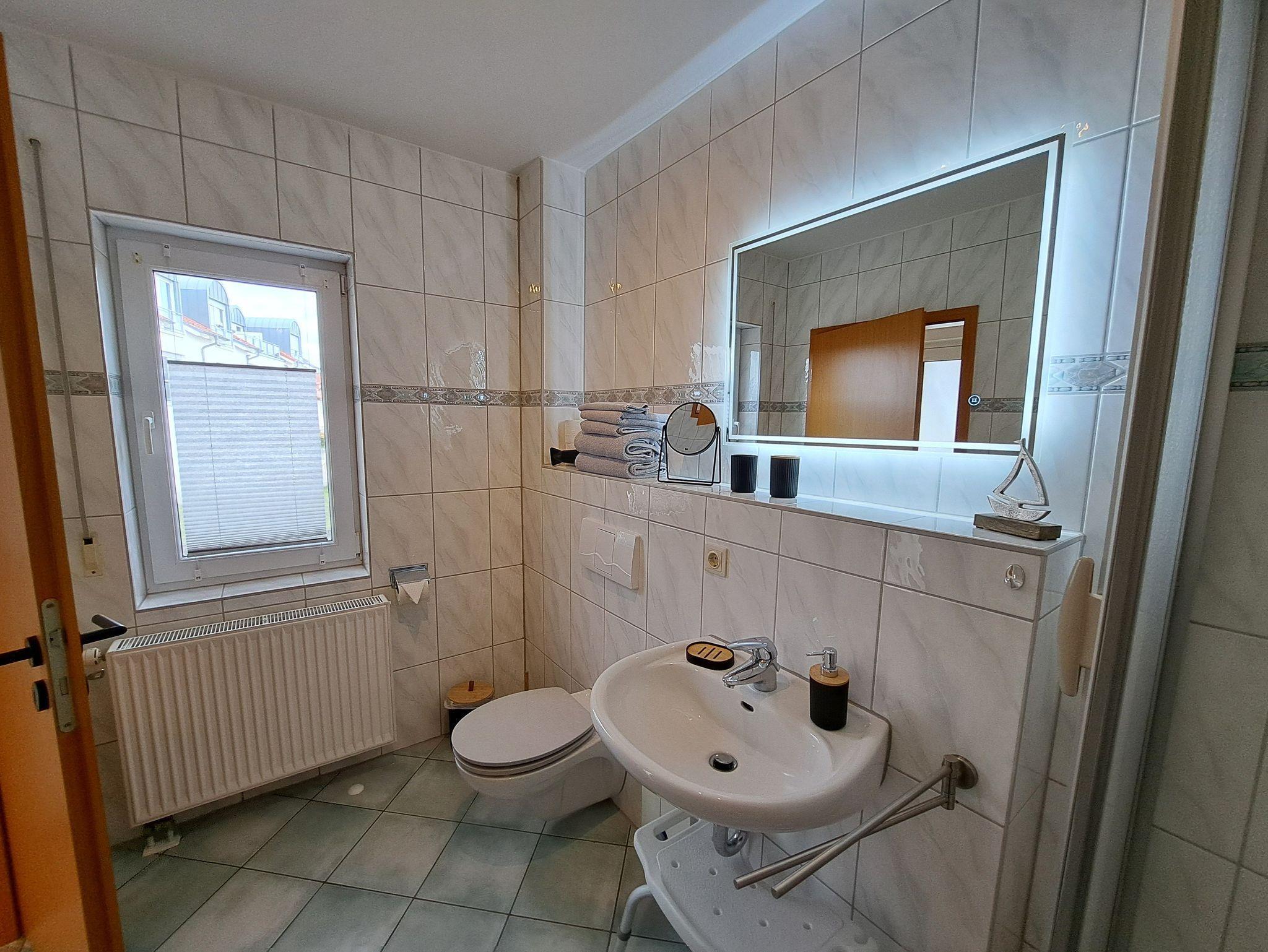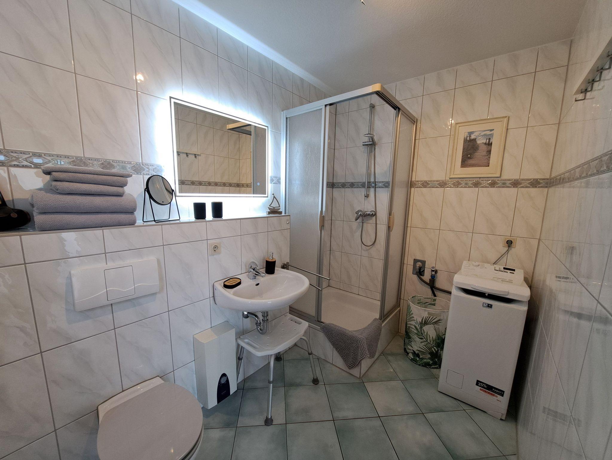 Die Ferienwohnung Hafenperle empfängt Sie mit einem hellen und großzügigen Flur, ausgestattet mit Garderobe und Schuhablage. Gleich am Anfang des Flures finden Sie das Tageslichtbad, das Ihnen eine Dusche, einen Waschtisch und ein WC bietet.