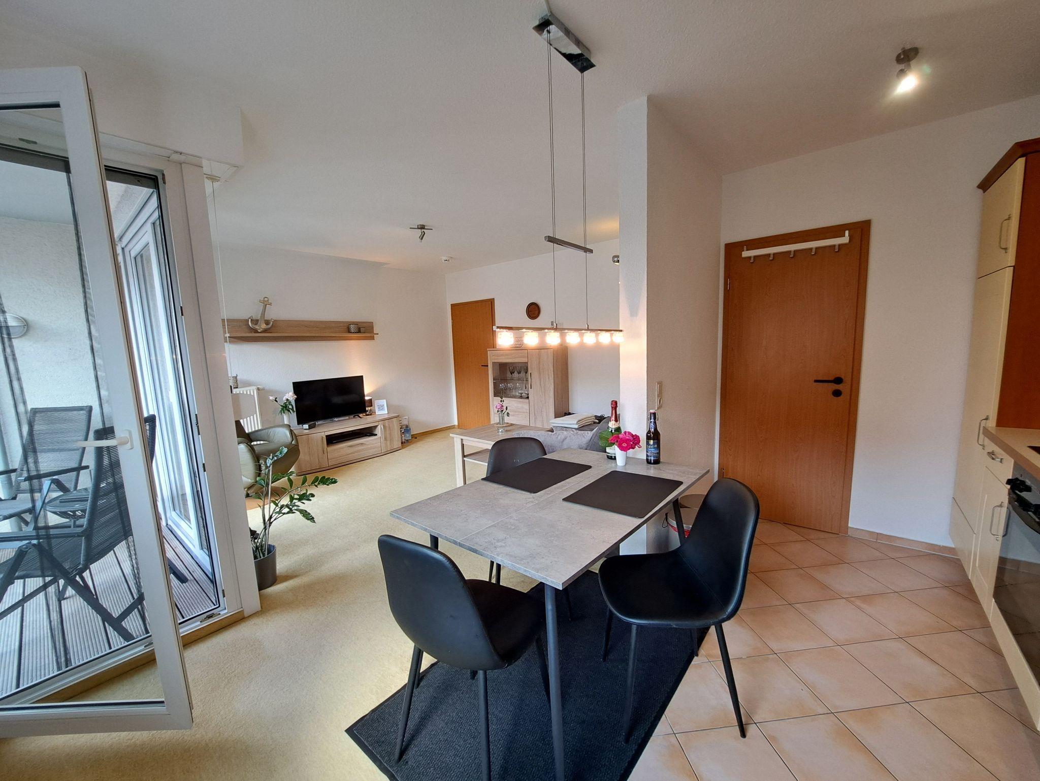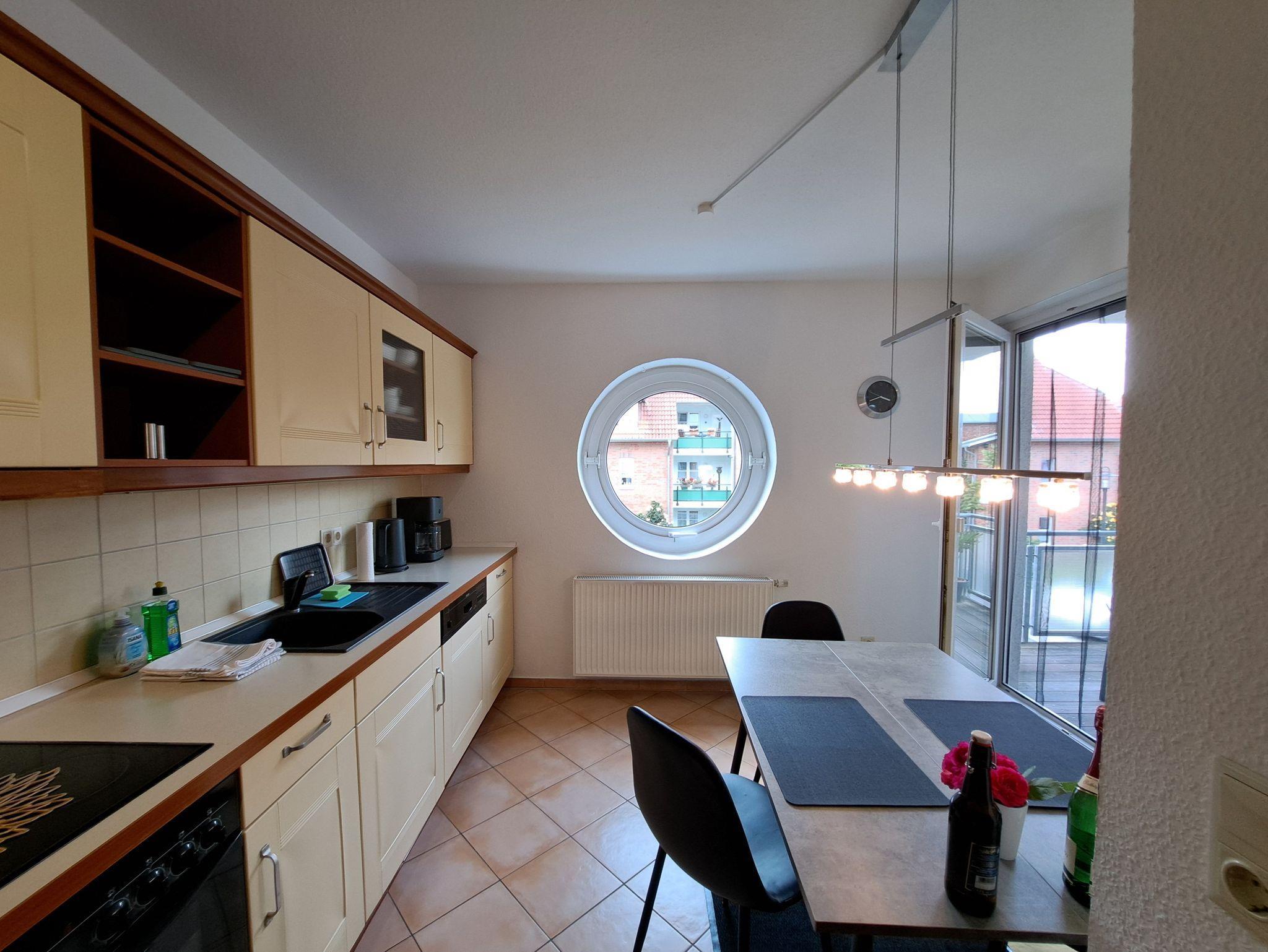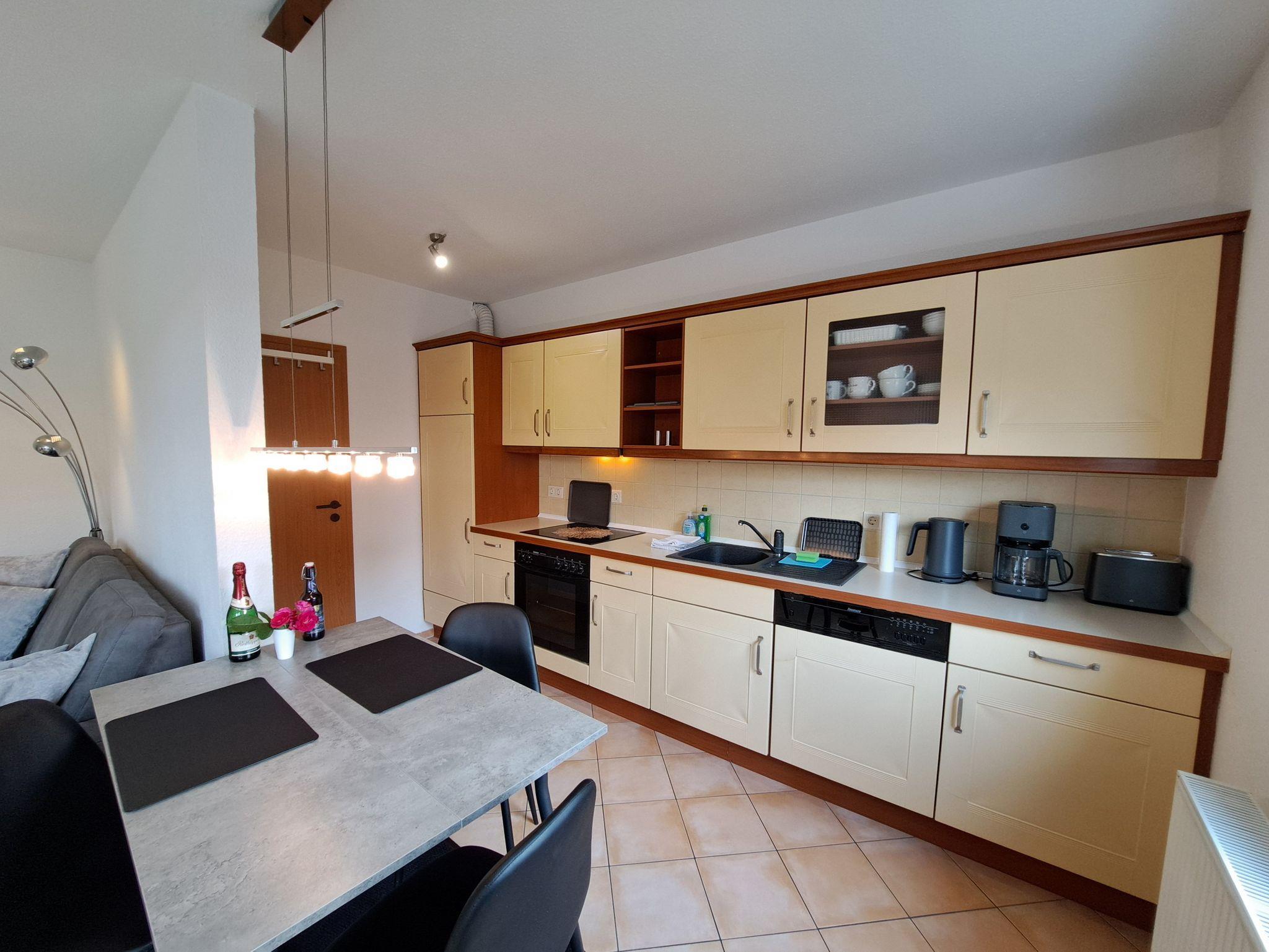 Die offene Wohnküche mit Esstisch ist voll ausgestattet und enthält alle wichtigen technischen Geräte sowie einen praktischen Hauswirtschaftsraum.
