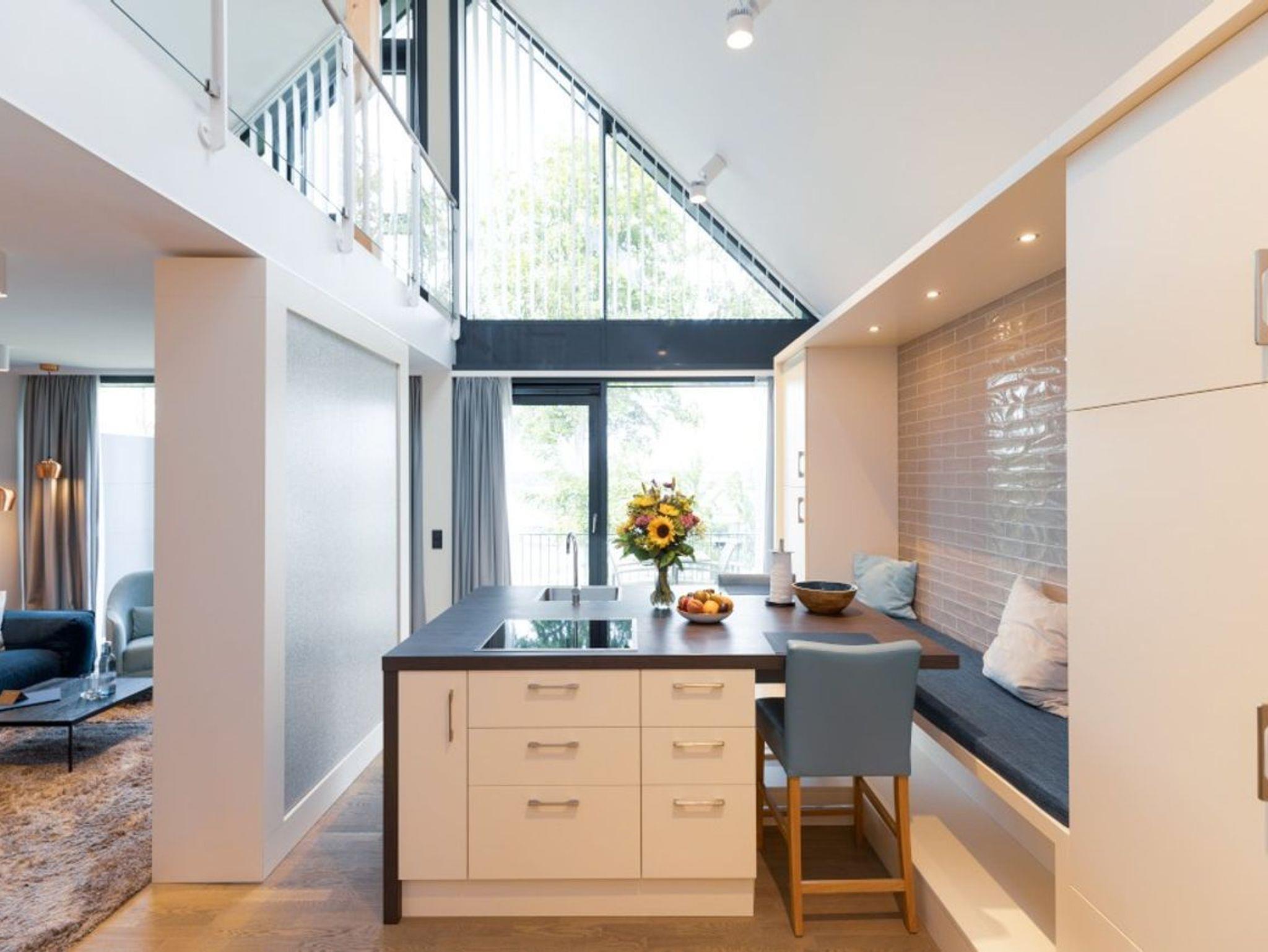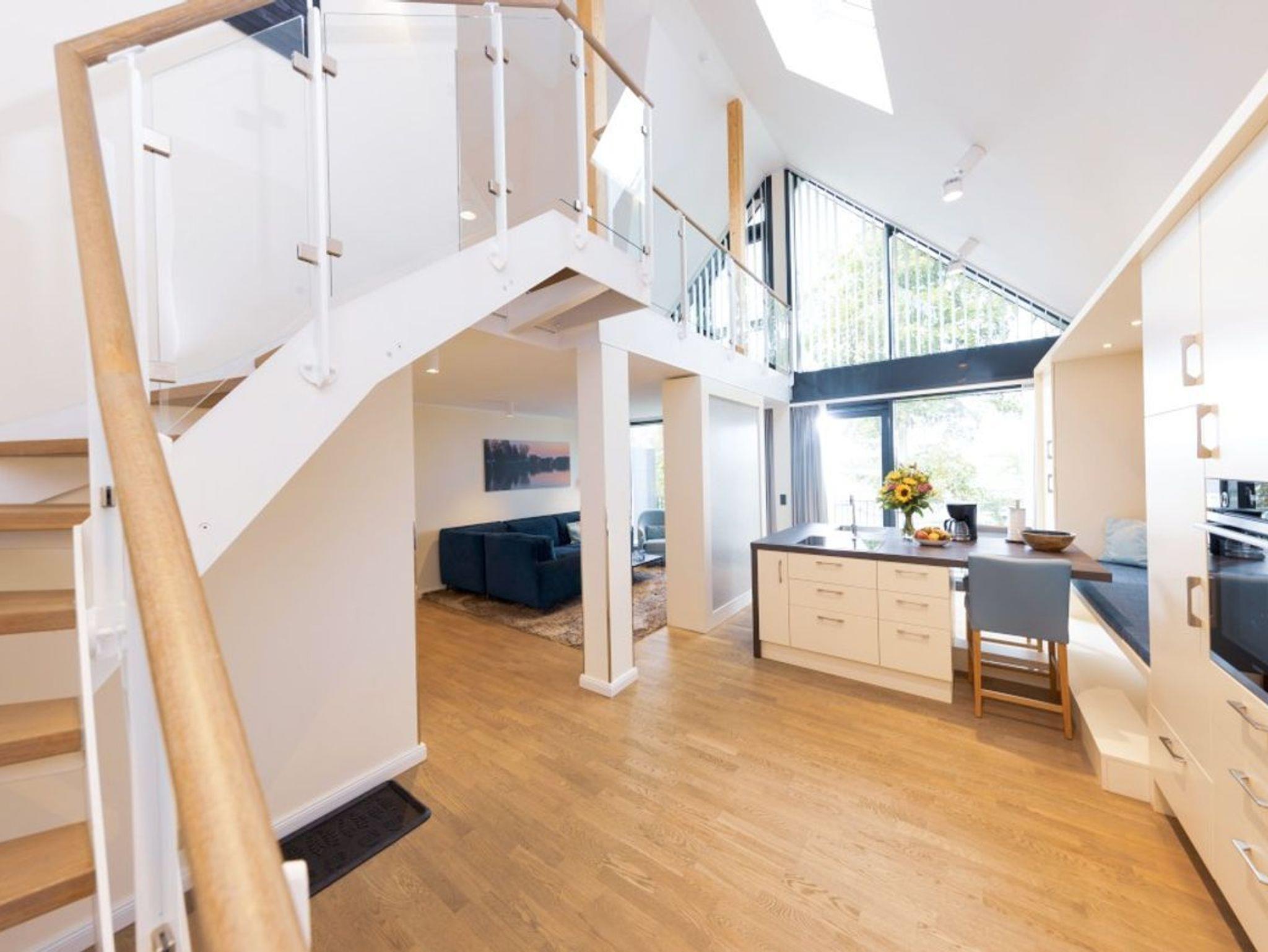 Die eleganten Kompass Maisonette Suiten mit Müritzblick und einer Größe von 71 qm erwarten Sie mitten im Herzen der Mecklenburgischen Seenplatte. Dank attraktiver Lage und auf hohem Niveau stilvoll eingerichtet, bietet diese Unterkunft mit Wohn- und Essbereich, einem Schlafzimmer auf der Galerie mit Badezimmer en Suite sowie eigenem Balkon einen komfortablen Aufenthalt. Die Suite verfügt über eine Kücheninsel mit zwei Barhockern und Sitzbank sowie ein Gäste WC. Alle angebenen Preise sind AB-Preise und richten sich nach länge und Jahreszeit des Aufenthalts.