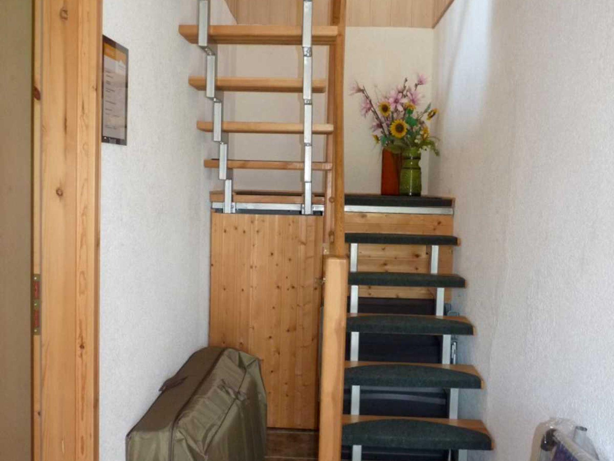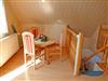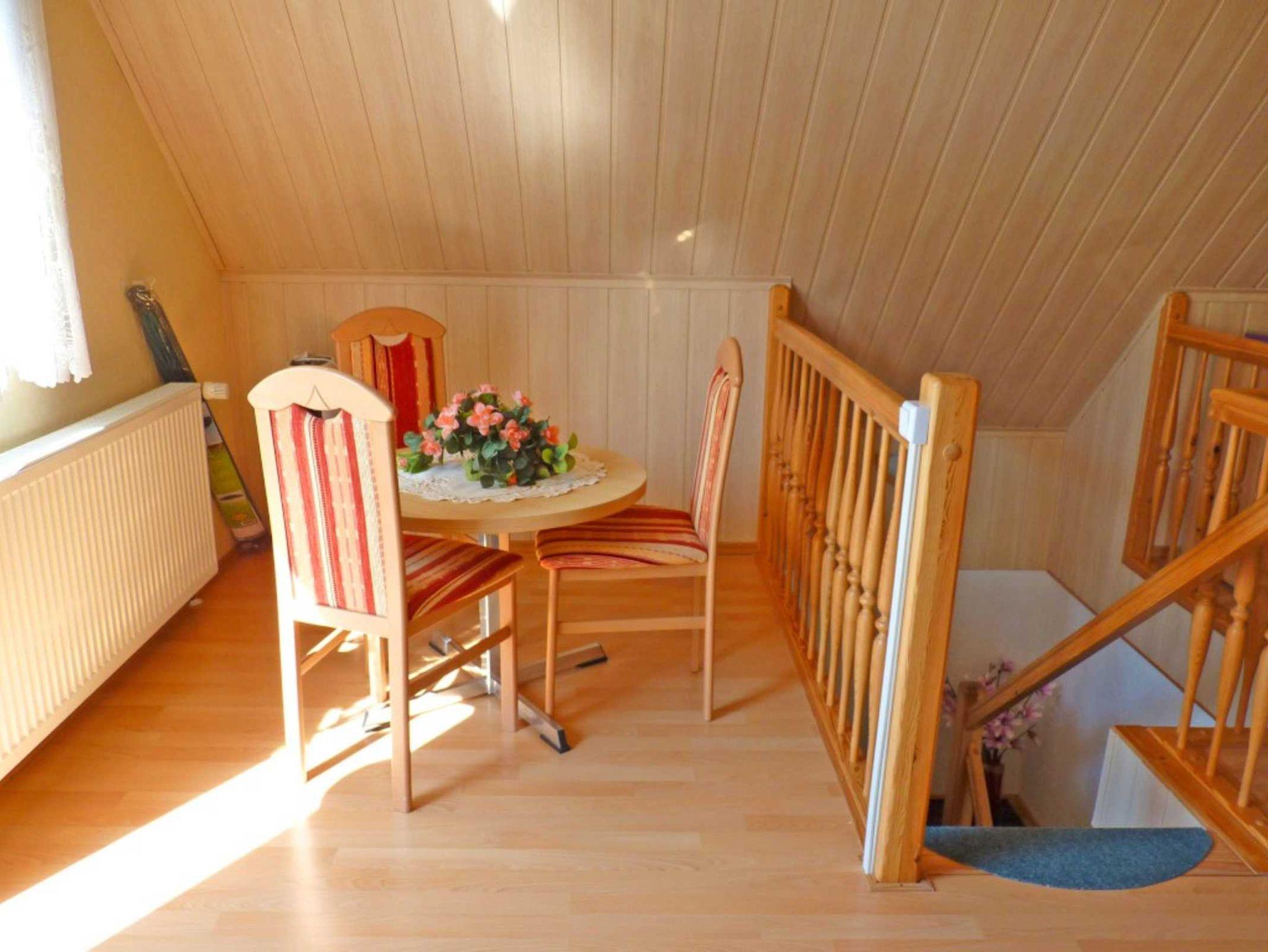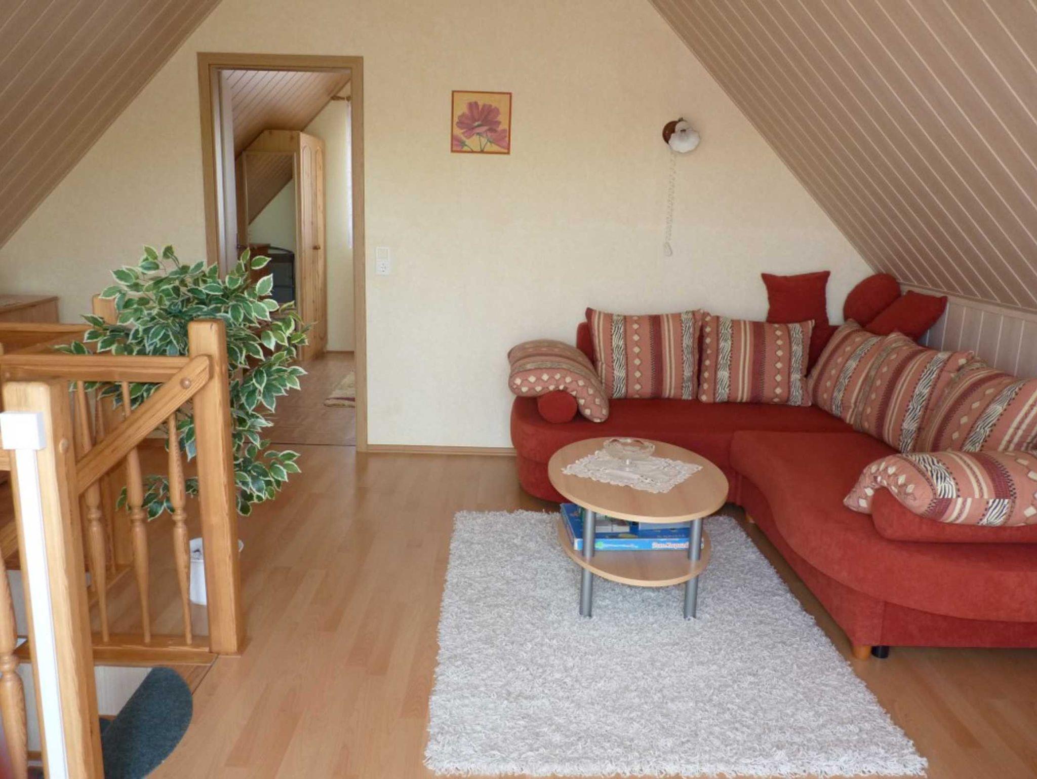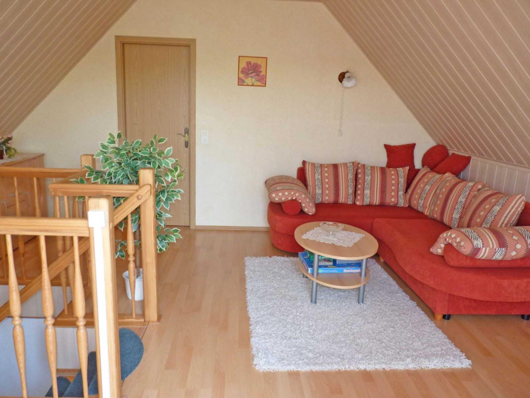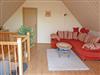 Das 50 qm große Nichtraucher - Ferienhaus mit einem Wohnraum und einem Schlafraum (im Obergeschoss), der Küche und einem Badezimmer mit Dusche/WC (im Erdgeschoss) ist neu und gemütlich eingerichtet. Ebenfalls im Erdgeschoss befindet sich eine komplette Einbauküche. Eine Aufbettung ist auf der Couch im Wohnzimmer möglich, am besten für Kinder bis 10 Jahre geeignet. Der Balkon mit Gartenmöbel läßt einen wunderschönen Blick in den Garten und die übrige Natur zu. Im Garten können Sie die Liegewiese mit den Gartenmöbeln nutzen. Pkw-Stellplatz und Abstellmöglichkeiten für Fahrräder sind ebenfalls vorhanden.