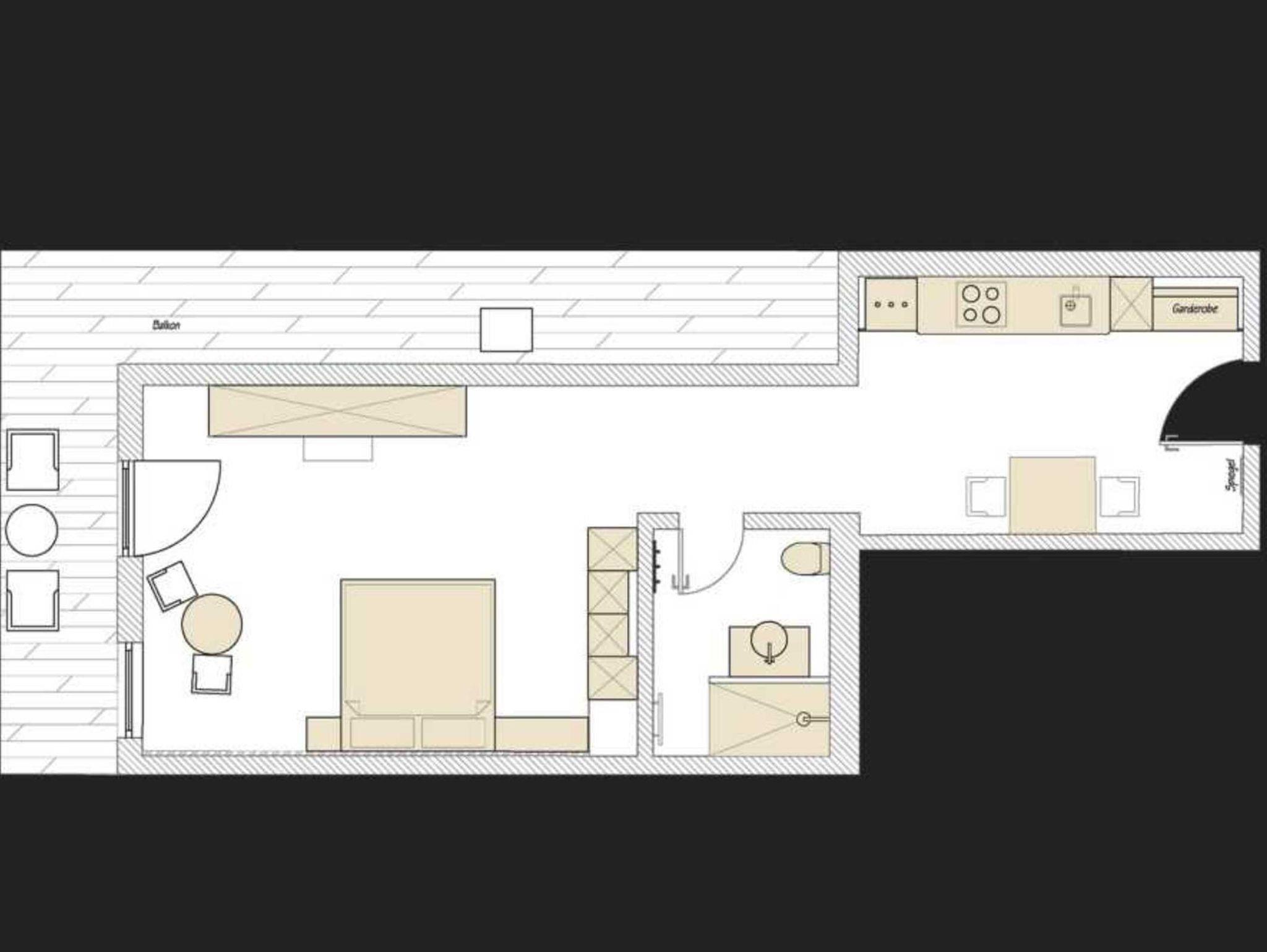 Die Suite Rätselhäuser Oberwall befindet sich im Obergeschoss des Hauses und verfügt über einen kombinierten Wohn-/Schlaf und Essbereich mit offener Küche und einen Balkon: 7 qm (Müritzblick Südseite)