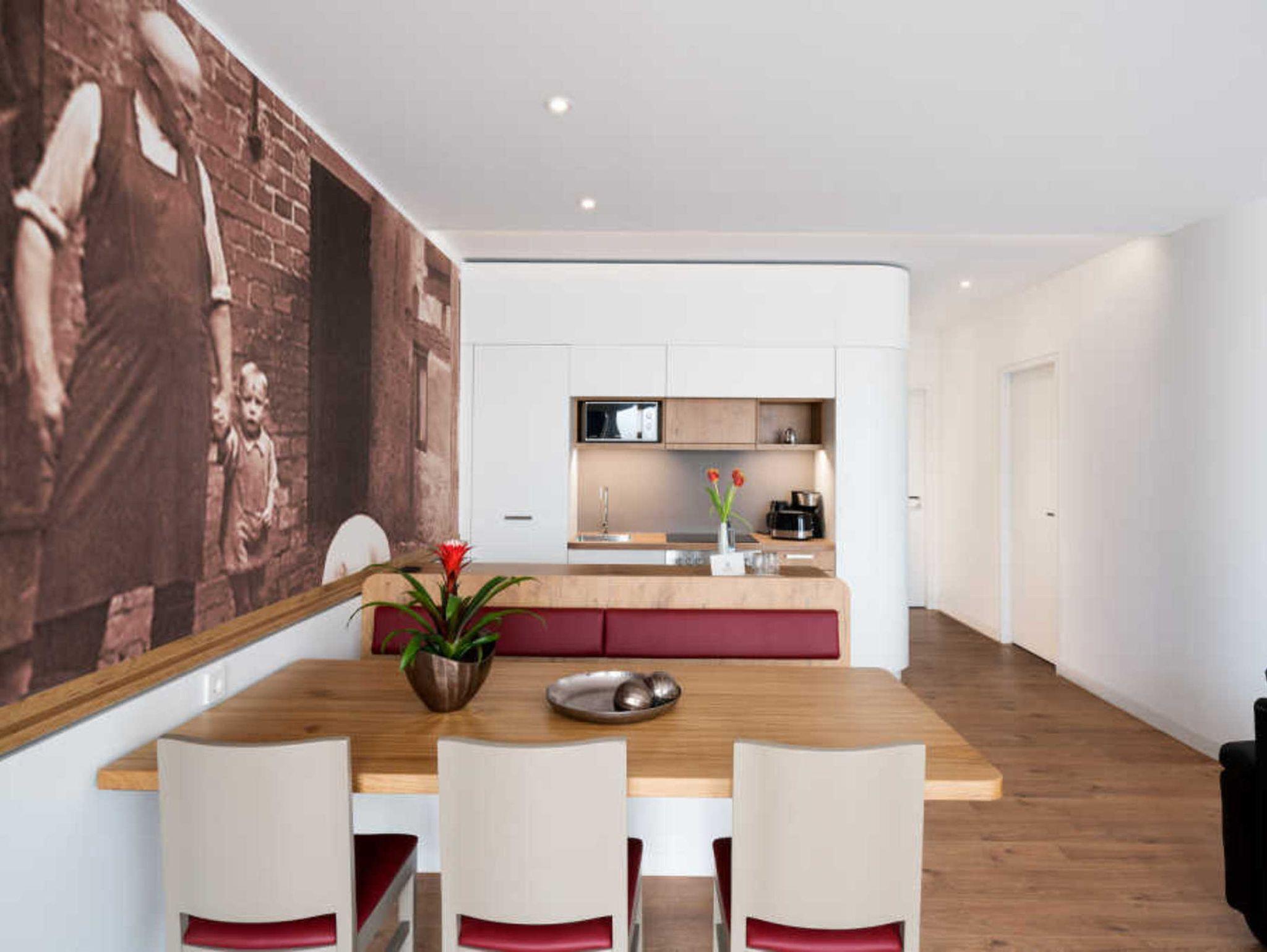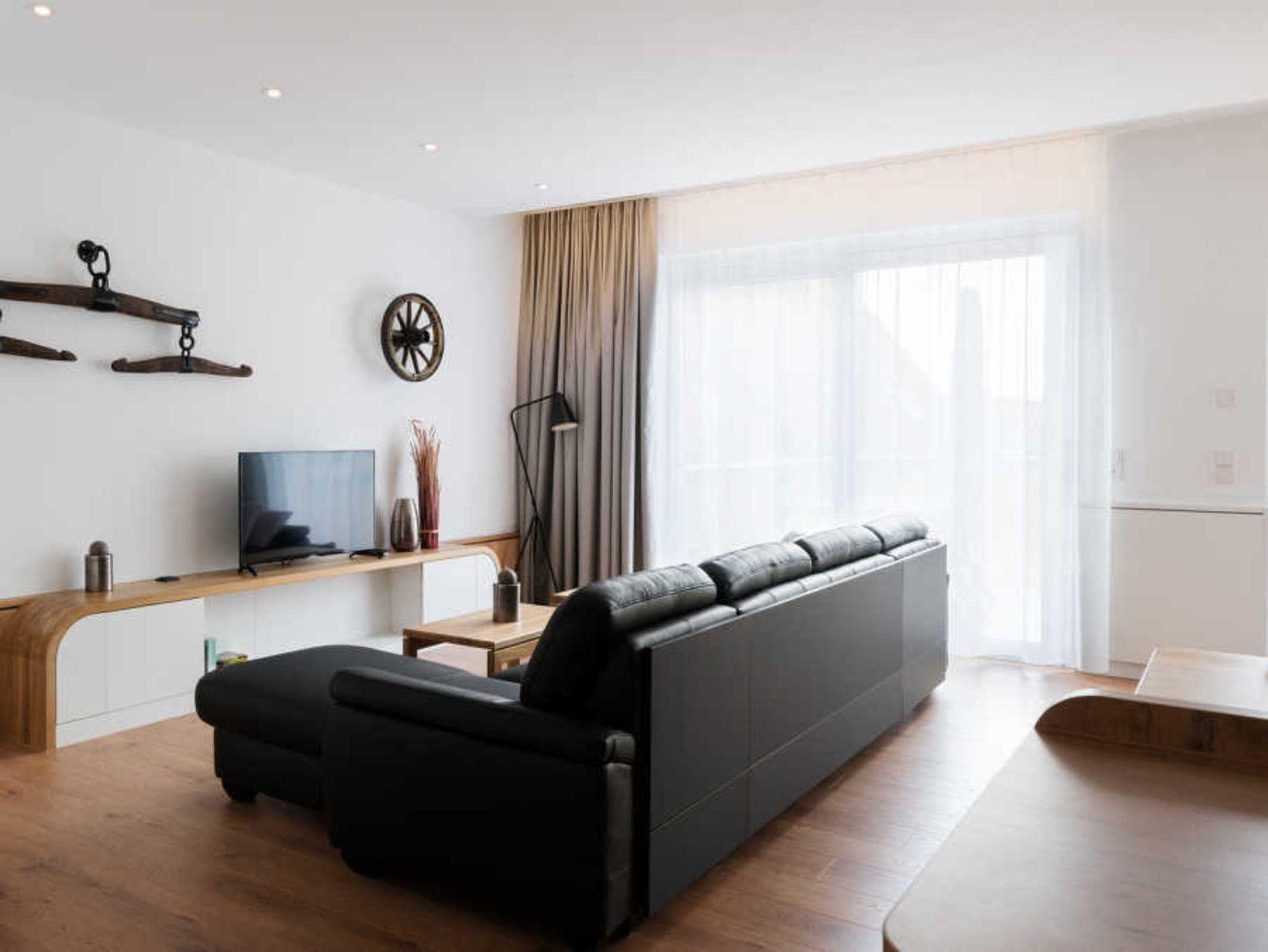 Diese Suite ist auf Anfrage mit Haustier buchbar. Die Suite Stall befindet sich im Erdgeschoss des Hauses und verfügt über zwei Schlafbereiche, ein Bad sowie einen kombinierten Wohn-/Essbereich mit offener Küche. Die große Terrasse: 22 qm läd zum Verweilen ein. Eine Aufbettung für die 5. Person erfolgt im Wohnbereich auf der Couch.