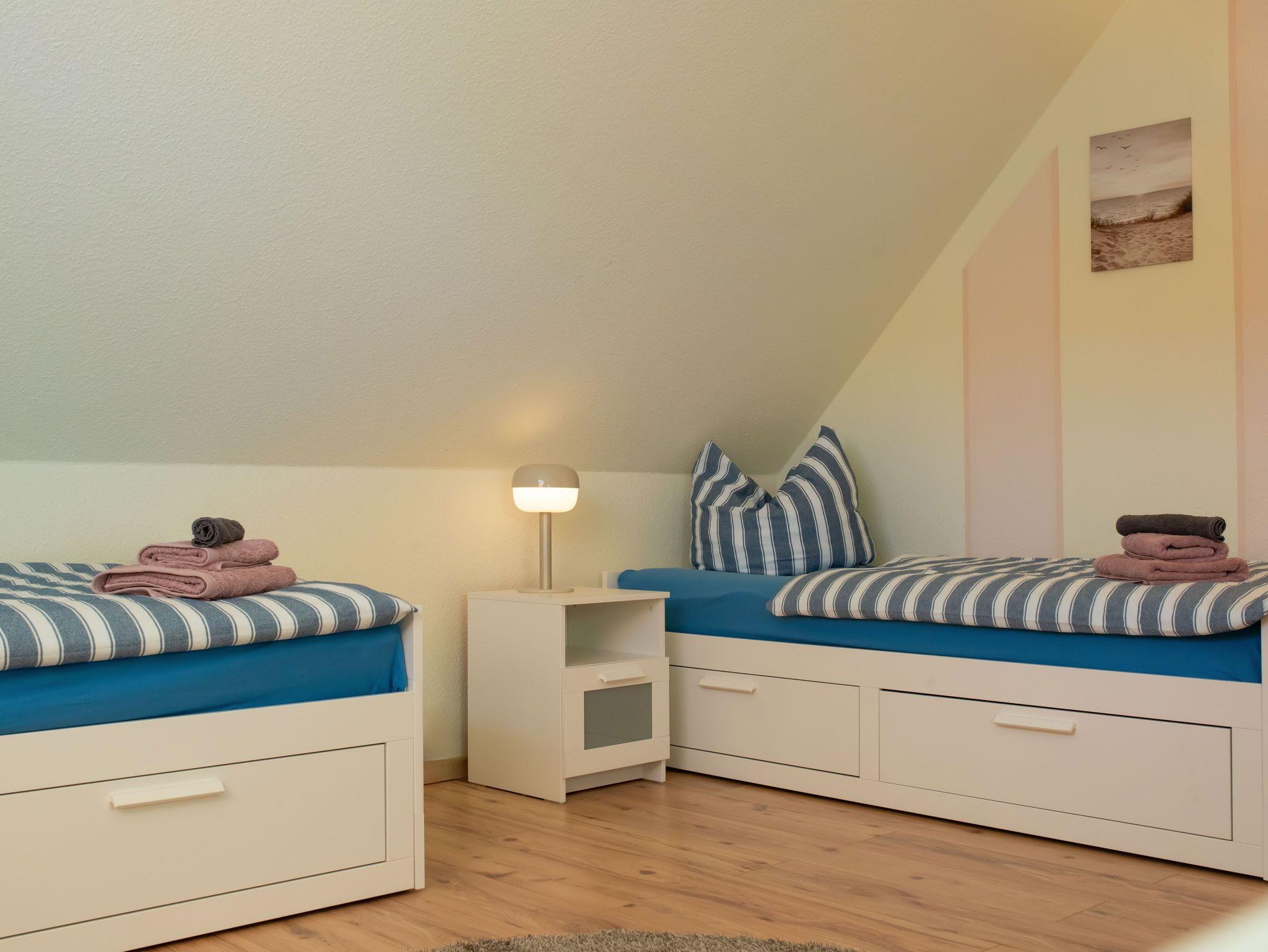 Im Obergeschoss des Hauses befinden sich drei gemütliche Schlafzimmer, die jeweils mit komfortablen Betten ausgestattet. 2 Zimmer verfügen über ein Doppelbett und ein Schlafzimmer über 2 getrennte Einzelbetten, die aber leicht zu einem Doppelbett ausgezogen werden können. Ein großes Badezimmer mit Dusche und Badewanne bietet den Gästen Entspannungsmöglichkeiten nach einem ereignisreichen Tag.