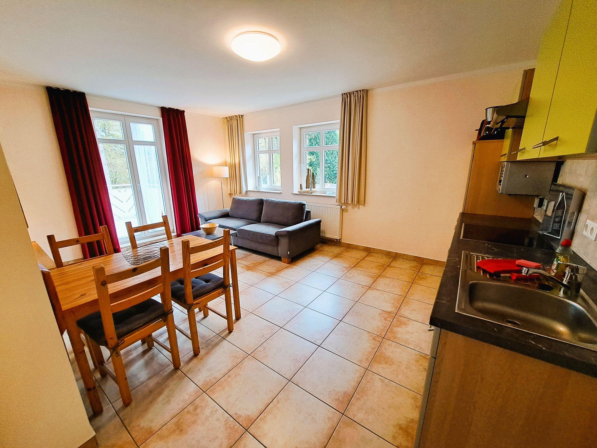 Im modernen Tageslicht-Badezimmer erwartet Sie eine ebenerdig begehbare Dusche, ein Doppelwaschbecken mit Ablage und ein WC. Der offene Wohn- und Kochbereich schafft eine einladende Atmosphäre und ermöglicht den direkten Zugang zum Balkon. Die Einbauküche ist vollständig ausgestattet und verfügt über alle wichtigen technischen Geräte sowie einen Esstisch, an dem Sie Ihre Mahlzeiten genießen können.