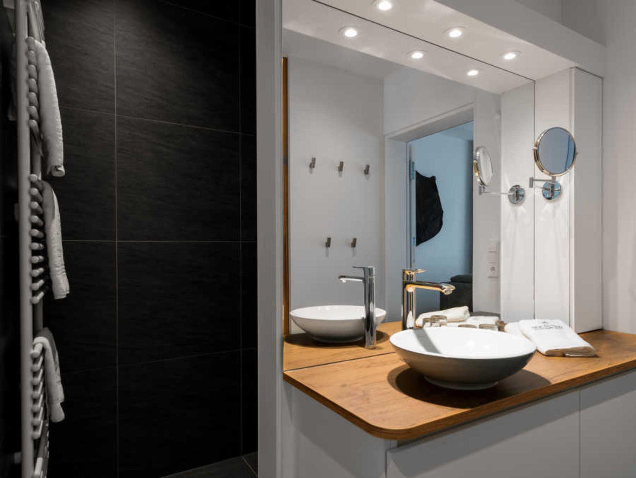 Die Suite Schmied Holstein befindet sich im Obergeschoss des Hauses und verfügt über zwei Schlafbereiche mit jeweils einem Bad en suite sowie einen kombinierten Wohn-/ Essbereich mit offener Küche. Eine Aufbettung für die 5. Person erfolgt im Wohnbereich auf der Couch. Weitere Ausstattungen: Balkon: 22 qm (teilweise Müritzblick Südseite), Nichtraucher, Fußbodenheizung, Sat-TV und Radio, W-LAN, Schreibtisch, komfortables Sofa, modernes Sideboard und gemütlichen Esstisch, Terrasse mit Blick auf den Innenhof, vollausgestattete moderne Küchenzeile mit Backofen, Mikrowelle, Kaffeemaschine, Wasserkocher, Toaster, Kühlschrank mit Eisfach, Cerankochfeld, Geschirrspüler sowie ausreichend Geschirr, Schlafzimmer mit großen Betten und komfortablen Matratzen, ein Tresor für Wertsachen, großzügig geschnittene Bäder mit ebenerdiger Dusche, Haartrockner, Saunatücher und Bademäntel stehen für Hausgäste zur Verfügung.