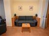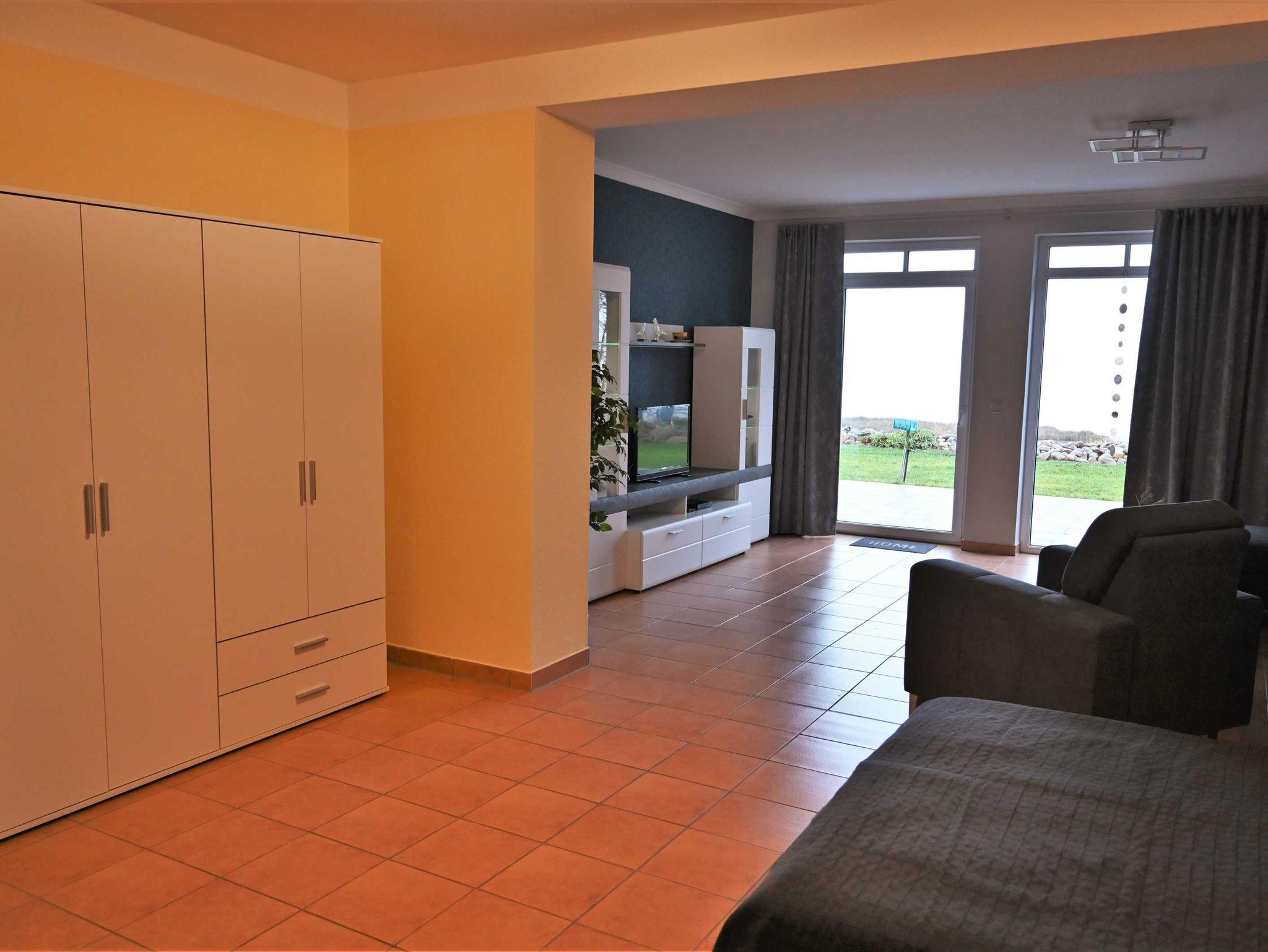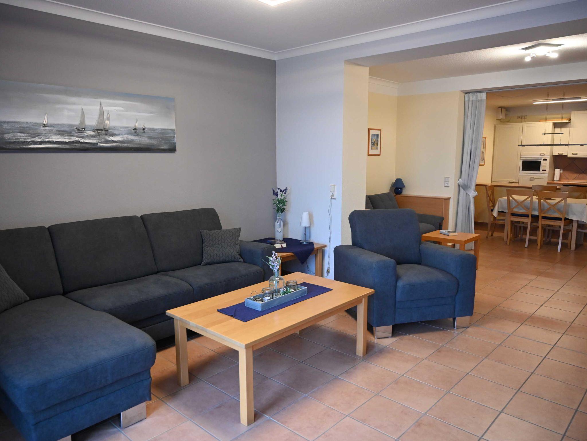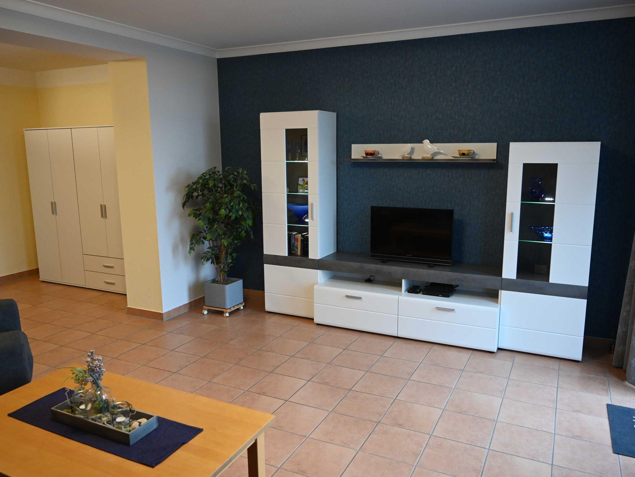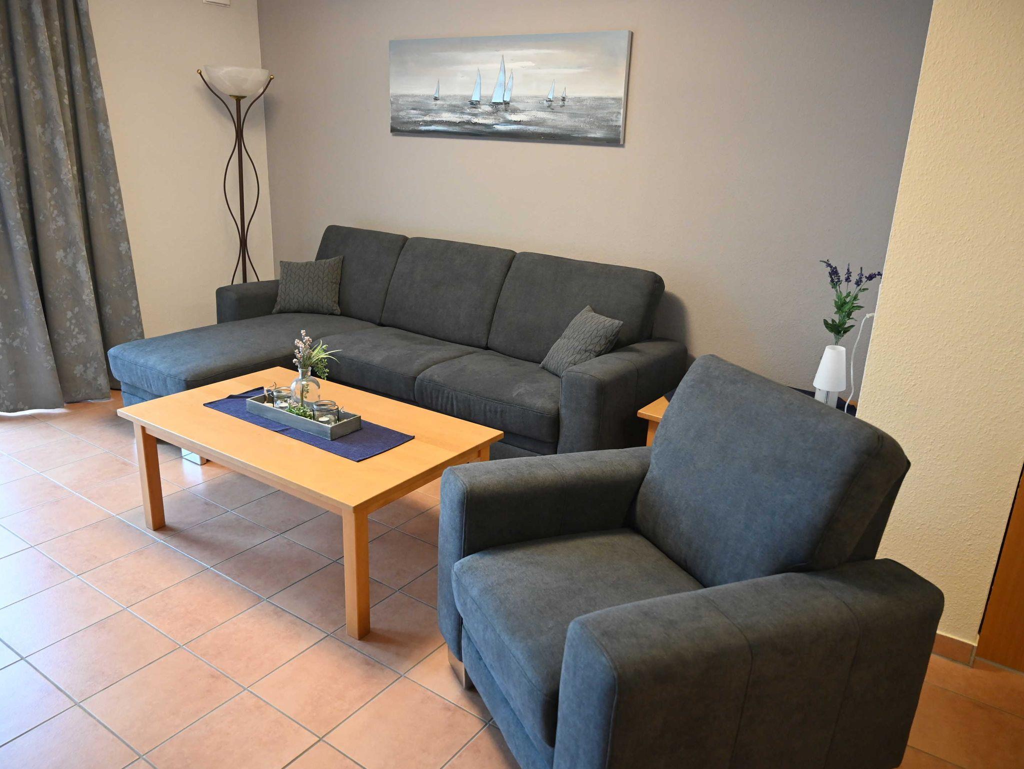 Im Wohnbereich steht eine große Couch, ein Sessel und eine moderne Wohnwand. Ansprechende Dekorationen geben der Ferienwohnung ein Ambiente, in dem Sie sich wohlfühlen werden.