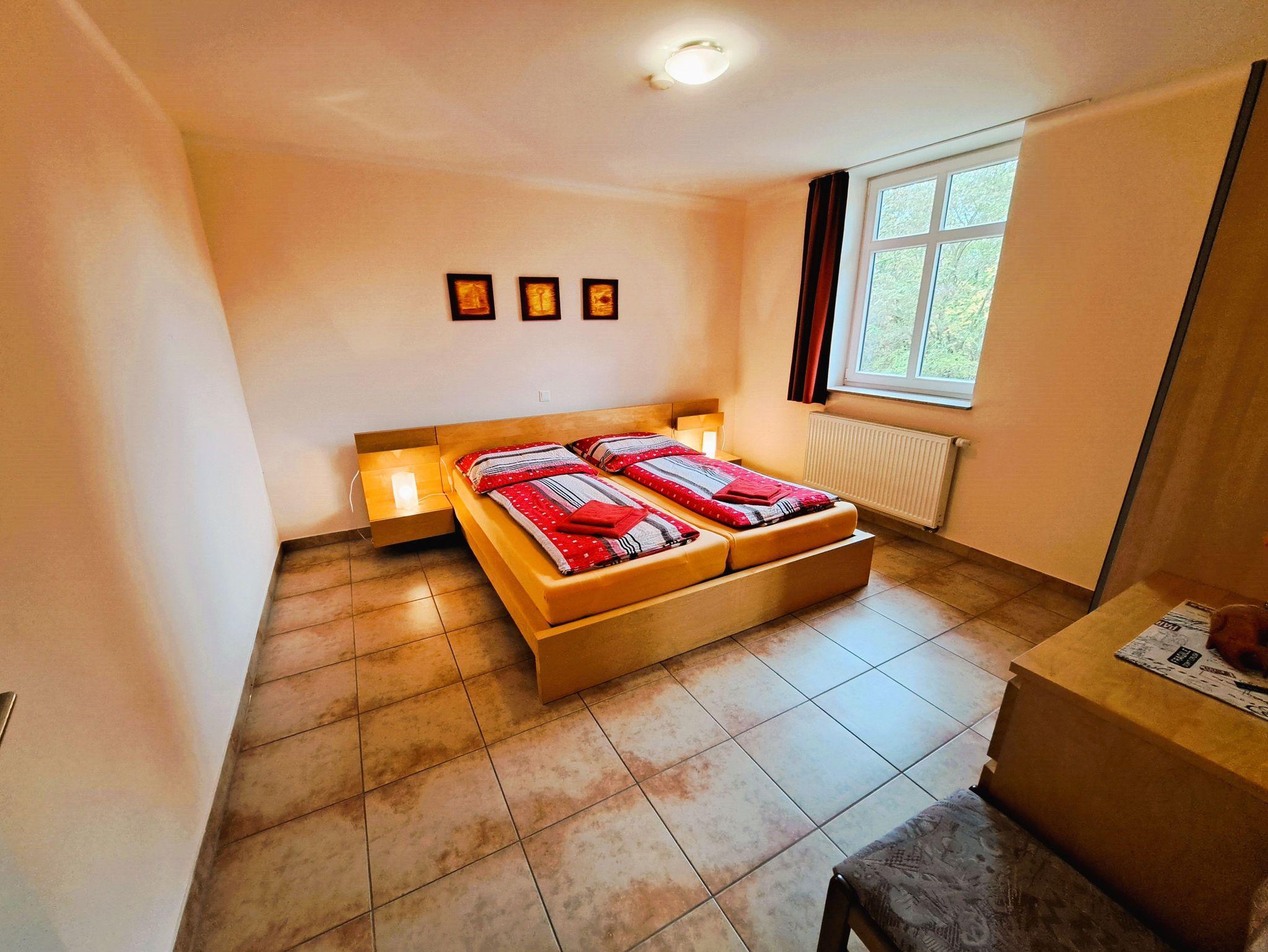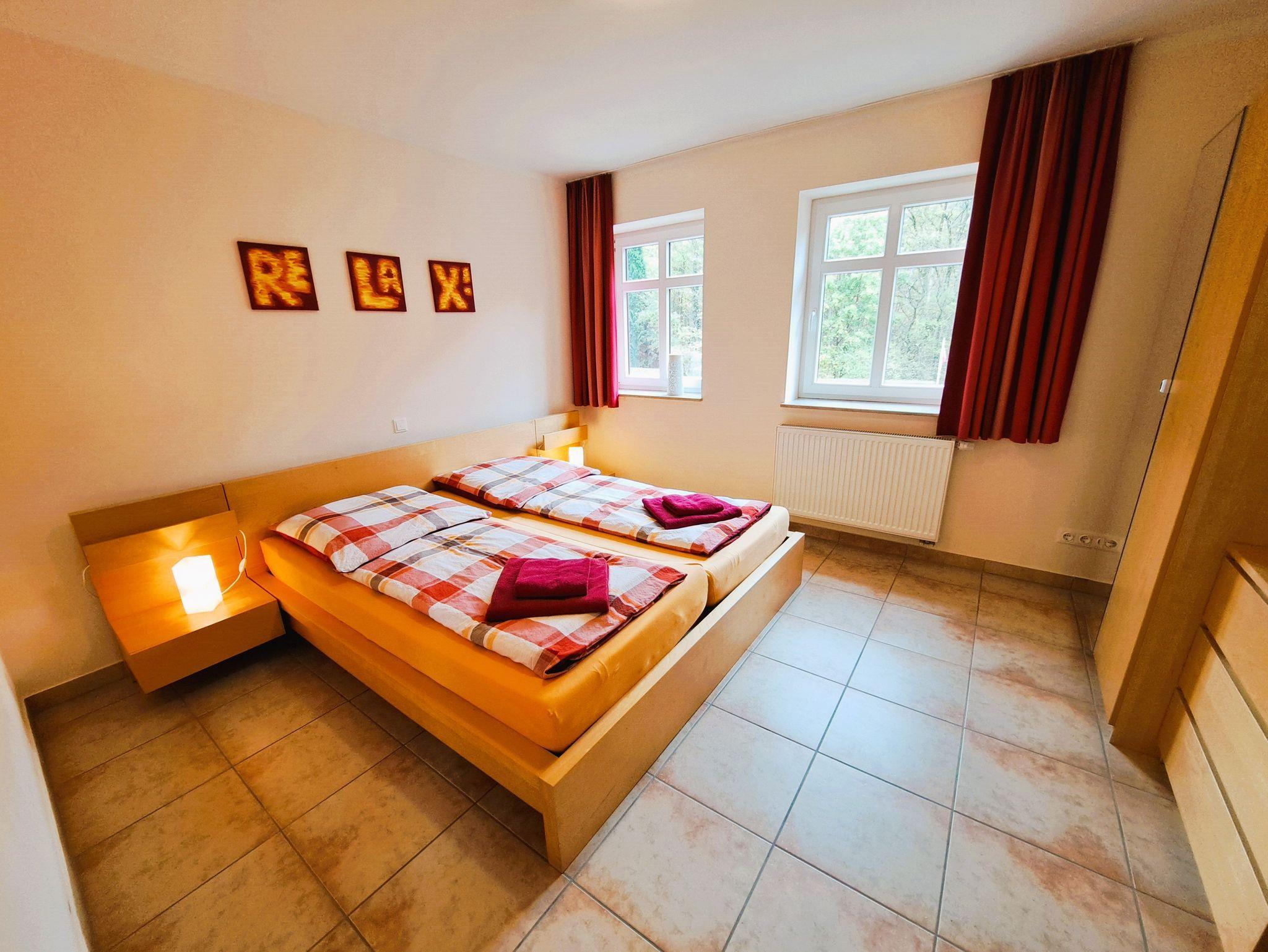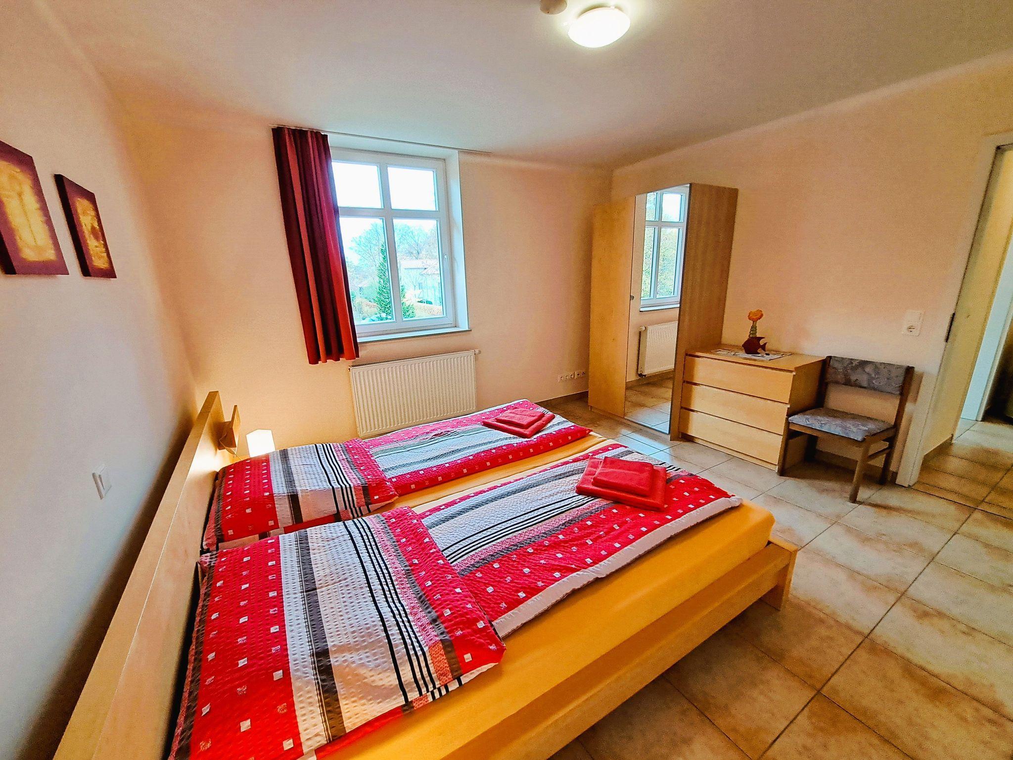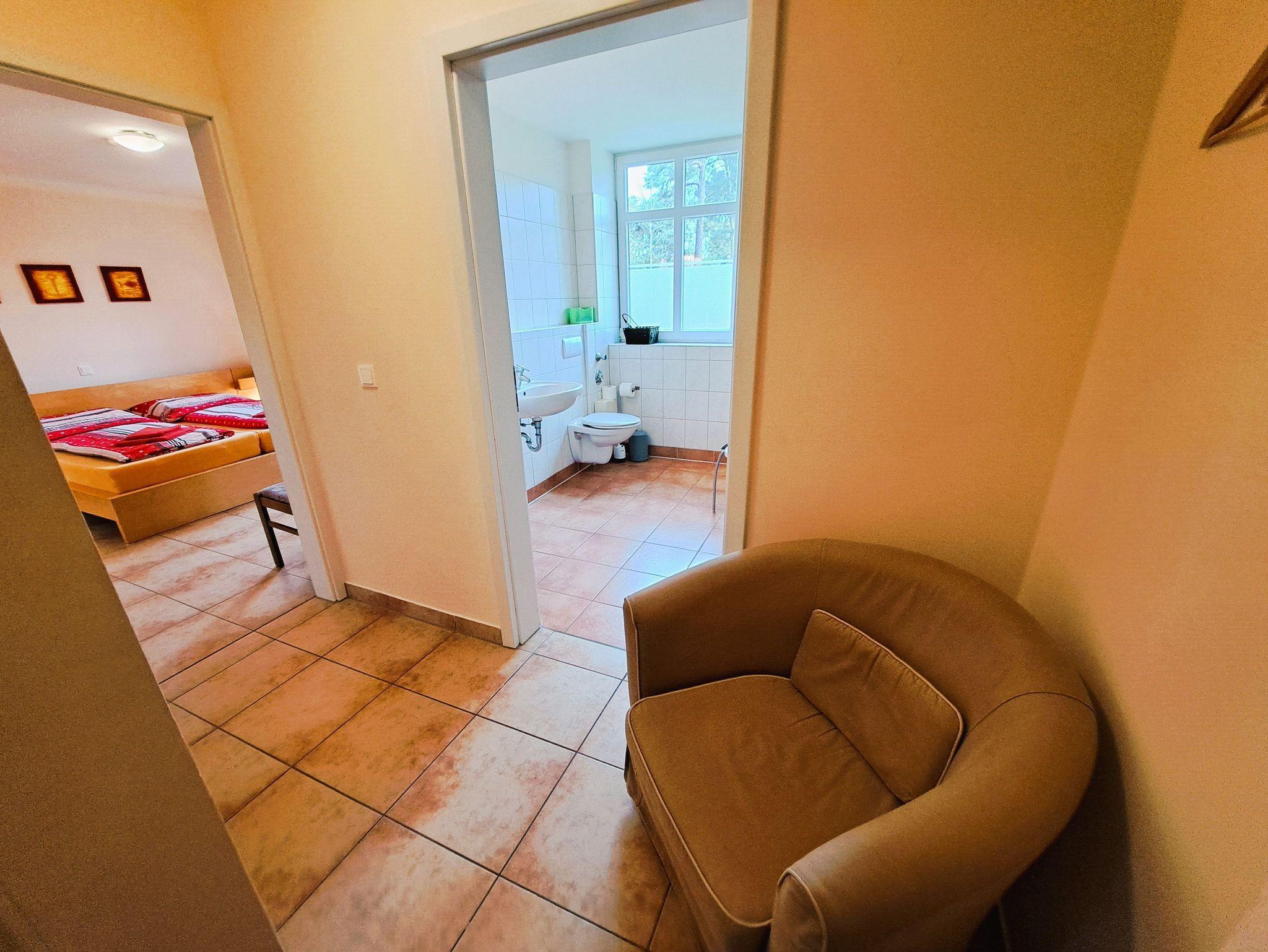 Unsere Ferienwohnung 1 (Westseite)befindet sich im Erdgeschoss und bietet eine gemütliche Terrasse, ideal für entspannte Stunden im Freien. Schon beim Betreten empfängt Sie ein einladender Flur mit Sessel, Garderobe und Schuhablage. Die beiden Schlafzimmer sind jeweils mit einem komfortablen Doppelbett, Nachttischen, Lampen, Wechselschaltern und doppeltürigen Kleiderschränken ausgestattet perfekt für eine erholsame Nachtruhe.