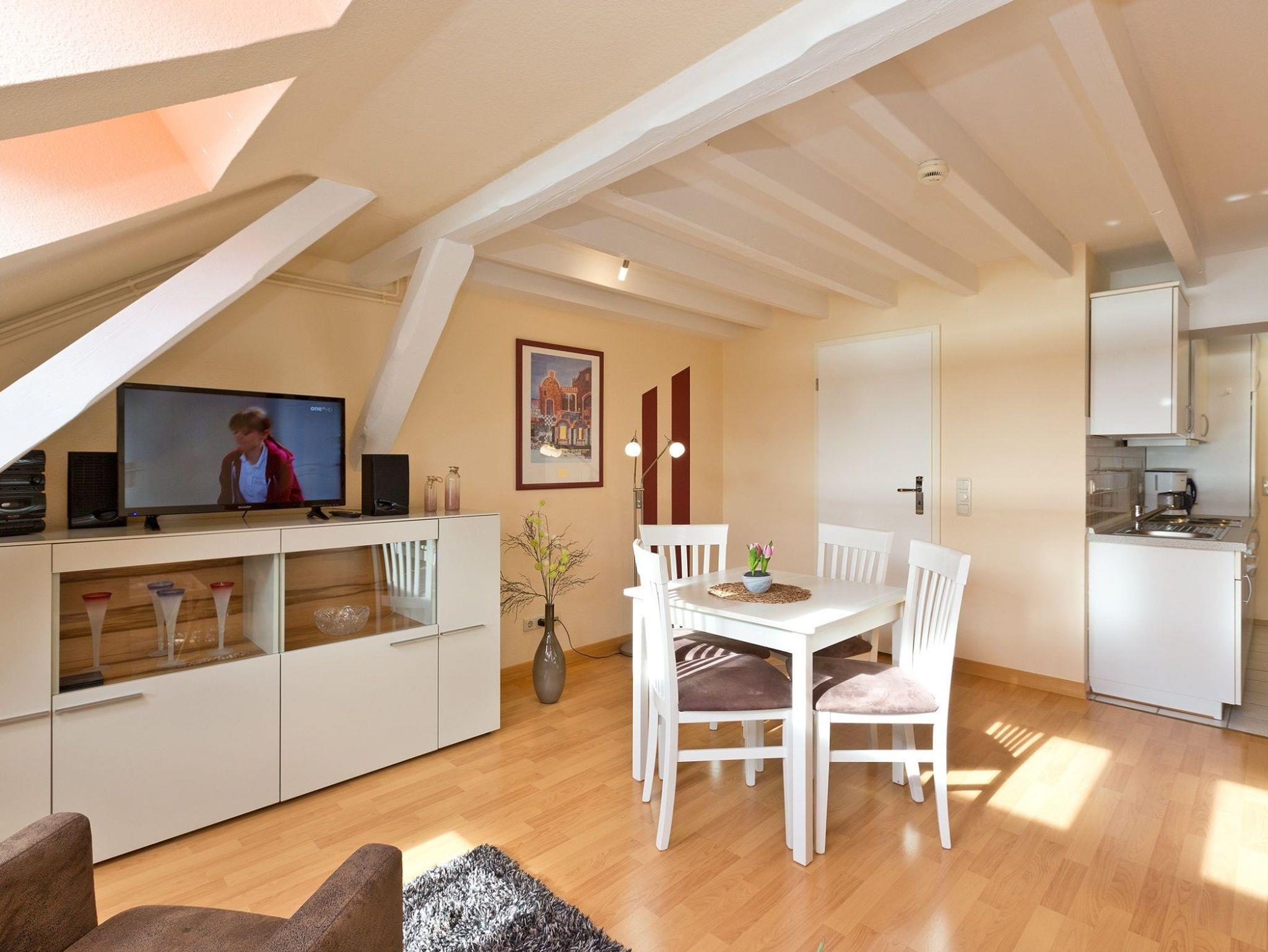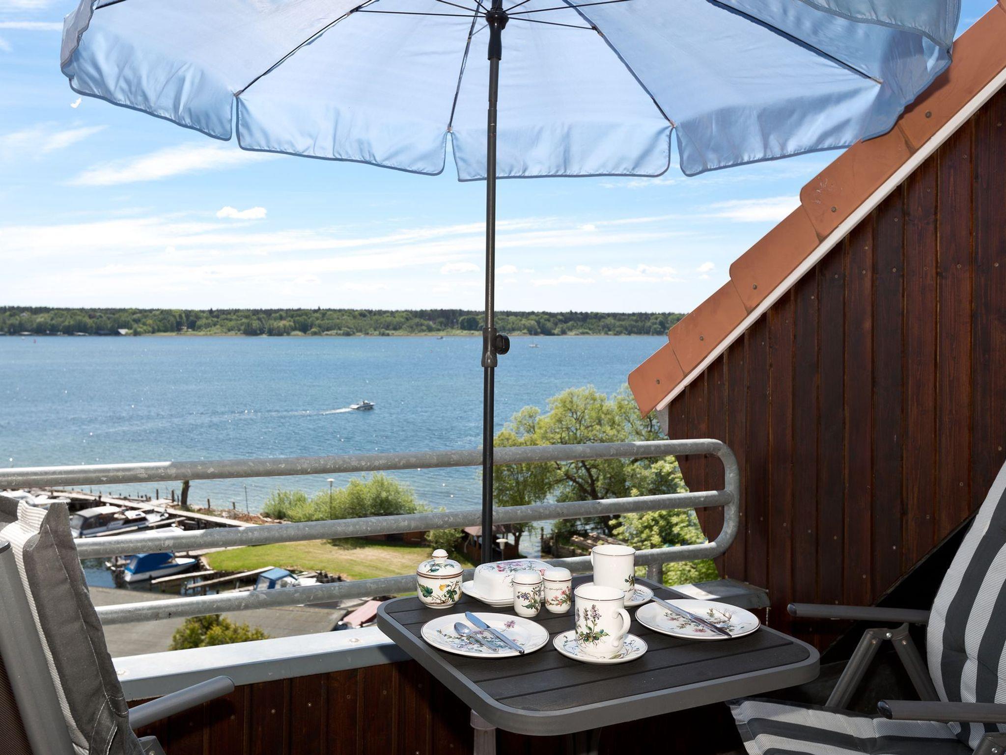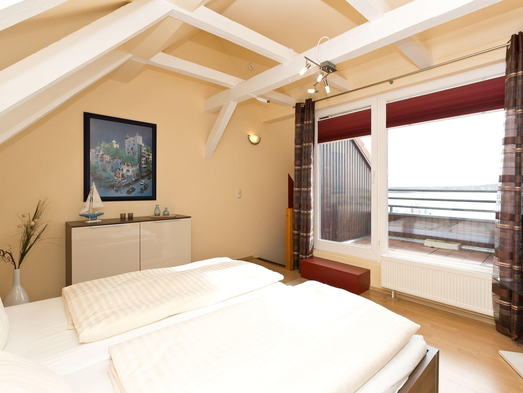 Das Appartement befindet sich in der 4. Etage und besteht aus einem Wohnraum mit integrierter Küchenzeile, einem Doppelbettschlafzimmer. Von hier erreichen Sie über die Treppe die obere Etage und den Zugang zur möblierten Loggia, von welcher Sie den weiten Blick über die Müritz genießen können. Das Wohnzimmer ist modern mit Schlafsofa, Sessel, CD Radio,TV und Esstisch eingerichtet. Die Küchenzeile verfügt über Kaffeemaschine, Wasserkocher, Toaster, Elektroherd, Backofen, Kühlschrank, Geschirr und Besteck.