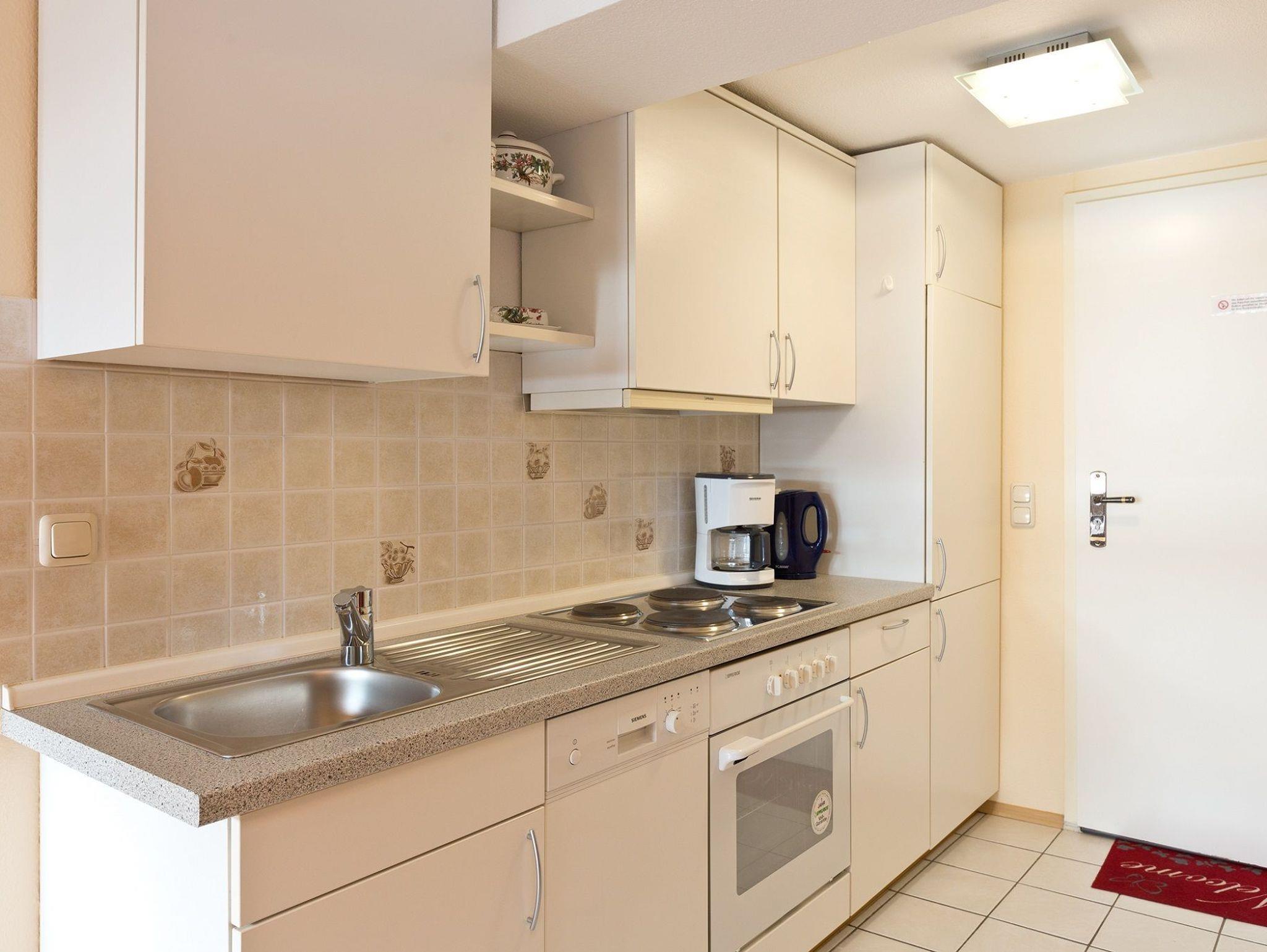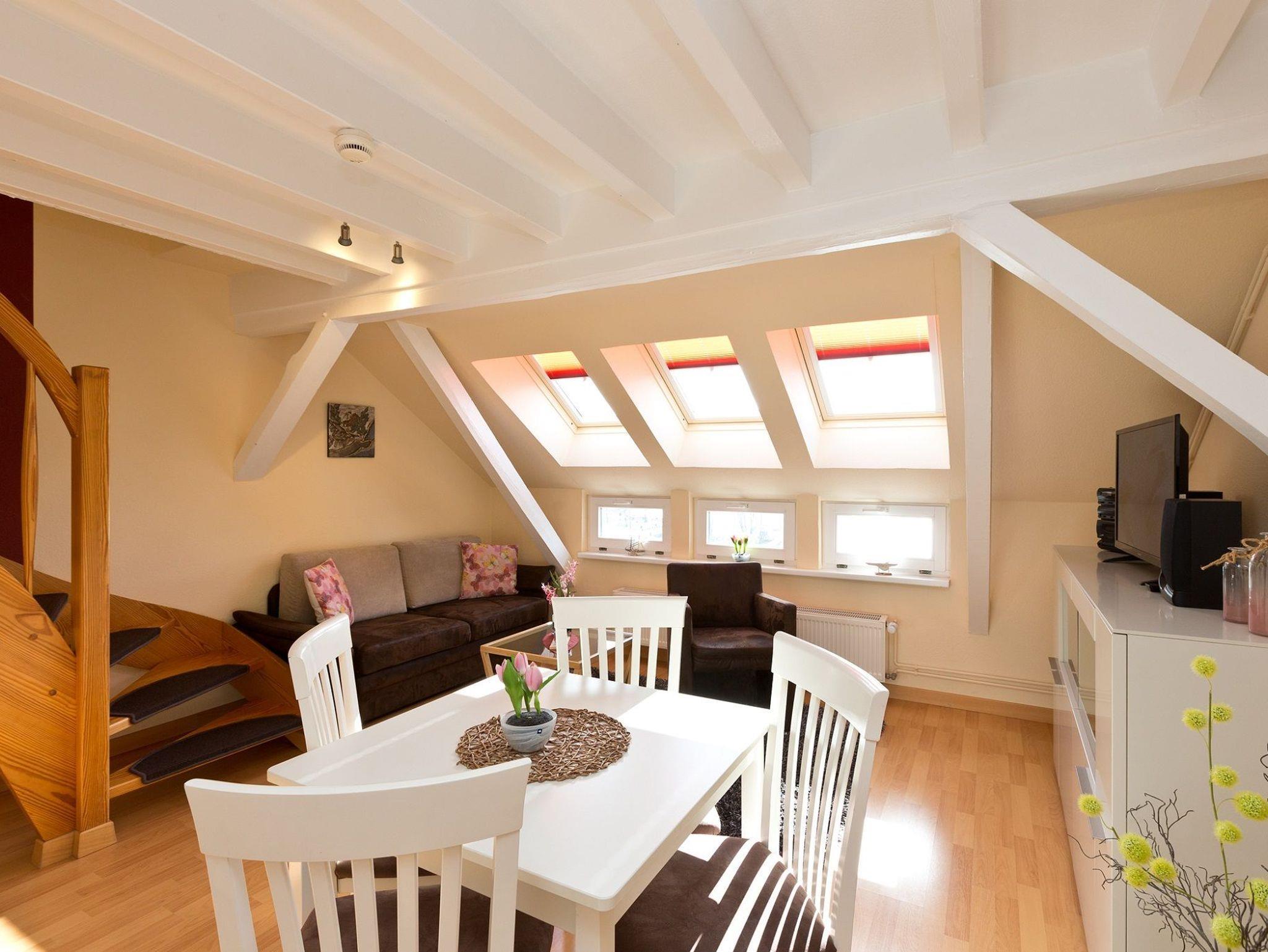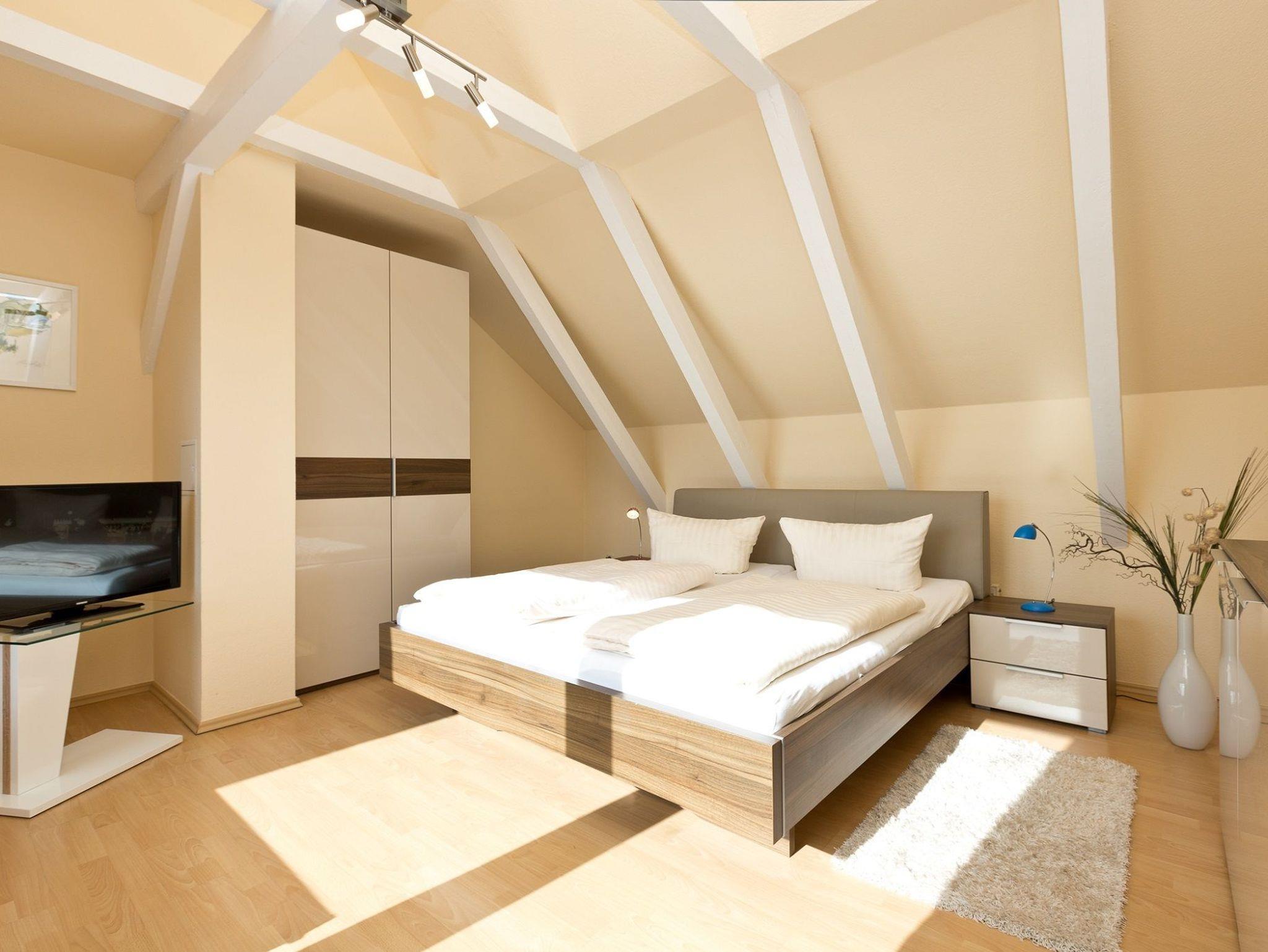 Das Appartement befindet sich in der 4. Etage und besteht aus einem Wohnraum mit integrierter Küchenzeile, einem Doppelbettschlafzimmer. Von hier erreichen Sie über die Treppe die obere Etage und den Zugang zur möblierten Loggia, von welcher Sie den weiten Blick über die Müritz genießen können. Das Wohnzimmer ist modern mit Schlafsofa, Sessel, CD Radio,TV und Esstisch eingerichtet. Die Küchenzeile verfügt über Kaffeemaschine, Wasserkocher, Toaster, Elektroherd, Backofen, Kühlschrank, Geschirr und Besteck.