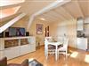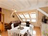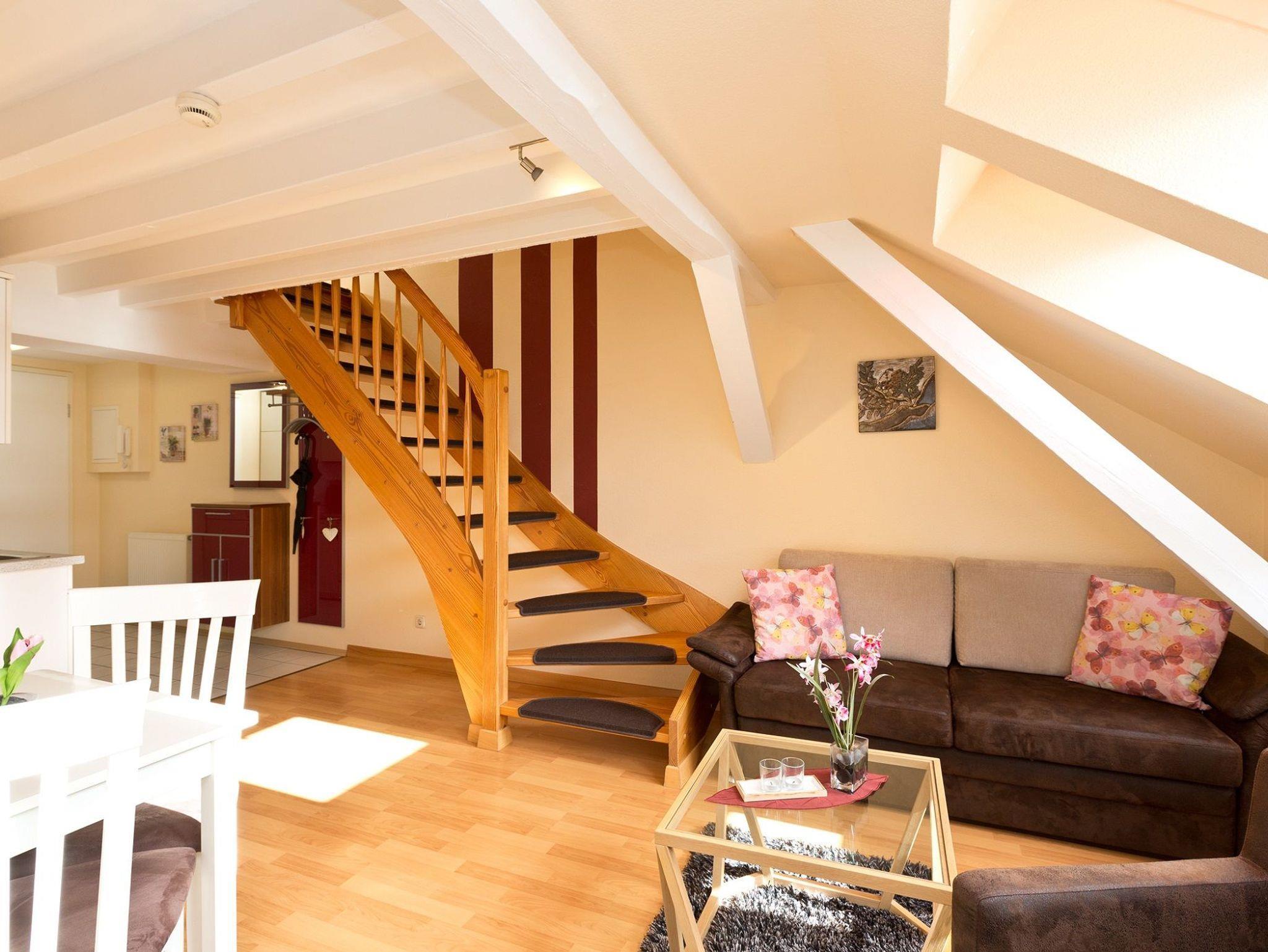 Das Appartement befindet sich in der 4. Etage und besteht aus einem Wohnraum mit integrierter Küchenzeile, einem Doppelbettschlafzimmer. Von hier erreichen Sie über die Treppe die obere Etage und den Zugang zur möblierten Loggia, von welcher Sie den weiten Blick über die Müritz genießen können. Das Wohnzimmer ist modern mit Schlafsofa, Sessel, CD? Radio,TV und Esstisch eingerichtet. Die Küchenzeile verfügt über Kaffeemaschine, Wasserkocher, Toaster, Elektroherd, Backofen, Kühlschrank, Geschirr und Besteck.