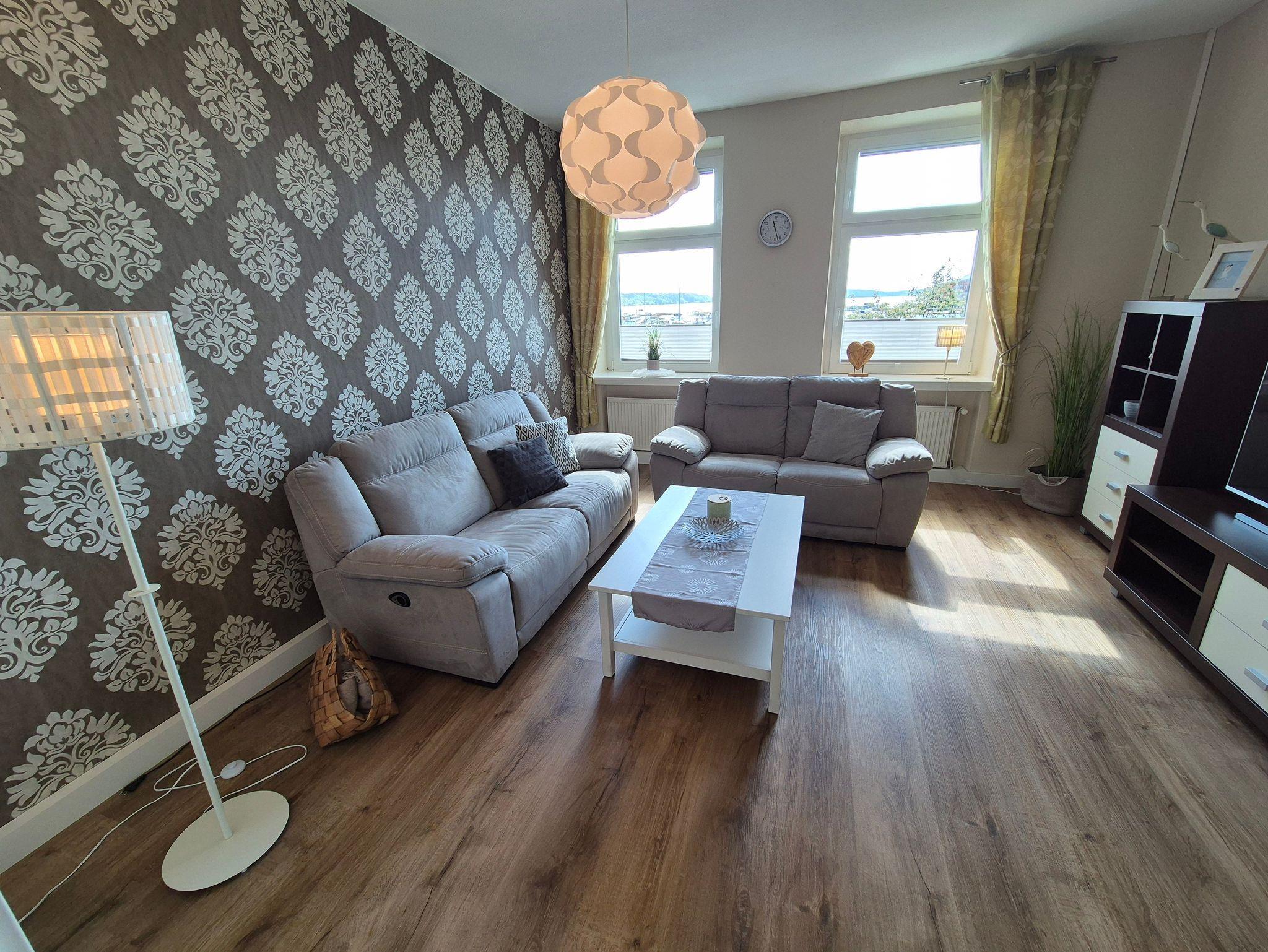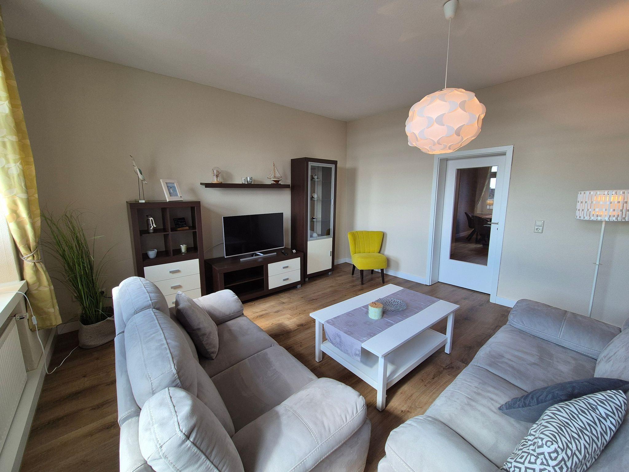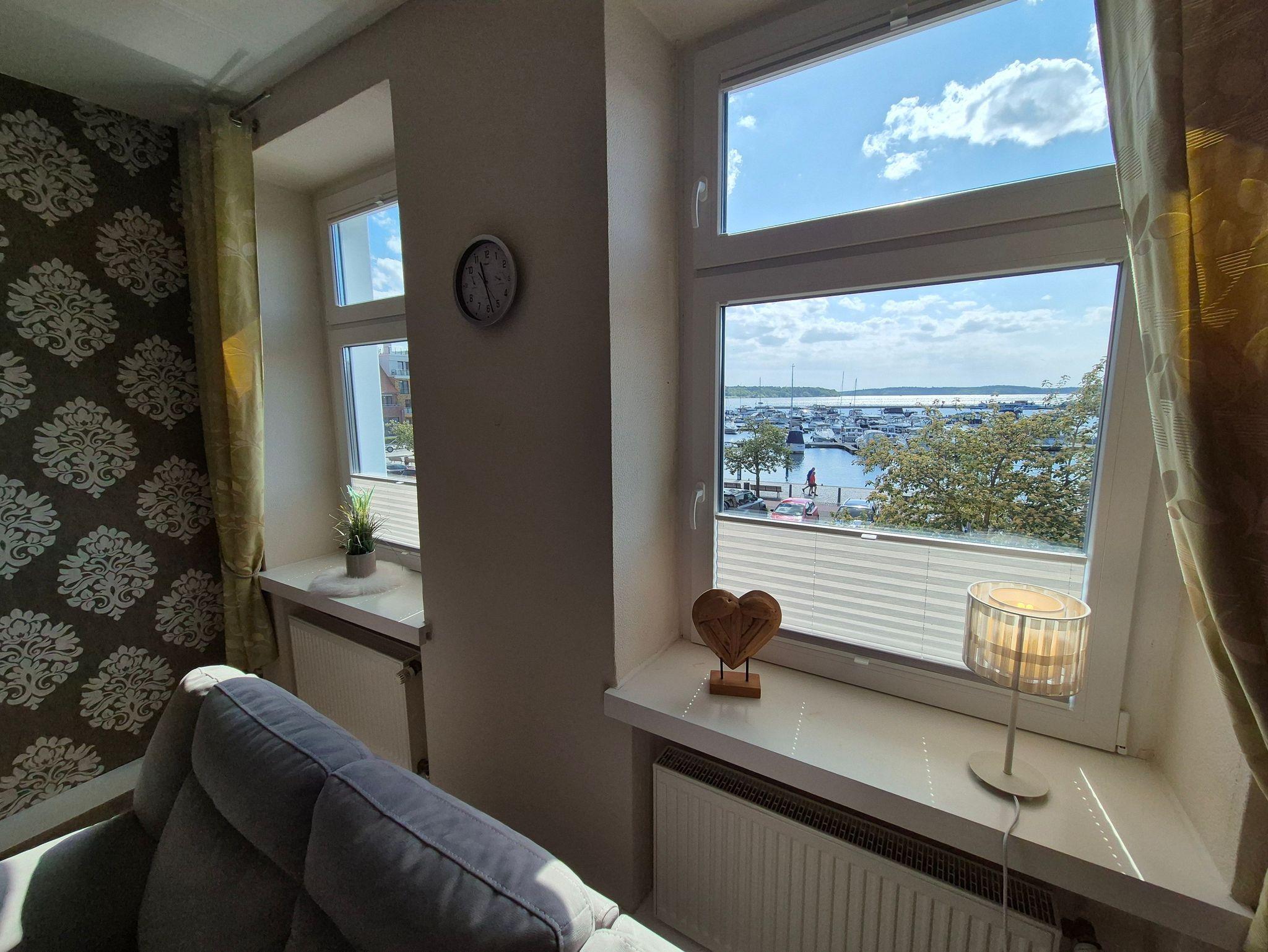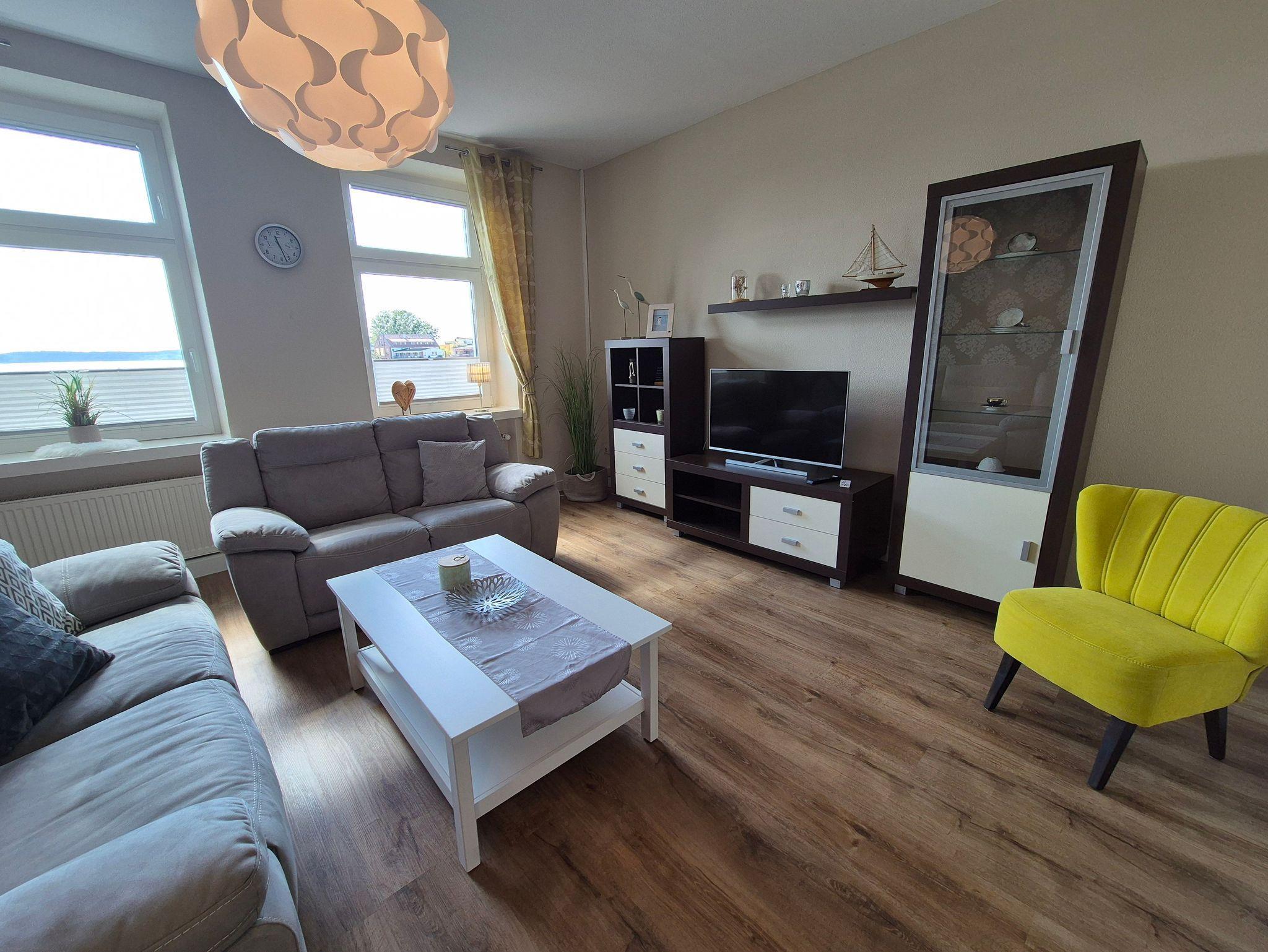 Im Wohnzimmer erwartet Sie eine komfortable Couchlandschaft, wo Sie entspannen und den Panoramablick über das Hafengelände, unseren schönen Müritzsee und die historische Altstadt genießen können. Hier finden Sie auch einen Fernseher für gemütliche Abende.