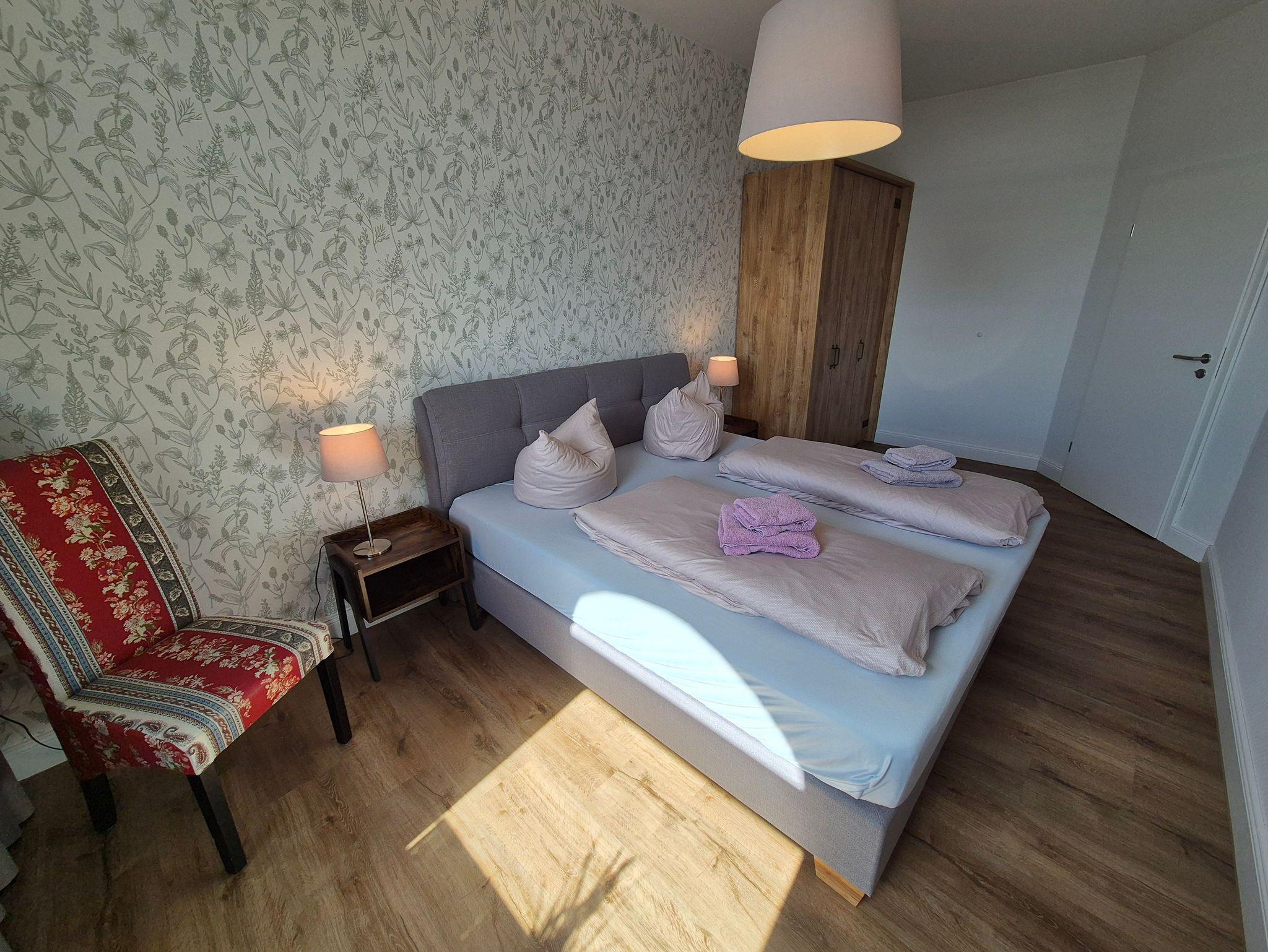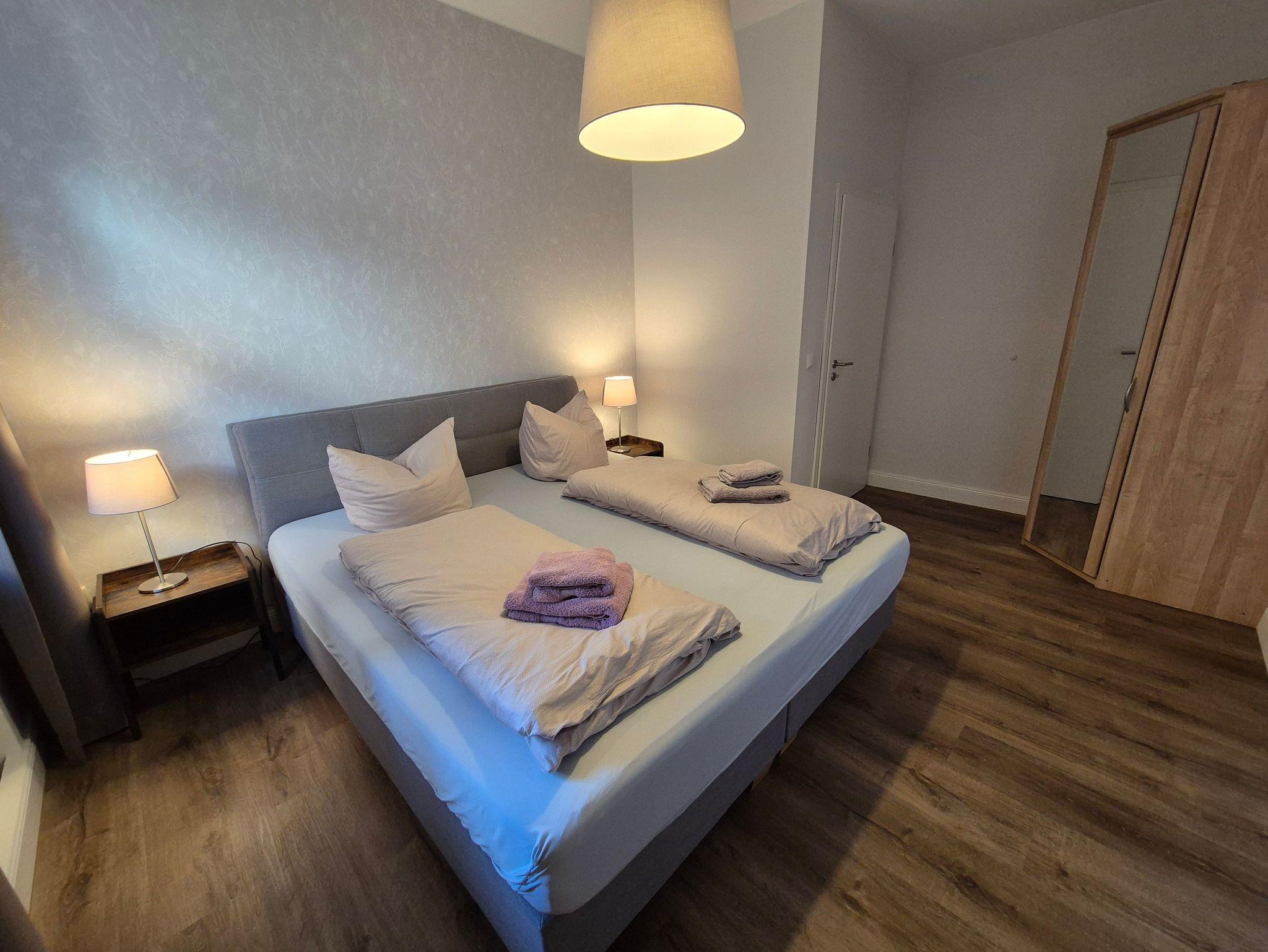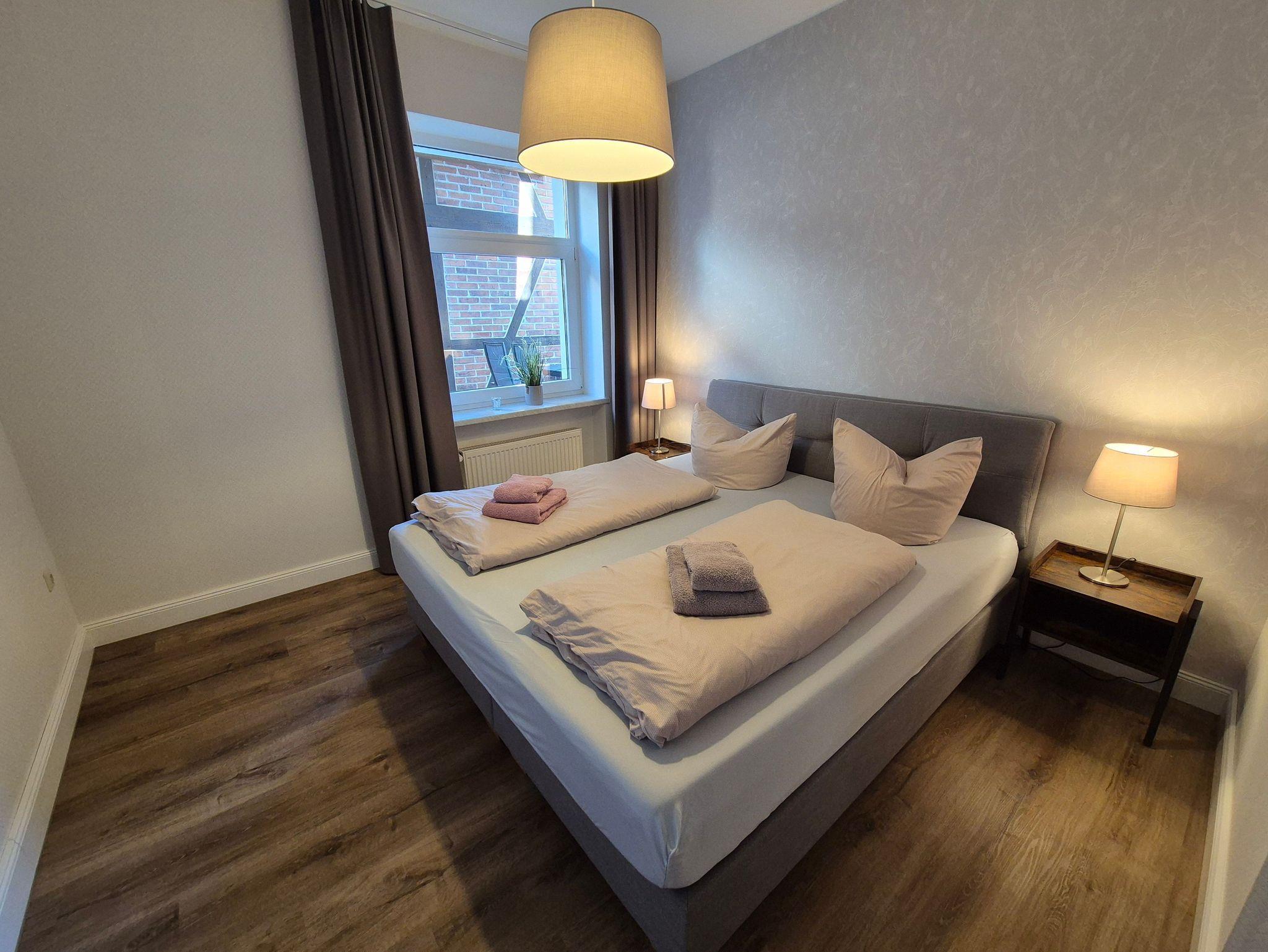 Zwei Schlafzimmer erwarten Sie in dieser Wohnung. Ein Schlafzimmer bietet Ihnen einen herrlichen Blick über den Hafen und ist mit einem gemütlichen Doppelbett sowie einem geräumigen Kleiderschrank ausgestattet. Das andere Schlafzimmer bietet Blick über den Balkon zur Hofseite und ist ebenfalls mit einem Doppelbett und einem Kleiderschrank eingerichtet.