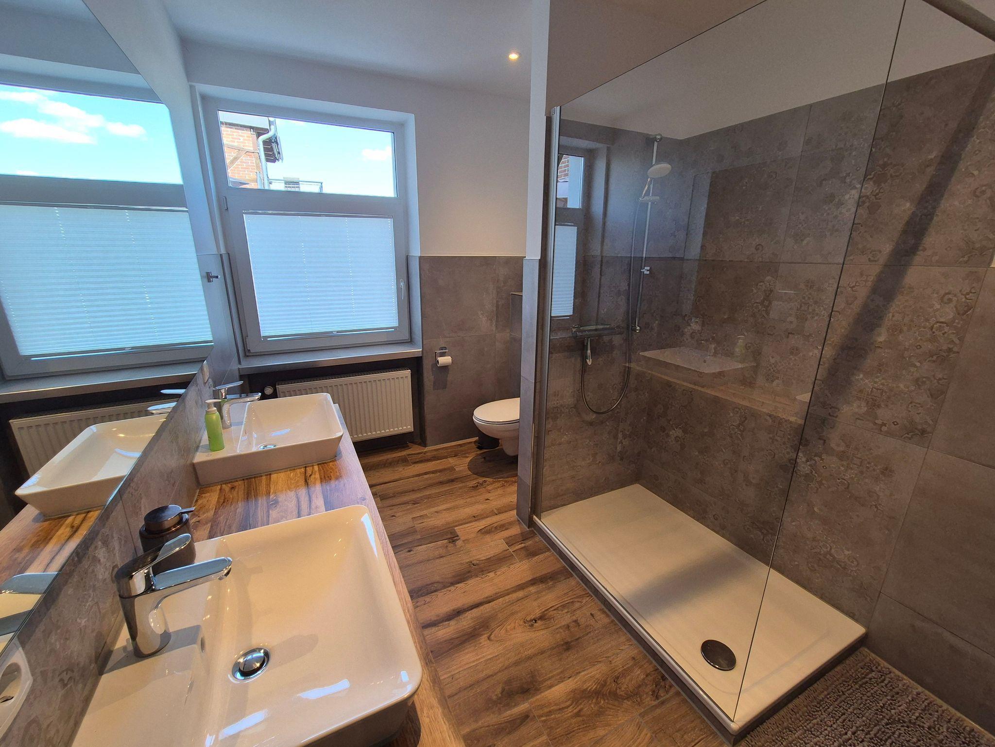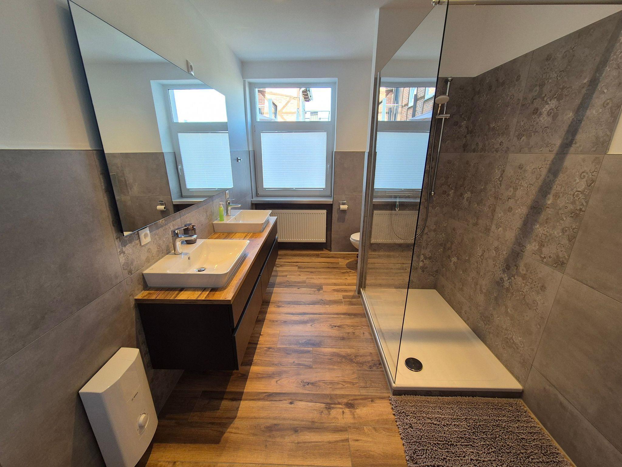 Das Tageslichtbadezimmer bietet Ihnen eine begehbare Dusche, einen Waschtisch und ein WC für Ihren Komfort.