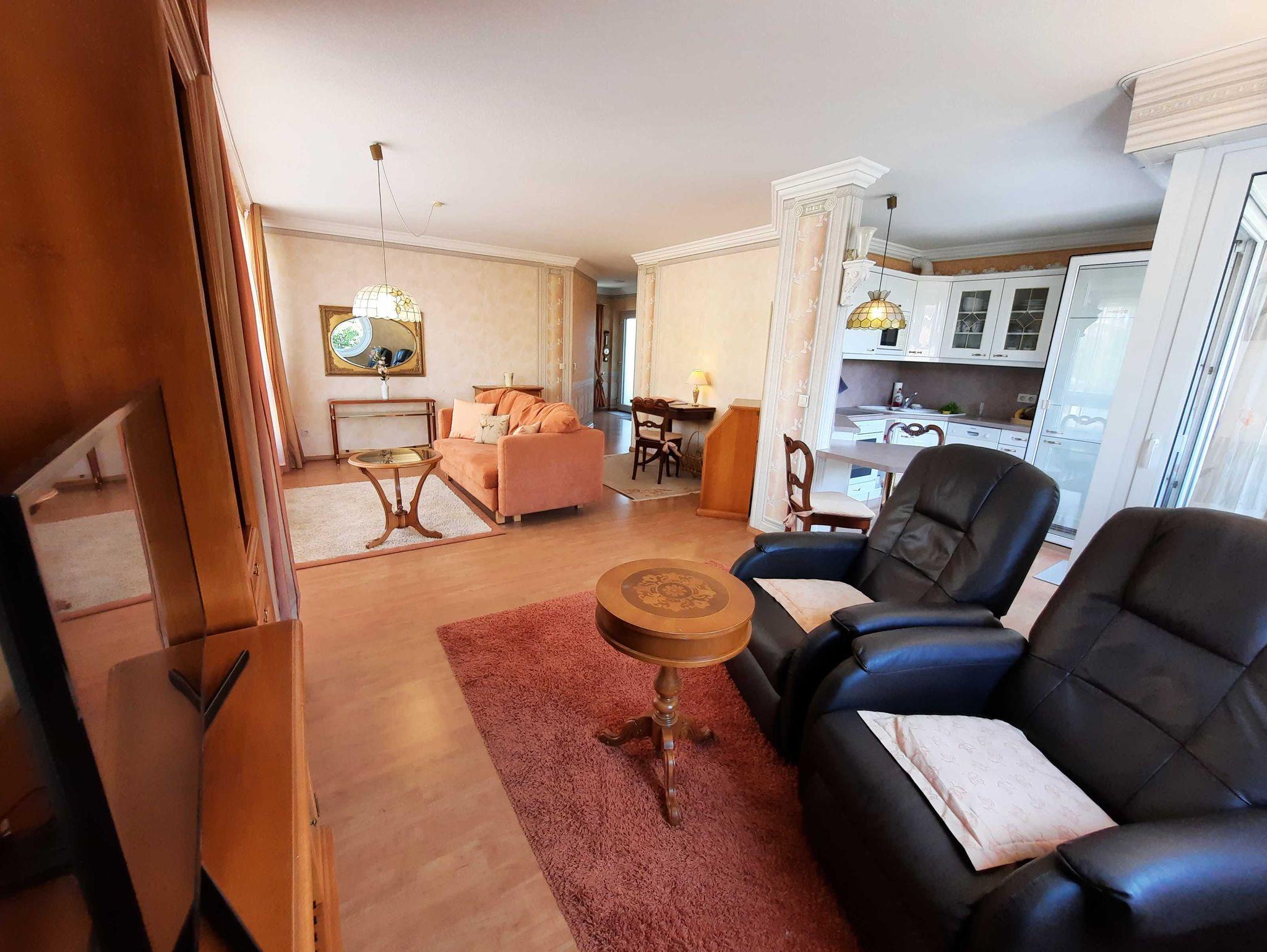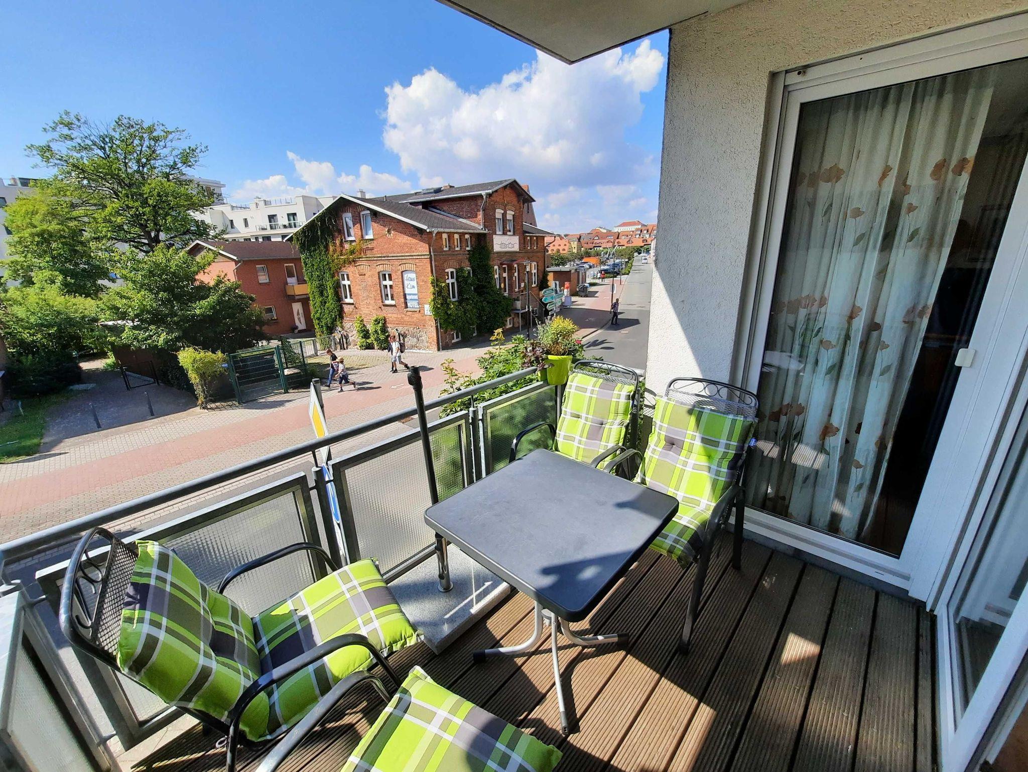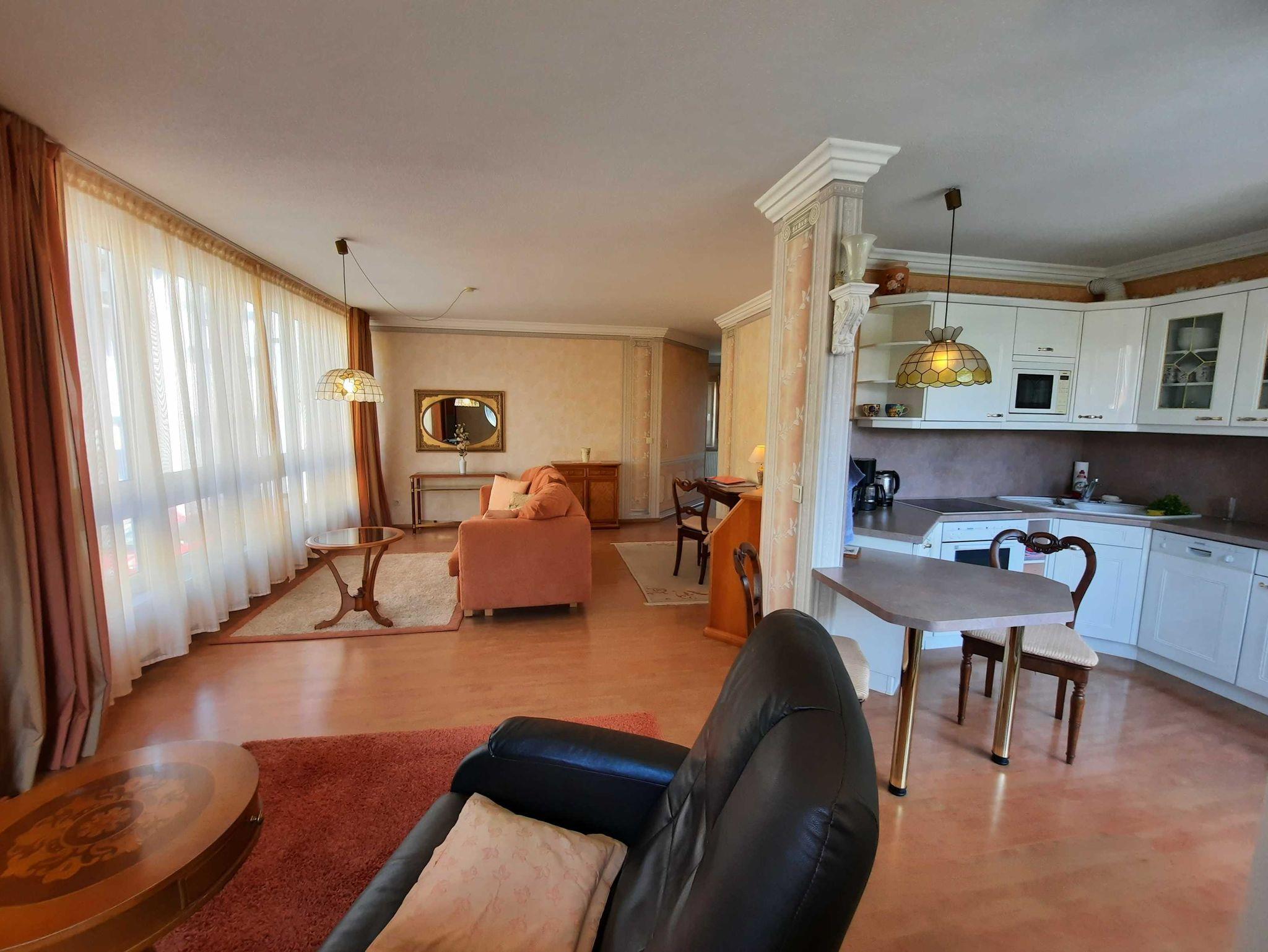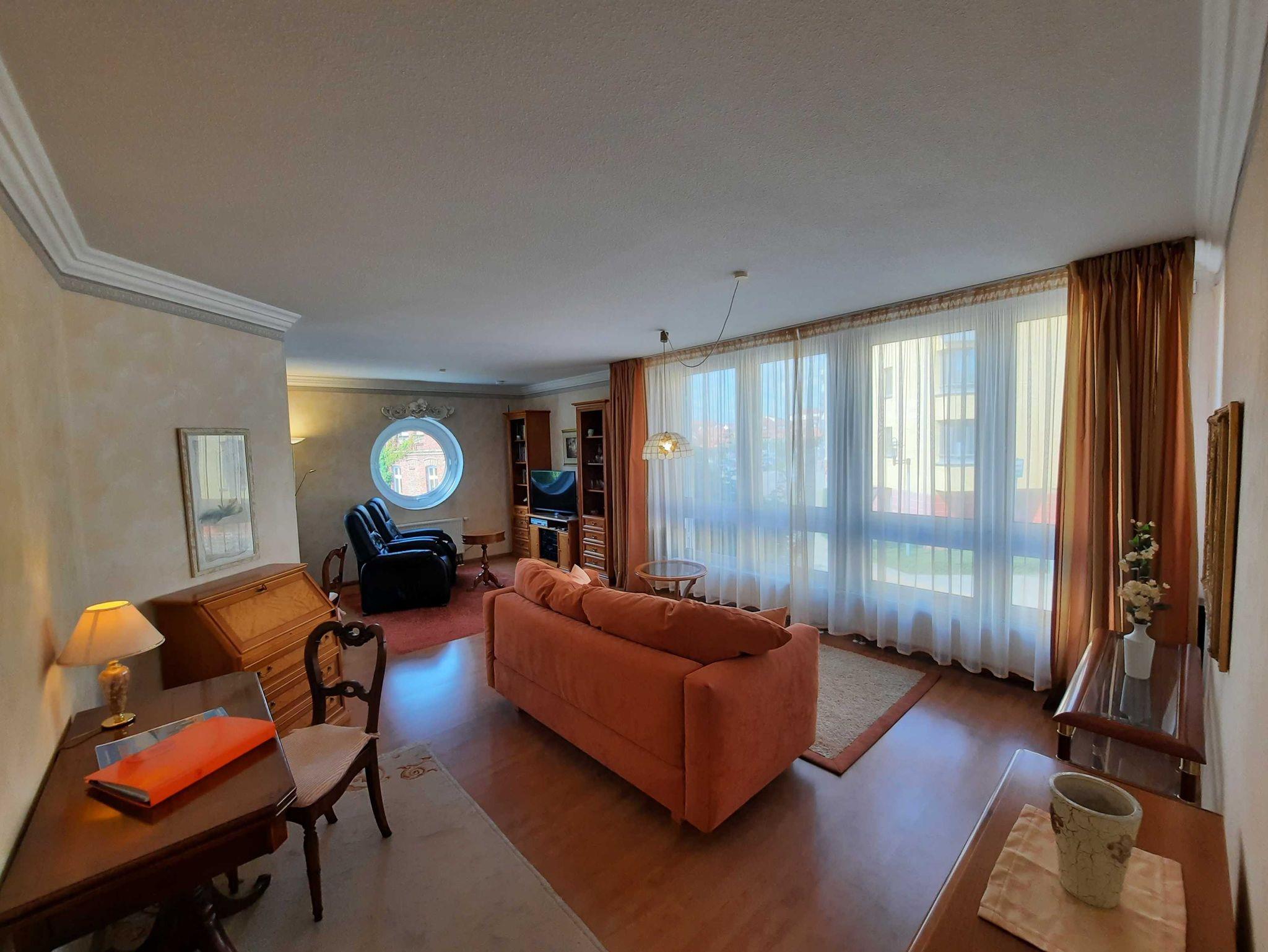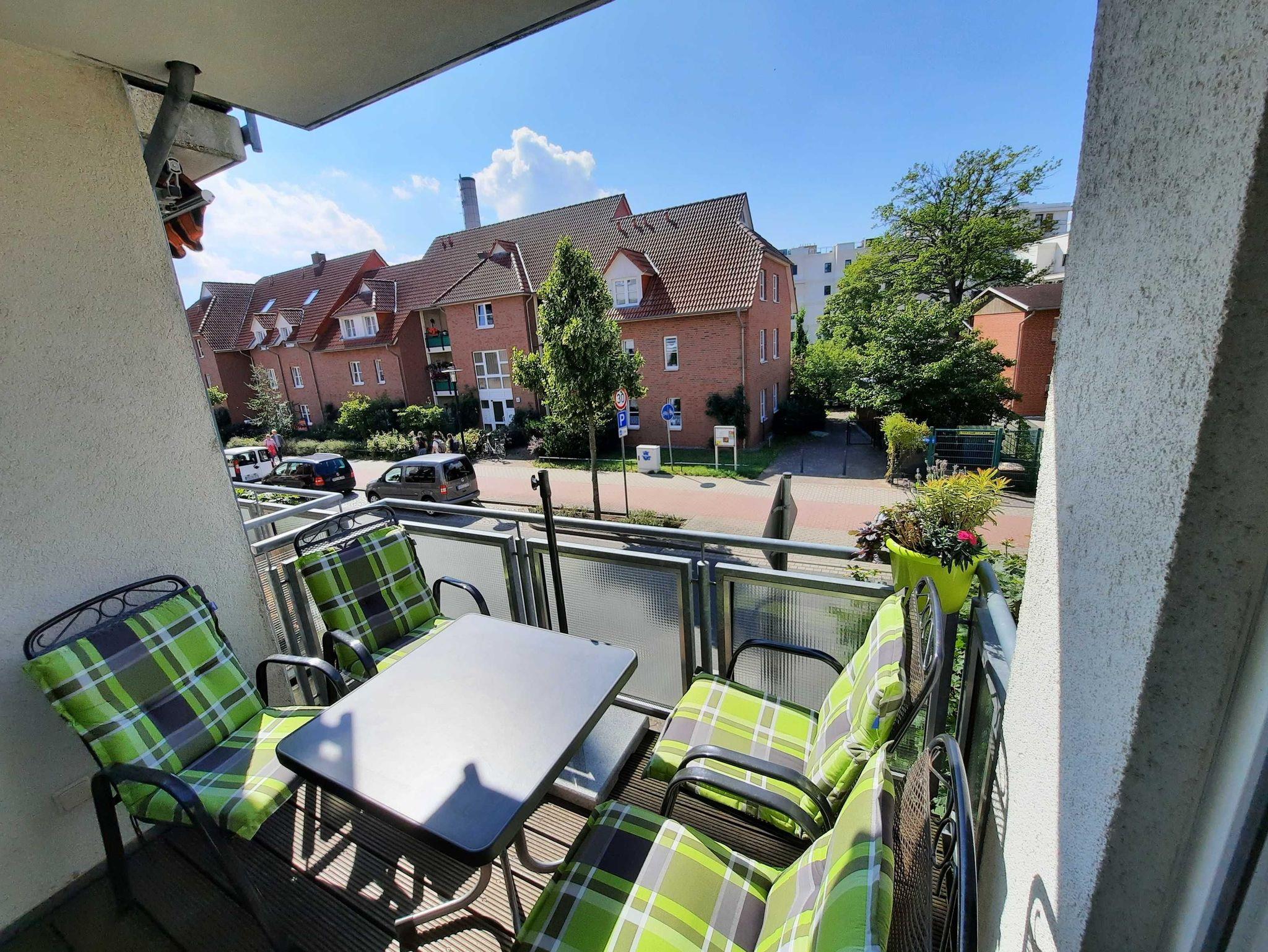 Unsere Hafensuite-Waren bietet Ihnen auf knapp 60 qm ein helles, geräumiges Wohnzimmer mit Couch, FlachTV, Schreibtisch und Schrankmöbeln mit Blick auf das Panoramafenster. Die vollständige ausgestattete Einbauküche ist offen zum Wohnraum mit Esstisch und Zugang zum Balkon. Das Schlafzimmer empfängt Sie mit Doppelboxspringbett, Nachttisch und Kleiderschrank. Das Badezimmer verfügt über eine Duschkabine, Waschtisch und WC.