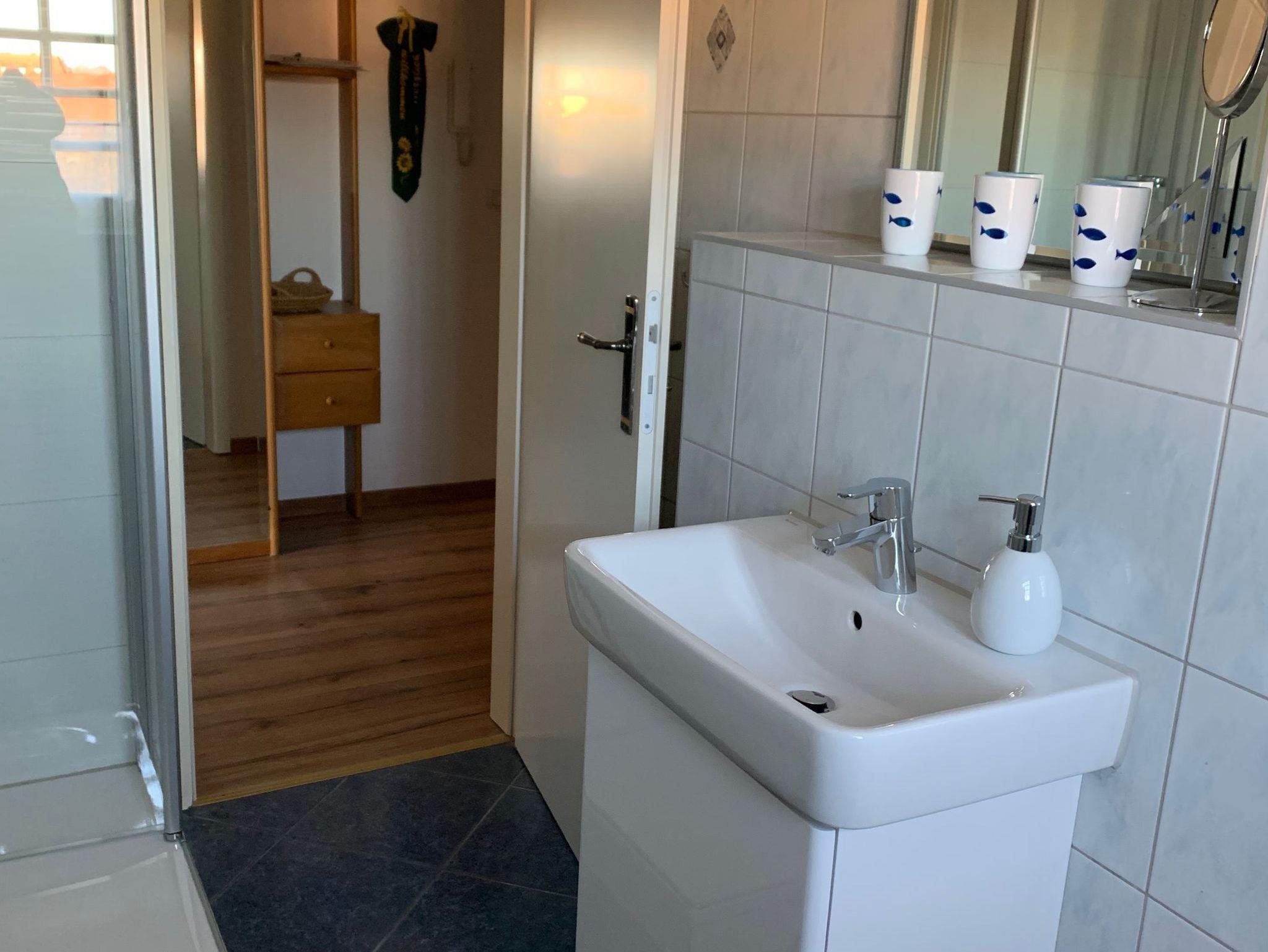 Das helle geflieste Tageslicht-Bad verfügt über eine Dusche, einen Waschtisch sowie genügend Stauraum. Eine Waschmaschine steht Ihnen hier zur Verfügung.