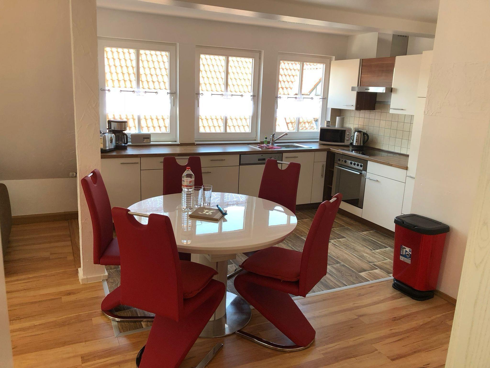 Das Apartment 3 liegt im zweiten Obergeschoss eines Apartmenthauses. Sie betreten die Ferienwohnung in einem hellen Flur, von dem die anderen Räume jeweils abgehen. Im Wohnzimmer hält eine große Wohnlandschaft ausreichend viel Platz für alle Gäste bereit. Die offene Küche ist mit Geschirrspüler, Cerankocheld, Backherd und Mikrowelle ausgestattet. Sie können dort am runden Esstisch gemeinsam Frühstücken. Oder Sie Frühstücken in einer der Bäckereien der Altstadt (nur 100m).
