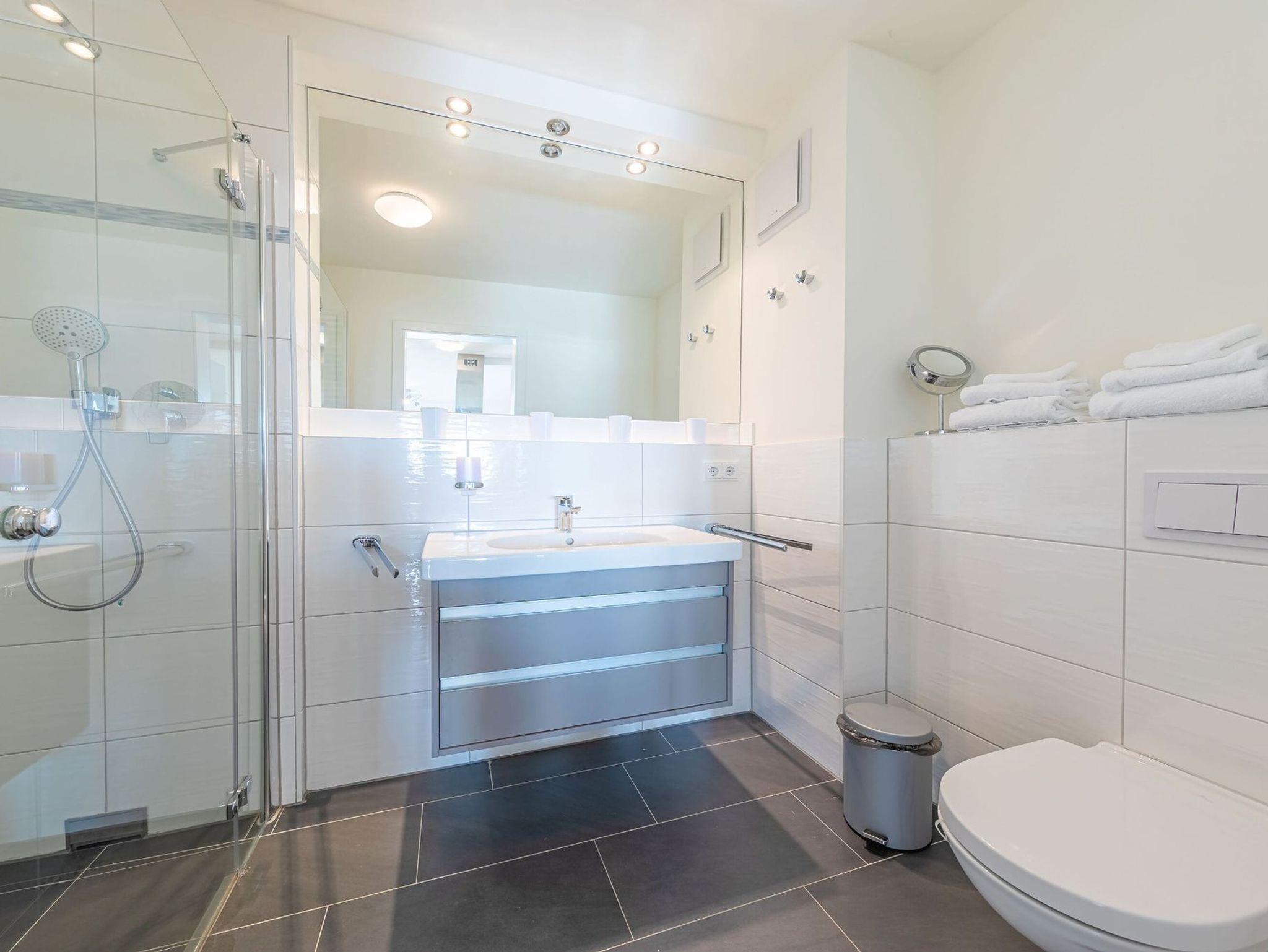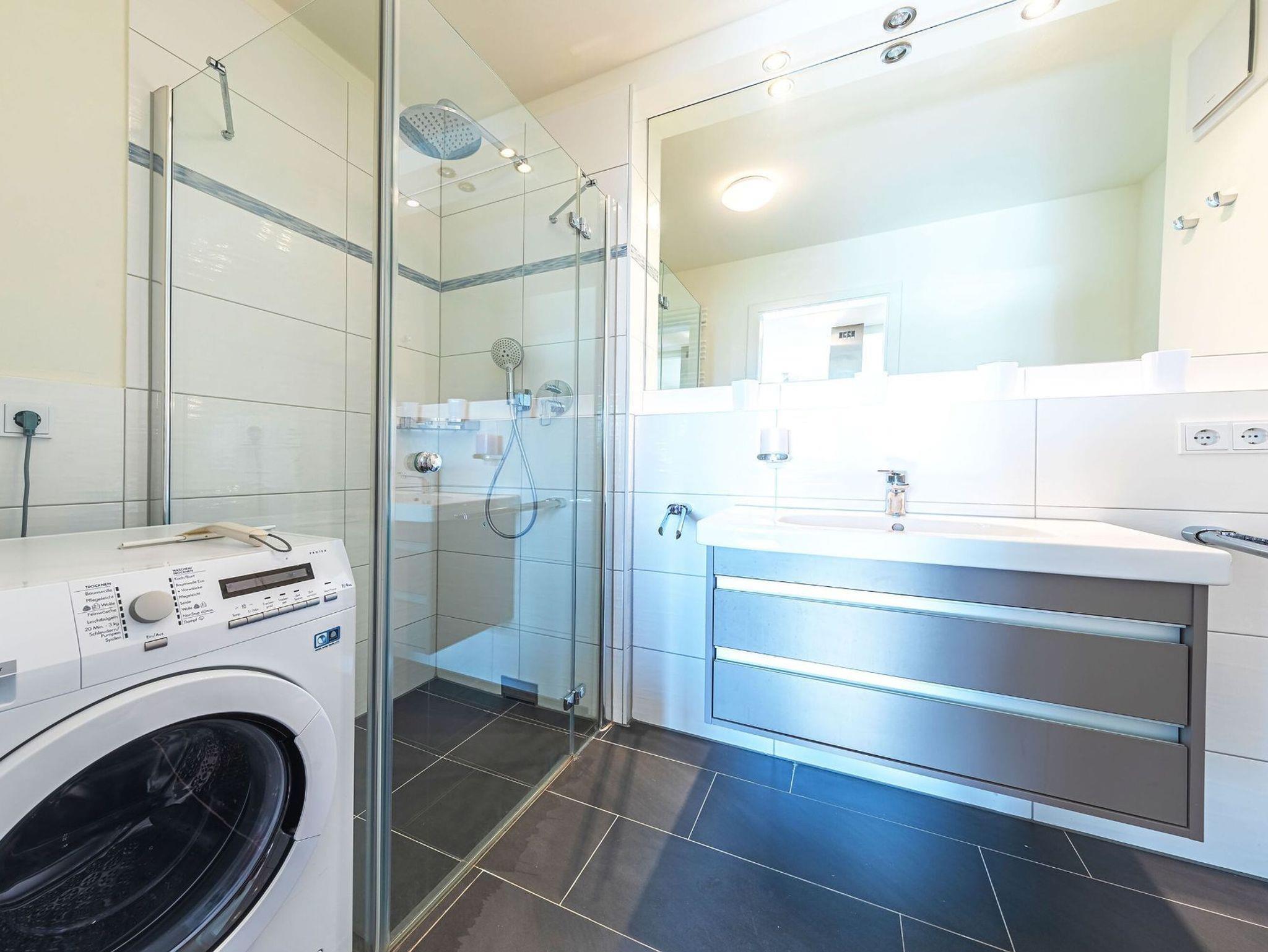 Das moderne Badezimmer hat eine Regenwald- Dusche, Waschtisch, WC und Waschmaschine.