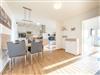 Offene, sehr gut ausgestattete Küche mit Cerankochfeld, Backofen, Geschirrspüler, Kühlschrank sowie Mikrowelle und komplette Geschirr- und Küchenausstattung.
