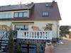 Das helle Gästezimmer befindet sich im Souterrain mit großen Fenstern. Es verfügt über ein Doppelbett. Neben einer Sitzgruppe ist das Zimmer mit einem Schrank und Nachttischen eingerichtet.