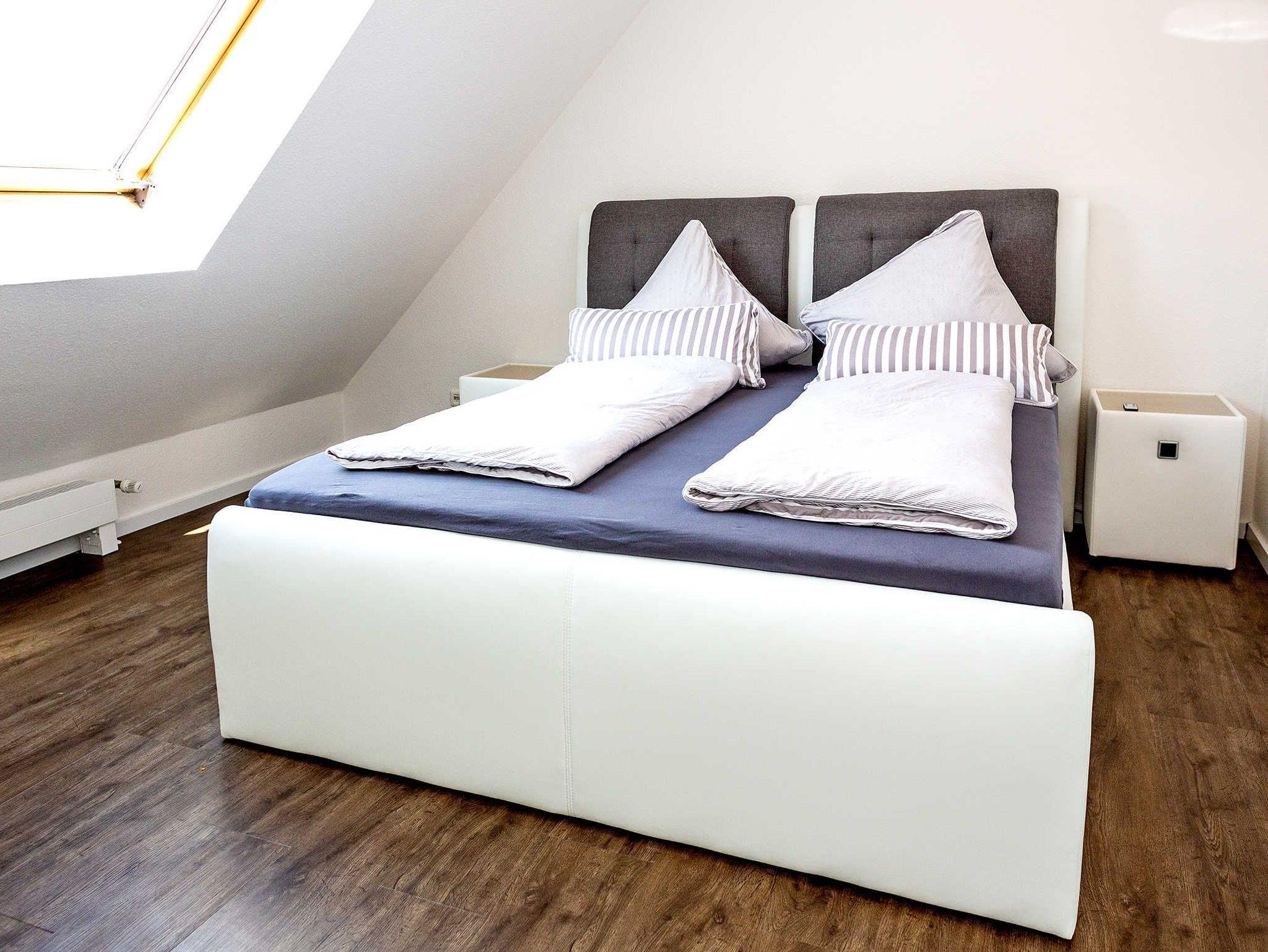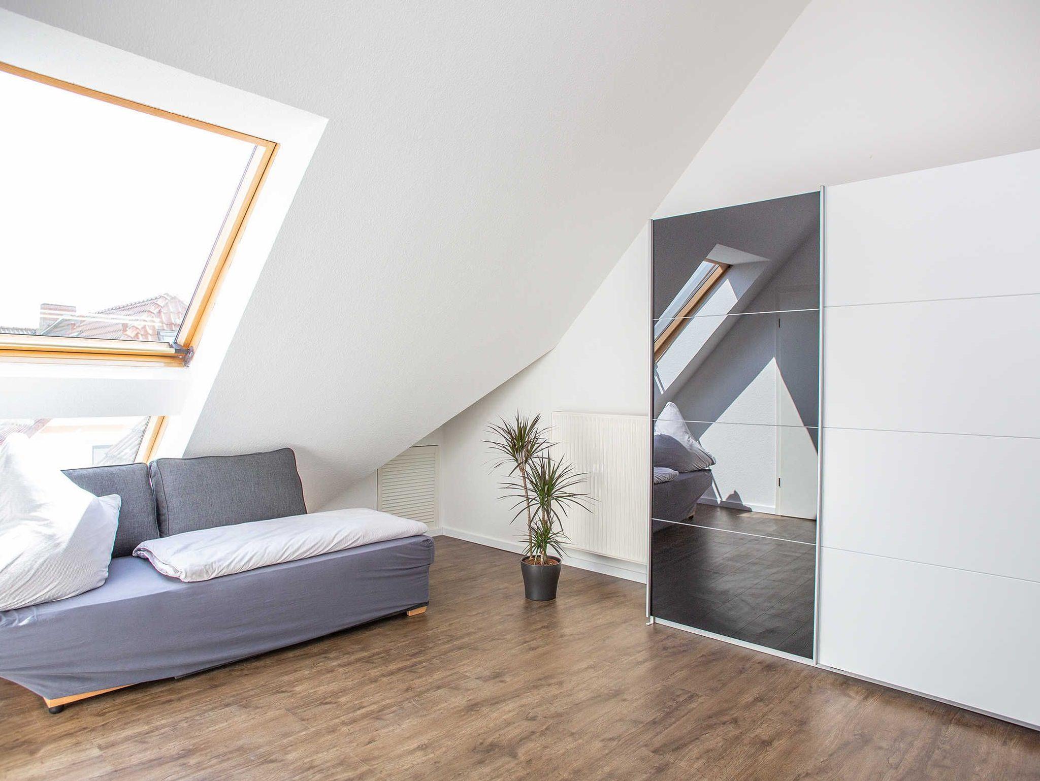 Die im Flur befindliche Treppe lässt viel Licht in den Raum und bietet den Zugang zur oberen Etage. Auf dieser Ebene findet man das zweite Schlafzimmer und ein Wannenbad mit Blick in den Himmel. In beiden Schlafzimmern ist das 5* Boxspringbett Standard. Aber auch die Aufbettungsmöglichkeit im Studio sowie in dem Wohnzimmer sind qualitativ sehr hochwertig. Rundum eine Wohnung, in der man gerne selbst wohnt.