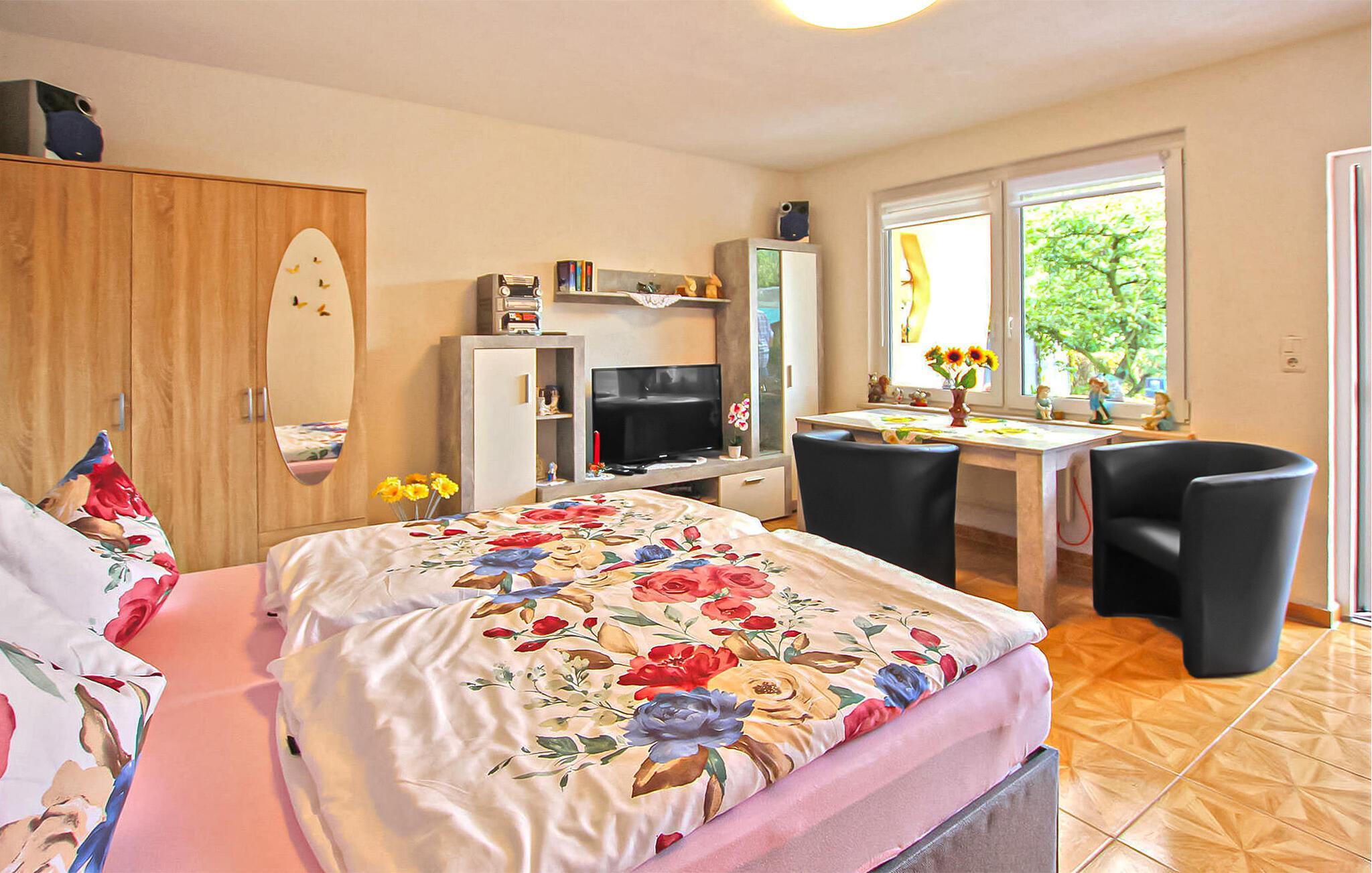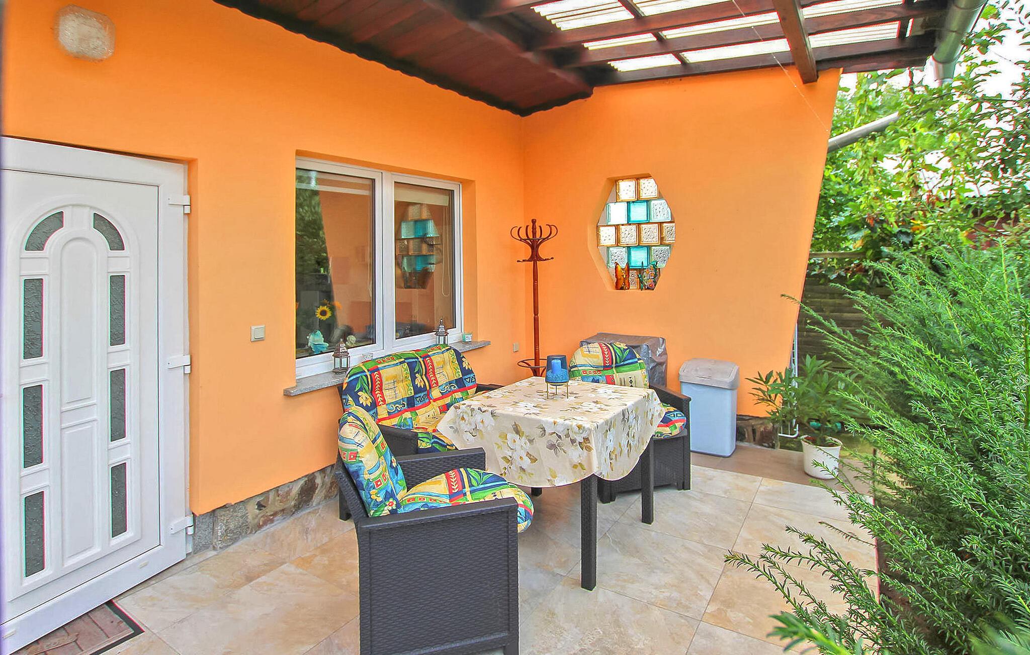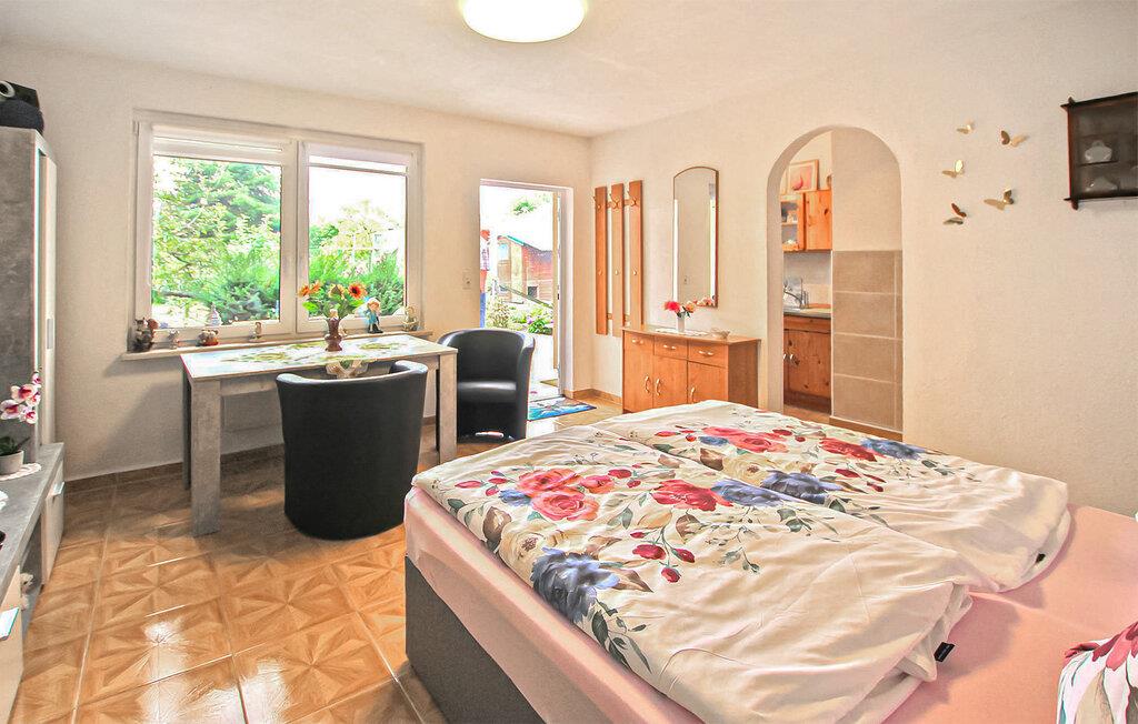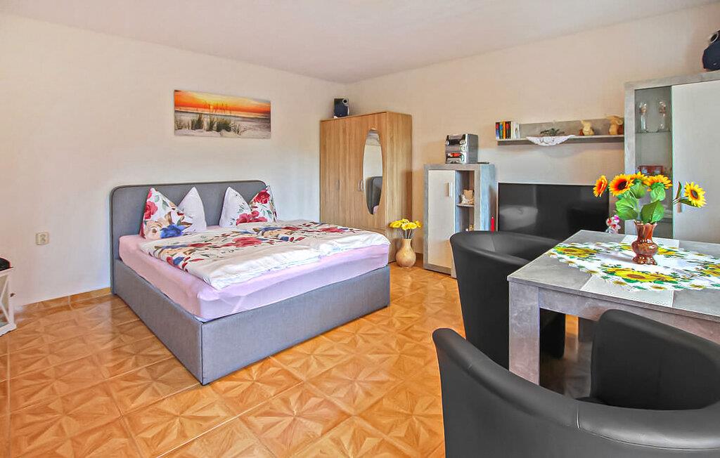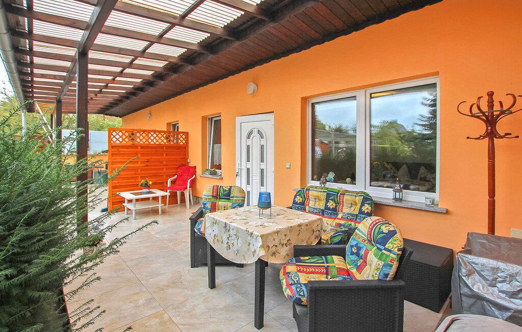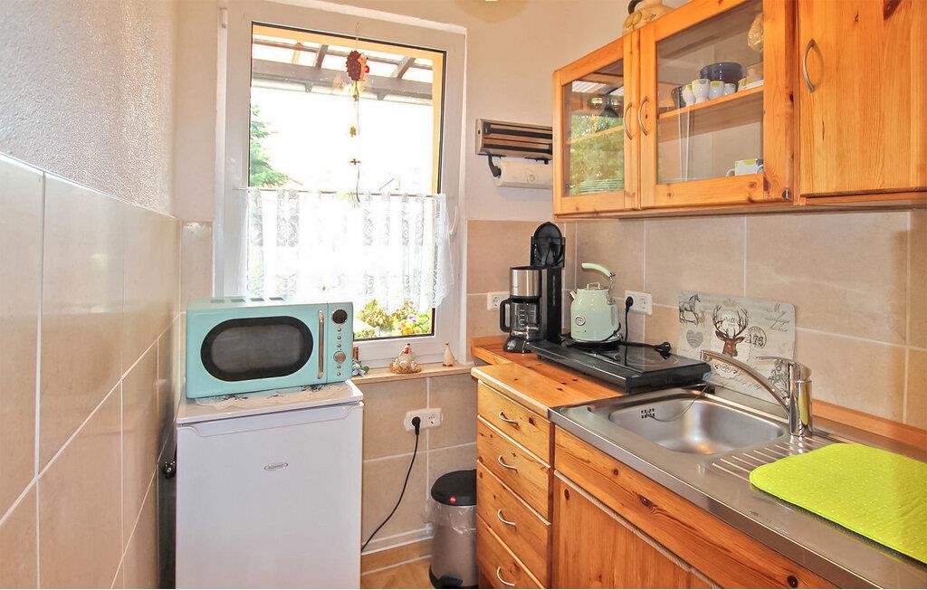 Roligt og nærmest landligt beliggende i et villakvarter ligger feriehuset (halvdelen af dobbeltbungalow) til 2 personer, som er renoveret i 2019, bagerst i ejerens cirka 1.000 kvadratmeter store indhegnede boligejendom. Der er cirka 1.000 m til Volksbad an der Müritz og cirka 2 km til centrum med den smukke gamle bydel og havnen (lokal offentlig transport). Bagere og supermarkeder er i umiddelbar nærhed. Det cirka 36 kvm store ikke-ryger hus i stueetagen med separat indgang er udstyret med en kombineret stue og soveværelse (dobbeltseng, spisebord, fladskærms-tv, radio, cd-afspiller, lille opholdsområde), en lille separat køkken (kogeplader, køleskab med fryser, diverse små køkkenmaskiner) og et nyrenoveret badeværelse (bruser, toilet). Der er også en stor overdækket og møbleret terrasse, grill, cykelrum og opbevaring, elvarme og en parkeringsplads. Ejeren holder høns og tilbyder friske æg efter anmodning (mod betaling), og frugt kan høstes fra haven efter aftale. Den samlede pris inkluderer slutrengøring, vand og fra 1. maj. indtil 30. september El-udgifter inkluderet. Medbring venligst eget sengelinned og håndklæder eller kan lejes mod betaling. Betales på stedet: turistskat, el efter forbrug (fra 1. oktober til 30. april), linnedpakke (hvis forespurgt). En hund er tilladt i denne ejendom. Det statsanerkendte kurbad Waren (Müritz) ligger i charmerende omgivelser direkte ved søen af samme navn, den største indsø i Tyskland. Det er også turistcentret i Mecklenburg Lake District. Attraktioner omfatter den historiske gamle bydel, havnen med passagerbåde, den tilstødende promenade og adskillige spisemuligheder samt Müritzeum, et naturopdagelsescenter med et enormt ferskvandsakvarium og udstillinger om flora og fauna i sødistriktet. Der er også udendørs swimmingpools, båd- og cykeludlejning, surf- og sejlerskoler og mange indkøbsmuligheder i byen. Waren er indgangsporten til Müritz Nationalpark, som nemt kan udforskes via det veludviklede cykelstinetværk (også i kombination med passagerbåden). Motorvejsforbindelse ca 25 km.