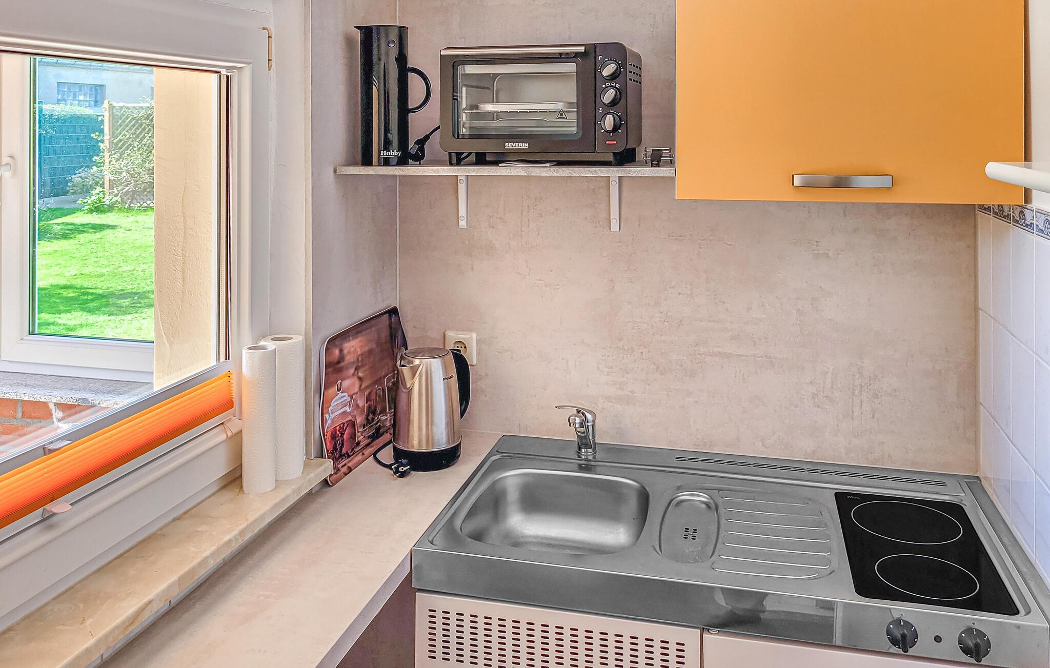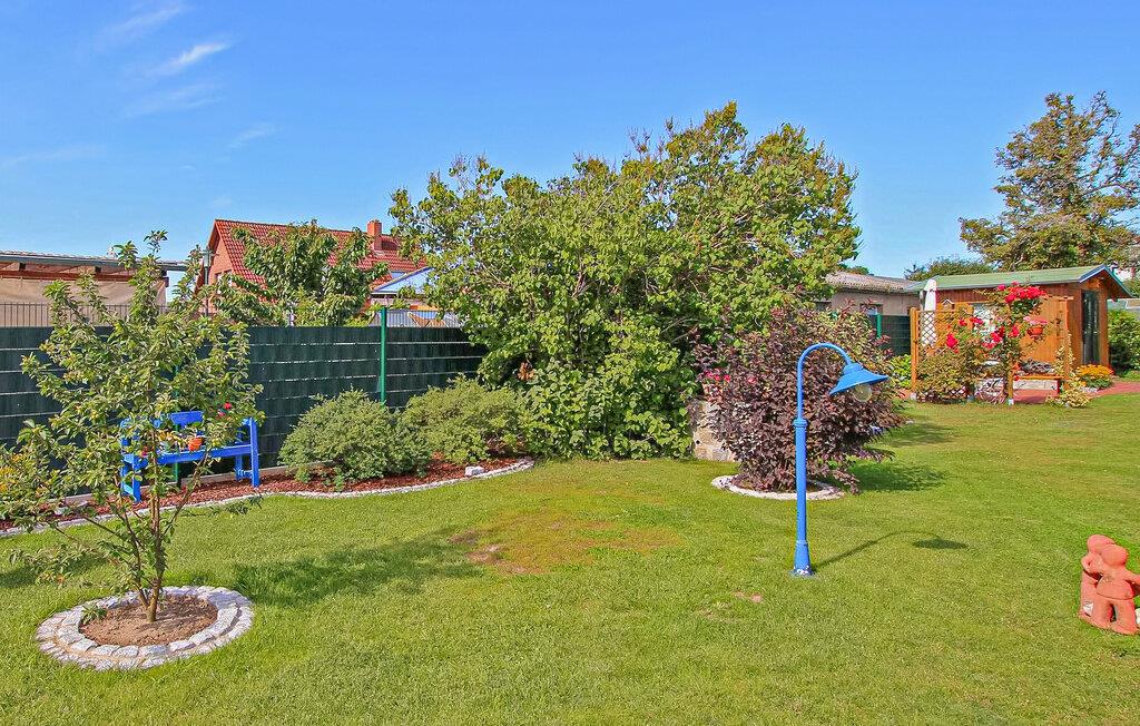 Roligt beliggende i udkanten af Waren (Müritz), i et boligområde, ligger det cirka 60 kvadratmeter store feriehus for op til 2 voksne og 1 barn i det bagerste område af det cirka 1.000 kvadratmeter store indhegnede og meget vel- vedligeholdt boligejendom. Der er ca. 1000 m til Volksbad an der Müritz og ca. 2 km til centrum med havnen, promenaden og den charmerende gamle bydel (offentlig transport). Der er indkøbsmuligheder i umiddelbar nærhed. Det smagfuldt indrettede, centralt opvarmede ikke-ryger hus er udstyret med en stue (sovesofa - ekstra seng til en person, spisebord, fladskærms-tv, radio), et soveværelse (dobbeltseng, stort skab), et minikøkken (keramiske kogeplader, køleskab med fryser mulighed)., mikroovn med grill, diverse små køkkenmaskiner), opbevaringsrum, entre og badeværelse (bruser i gulv, toilet, vaskemaskine, hårtørrer). Der er også et møbleret opholdsområde i haven, cykelkælder, parkering foran huset og WiFi til rådighed. Den samlede pris inkluderer slutrengøring, el og vand samt sengelinned og håndklæder. Betales på stedet: turistskat. Kæledyr er ikke tilladt i denne ejendom. Det statsanerkendte kurbad Waren (Müritz) ligger i charmerende omgivelser direkte ved søen af samme navn, den største indsø i Tyskland. Det er også turistcentret i Mecklenburg Lake District.Attraktioner omfatter den historiske gamle bydel, havnen med passagerskibe, den tilstødende promenade og talrige spisemuligheder samt Müritzeum, et naturoplevelsescenter med et kæmpe ferskvandsakvarium og udstillinger om bl.a. flora og fauna i sødistriktet.I landsbyen er der også udendørs swimmingpools, båd- og cykeludlejning, surf- og sejlerskoler og mange indkøbsmuligheder. Waren er indgangsporten til Müritz Nationalpark, som nemt kan udforskes via det veludviklede cykelstinetværk (også i kombination med passagerbåden). Motorvejsforbindelse ca 25 km.