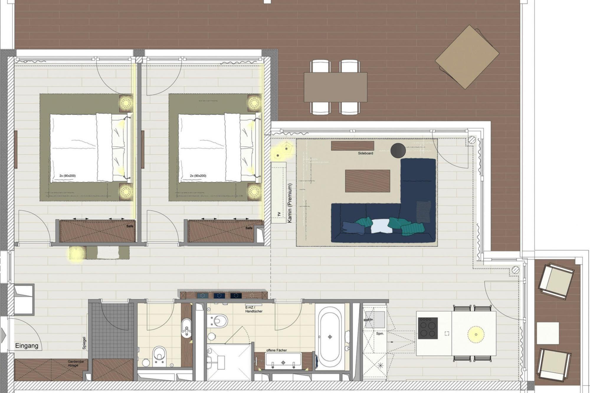 Åbent køkken(spisebord, kogeplade(Komfur med fire kogeplader, glaskeramisk), elkedel, brødrister, kaffemaskine, ovn, opvaskemaskine , køleskab), stue / spisestue(Fjernsyn(kabel), radio), soveværelse(dobbeltseng), soveværelse(dobbeltseng), badeværelse(bruser, håndvask, toilet, føntørrer), pulterkammer, garage(deles med andre gæster), sauna(paid), balkon, varme, cykelopbevaring, havemøbler, parkering, swimmingpool(deles med andre gæster, betalt, opvarmet), elevator, baby crib(paid), Håndklæder/sengelinned (inkl.)