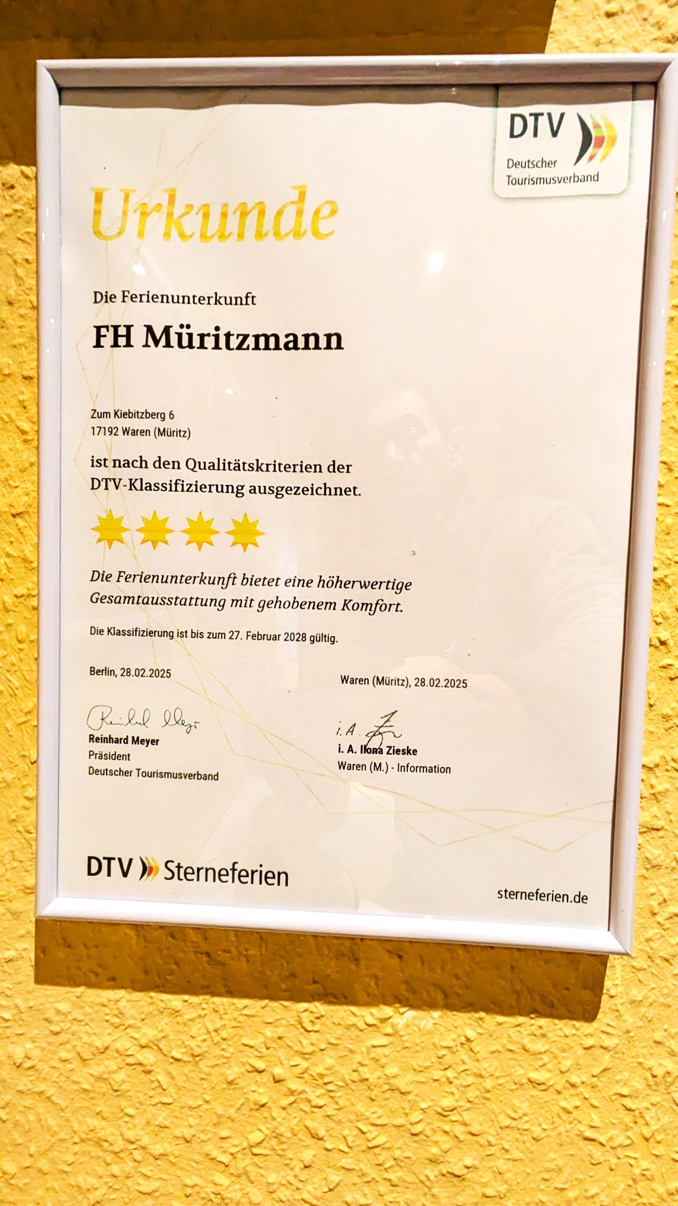 Wir wurden vom Touristik-Verband mit dem Siegel 4-Sterne eingestuft.