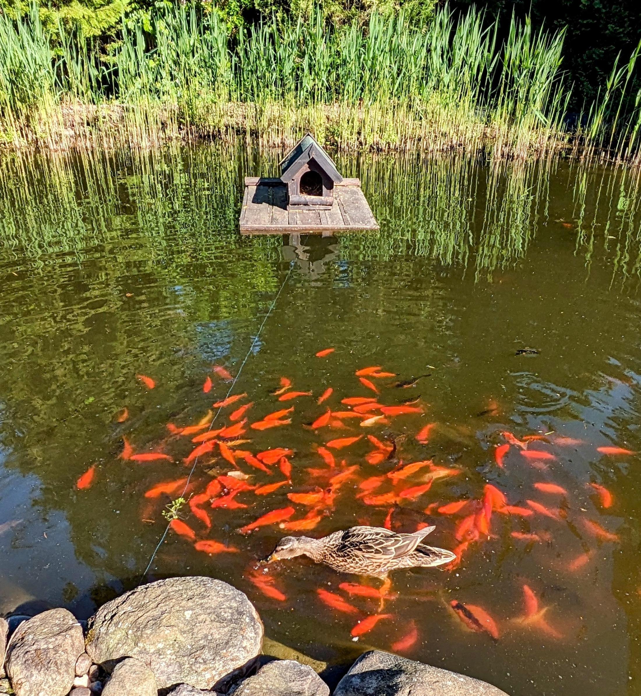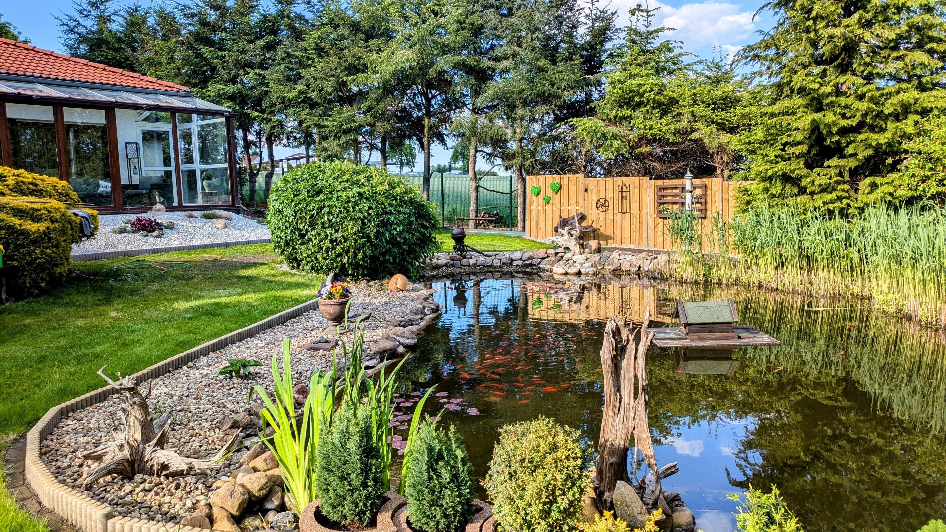Vom Hof zur Ferienwohnung ist nur eine Stufe vorhanden . Der Teich ist mit Fischen besetzt und jedes Jahr wohnen hier echte Wildenten , die hier auch brüten und leben.