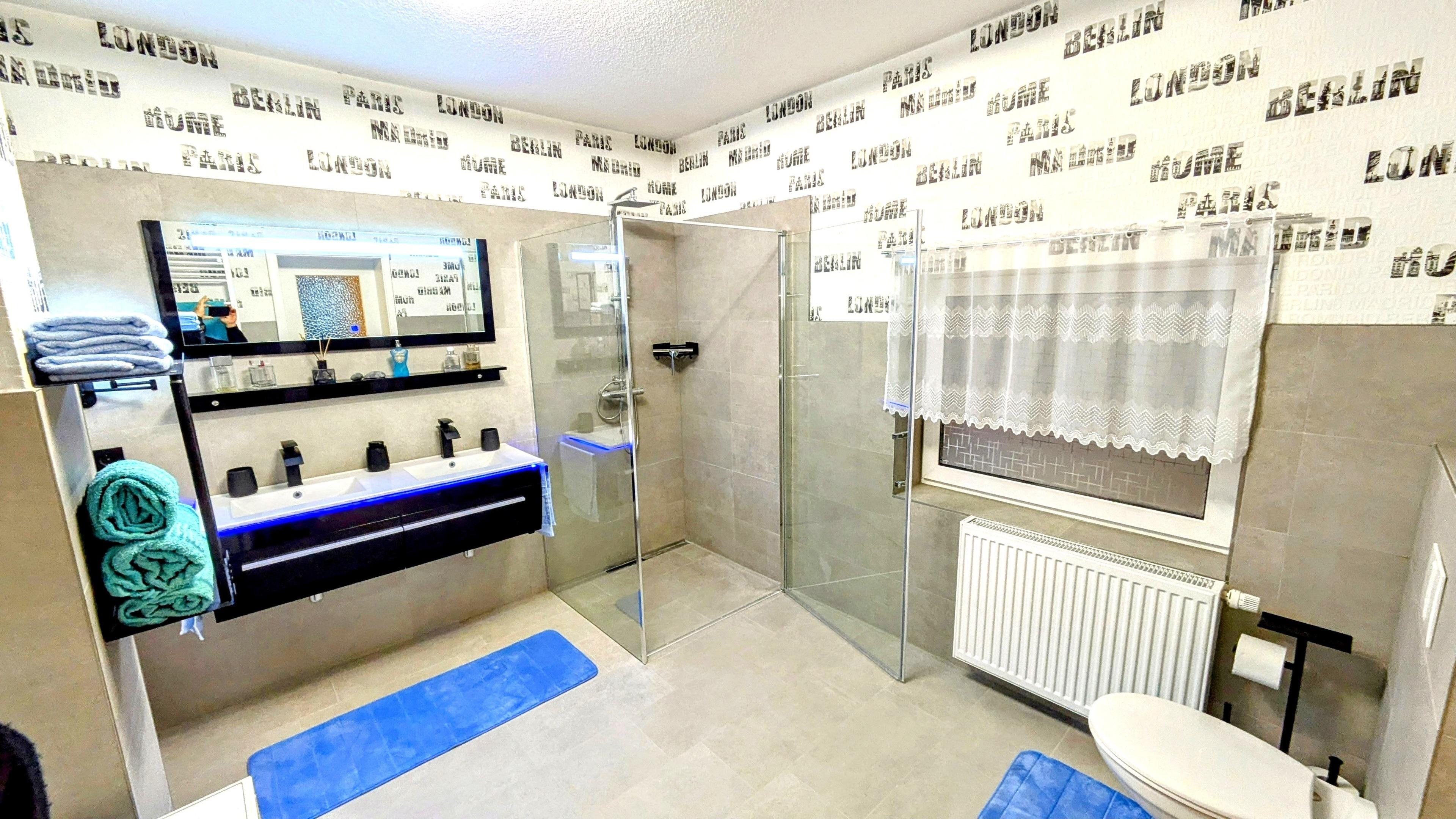 Das Ferienhaus ist mit 2 Schlafzimmern , jedesmal mit Bocksprig-Bett in Comfort-Höhe ausgestattet . Es gibt ein sehr stylisches großes Bad mit Doppel-Waschplatz , offener ebenerdiger Dusche, 1 Toilette , Waschmaschine , Trockner . Daneben gibt es noch eine weitere Dusche mit WC und Spiegel/Waschplatz .