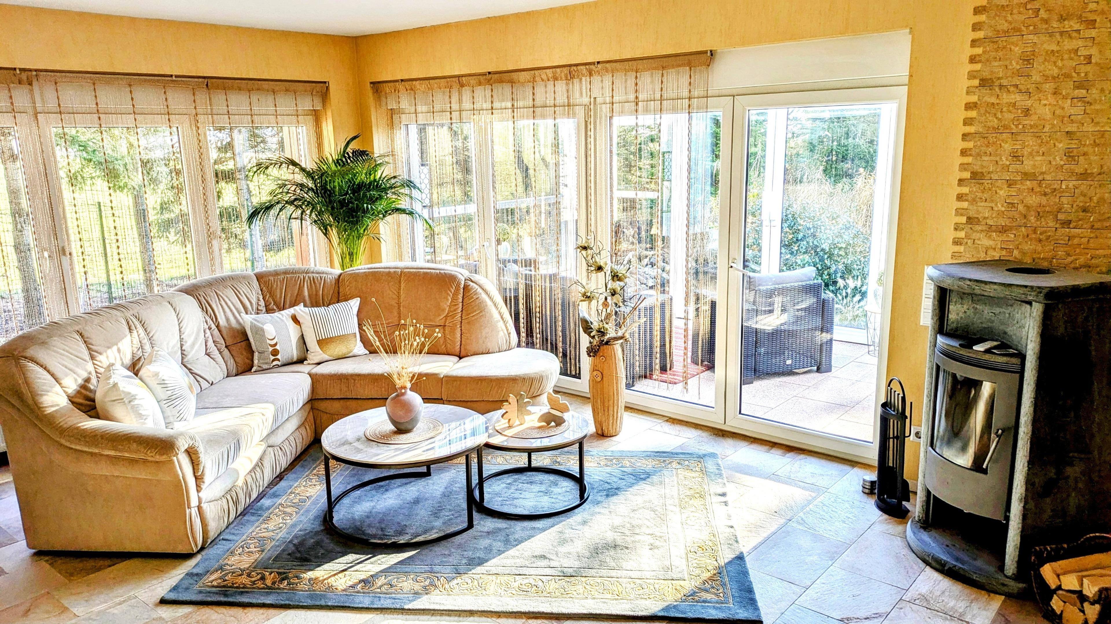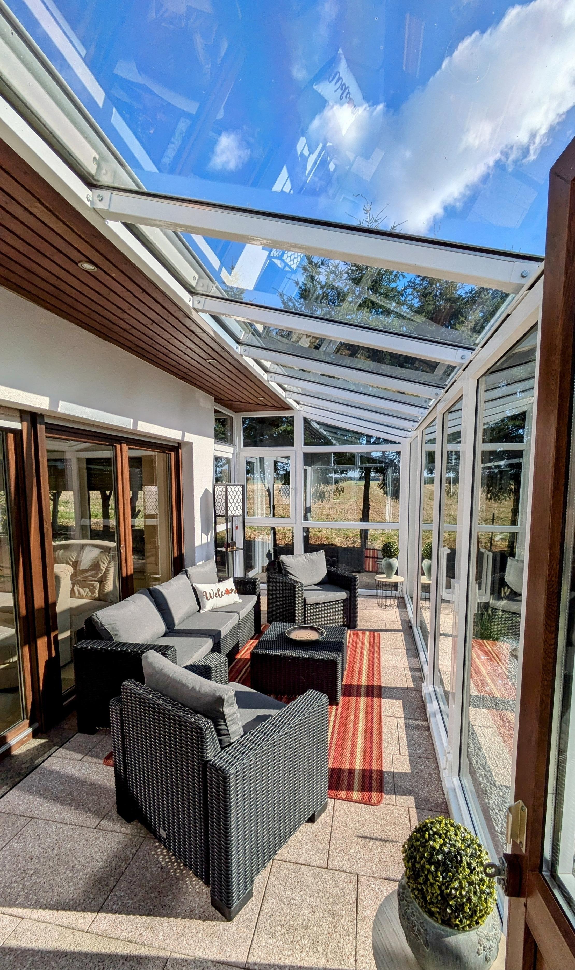 Der großzügige Wintergarten ist mit einer Rattan-Sitzecke ausgestattet und läßt einen freien Blick zum Garten und Teich zu.