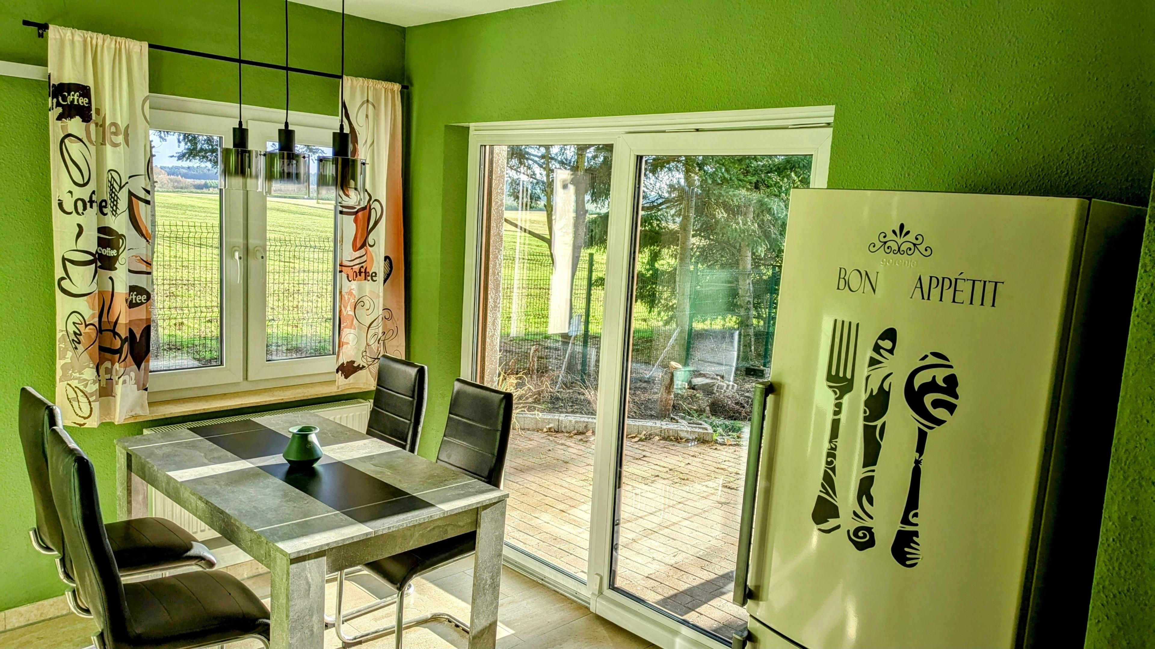 Die Küche ist sehr geräumig mit freiem Blick in die Natur und Zugang zur Terasse .