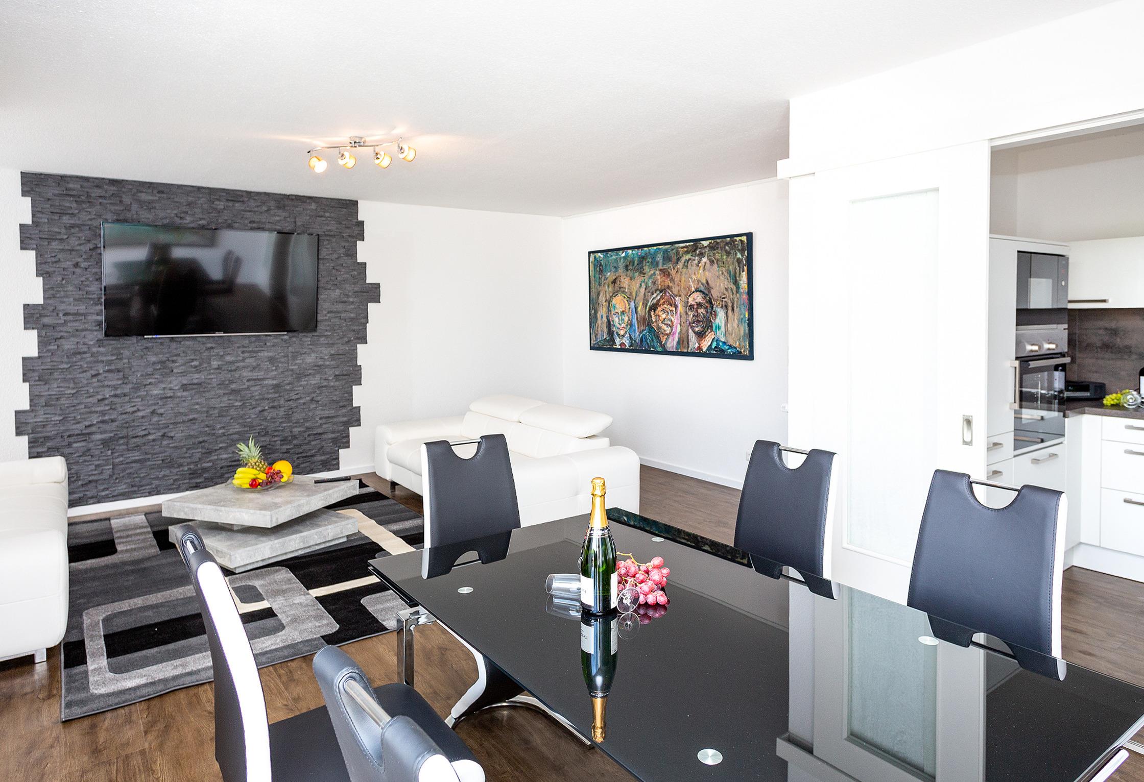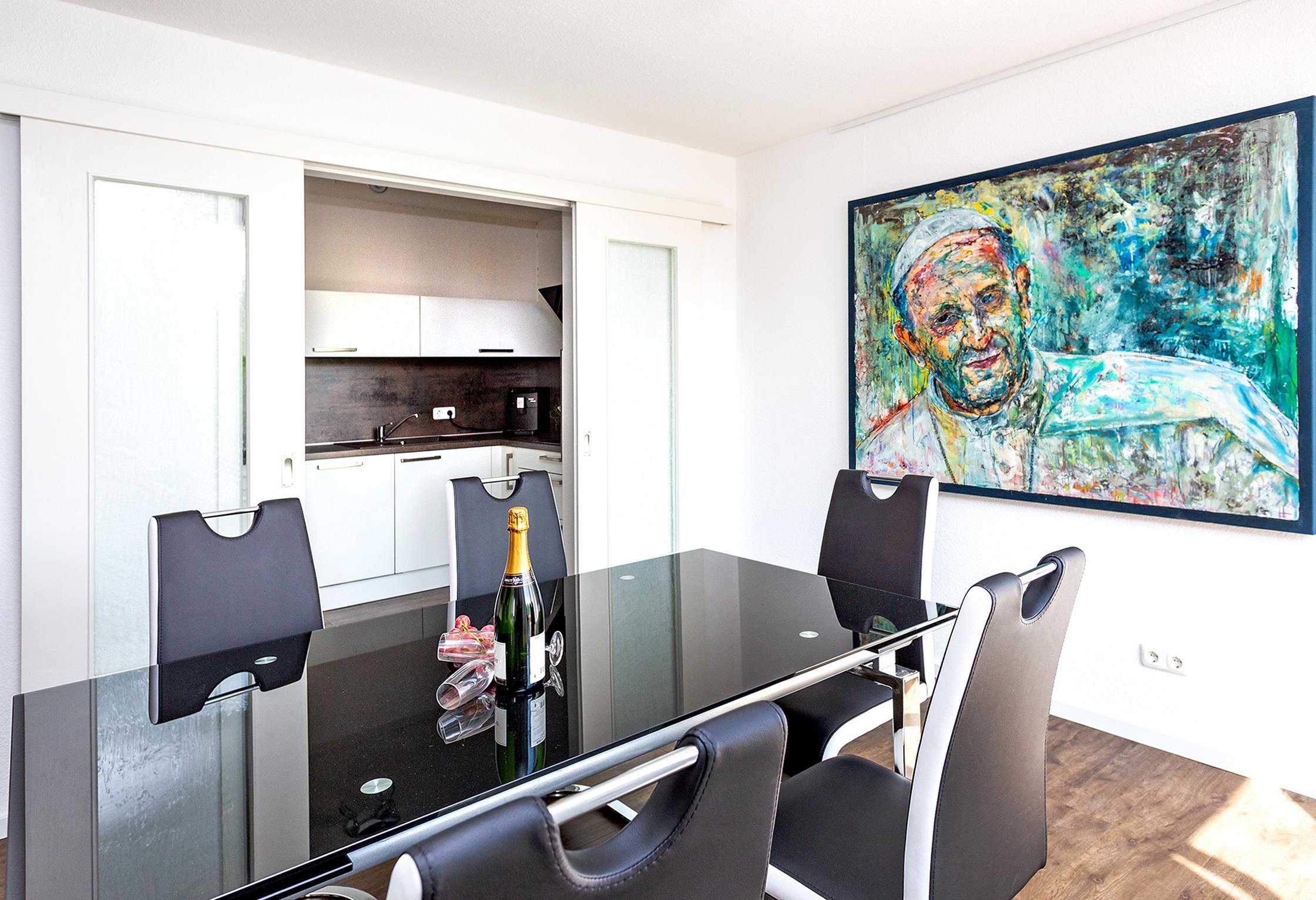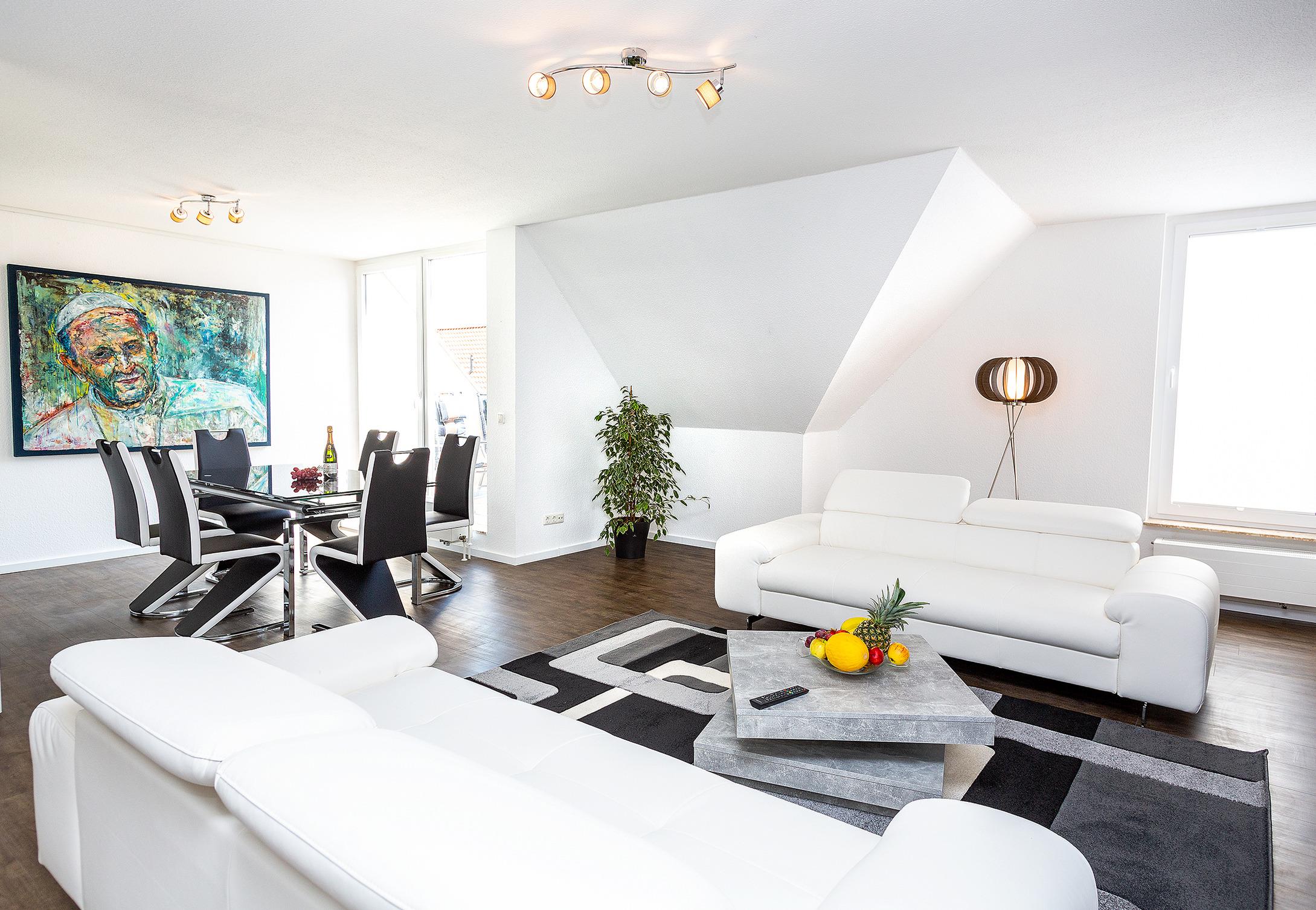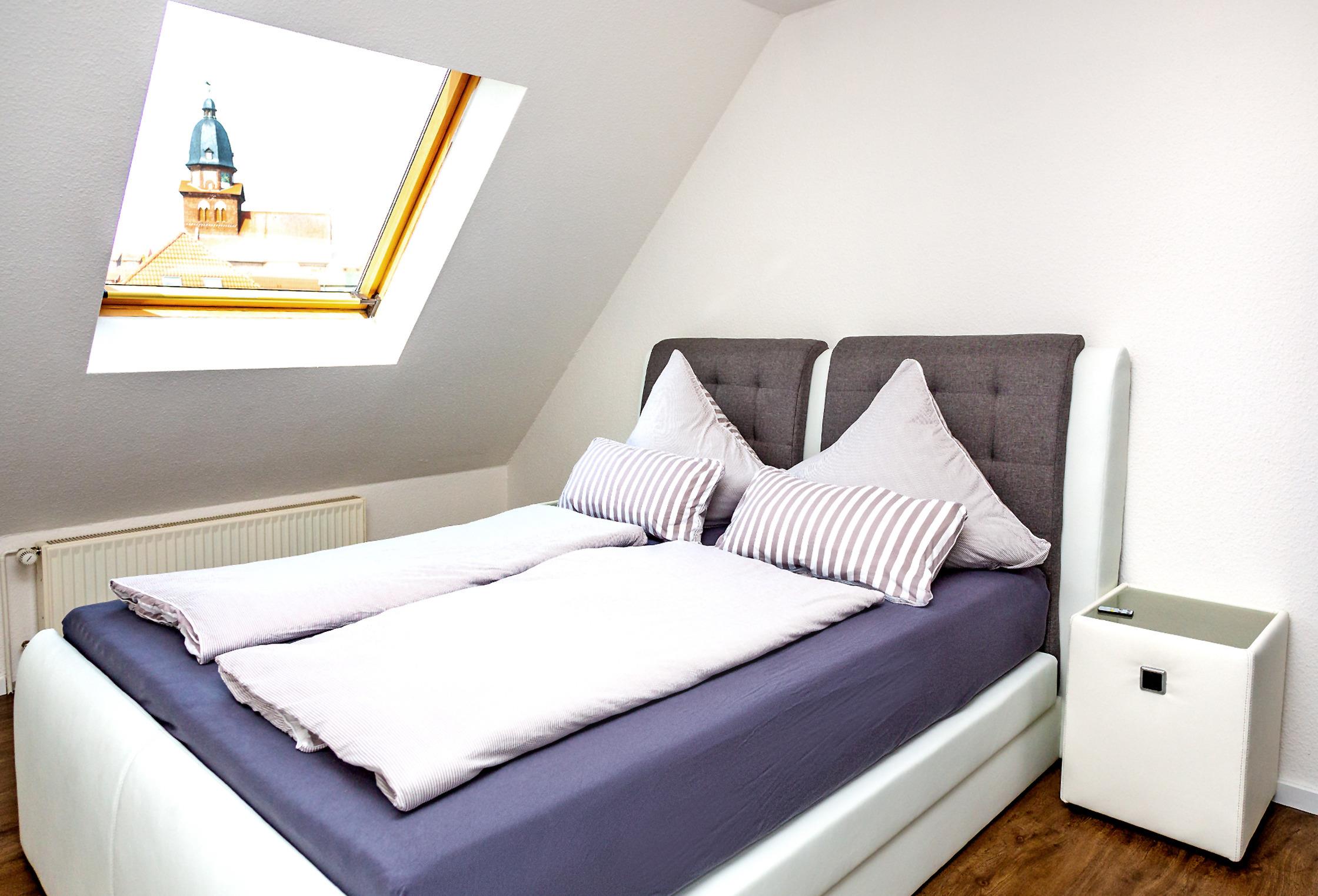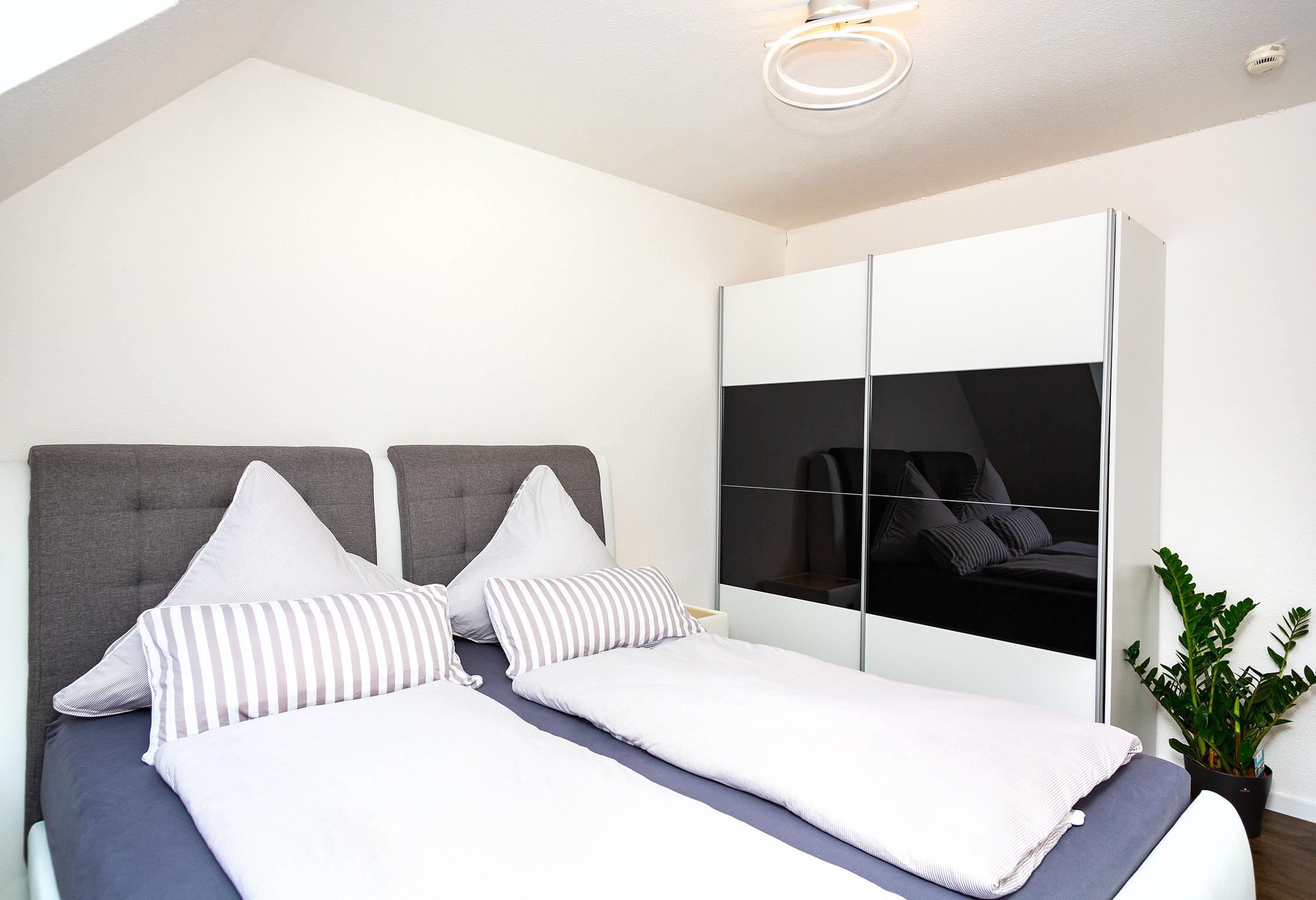 Die im Flur befindliche Treppe lässt viel Licht in den Raum und bietet den Zugang zur oberen Etage. Auf dieser Ebene findet man das zweite Schlafzimmer und ein Wannenbad mit Blick in den Himmel. In beiden Schlafzimmern ist das 5* Boxspringbett Standart. Aber auch die Aufbettungsmöglichkeit im Studio sind qualitativ sehr hochwertig. Rundum eine Wohnung, in der man gerne selbst wohnt.