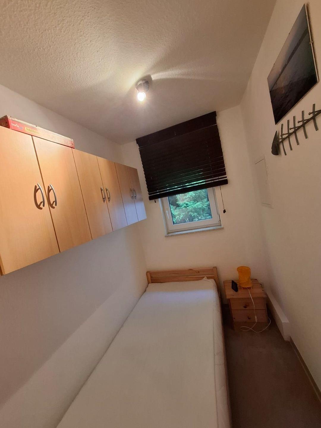 Der Wohnbereich ist mit einer Schlafcouch, einem Sessel, einem kleinen Tisch, dem Esstisch mit Stühlen, einem TV Gerät und einem Kaminofen ausgestattet. In der offenen Küche befindet sich ein Herd mit Backofen, eine Spüle, ein Kühlschrank mit zwei extra Tiefkühlfächern, ein Espressoautomat, ein Geschirrspüler, ein Wasserkocher, sowie Kaffeemaschine und Toaster. Hinter einer Wand ist eine Flurgarderobe und es gibt einen Schrank für Reinigungsmittel, einen Staubsauger und ein Bügeleisen. Das Bad ist mit Dusche, WC und Föhn ausgerüstet. In einem Schlafzimmer sind zwei Betten und ein Kleiderschrank, im Anderen steht ein Einzelbett. Vor dem Haus ist eine Terrasse mit Gartenmöbeln und Grill. Sie können den 1500 m² großen Naturgarten zum Sonnen oder für Spiele nutzen. Ein PKW - Parkplatz ist auf dem Grundstück vorhanden.