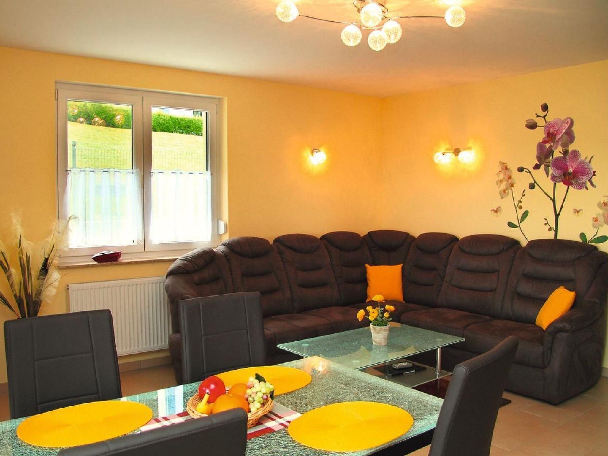 Ground floor flat with 2 bedrooms for 4 people (65 m²)Living room with a large comfortable couch, dining area with table and 4 chairs, satellite TV, hi-fi mini system, high-quality kitchenette, dishwasher, fridge/freezer, oven with 4 ceramic hobs, kettle, coffee maker, egg cooker, toaster and sufficient crockery, bedroom with double bed (adjustable slatted frames) and a wardrobe with mirror and 2 bedside cabinets, room with bunk beds and a wardrobe, shower/WC, terrace with seating and lake view, car parking space directly at the house.