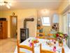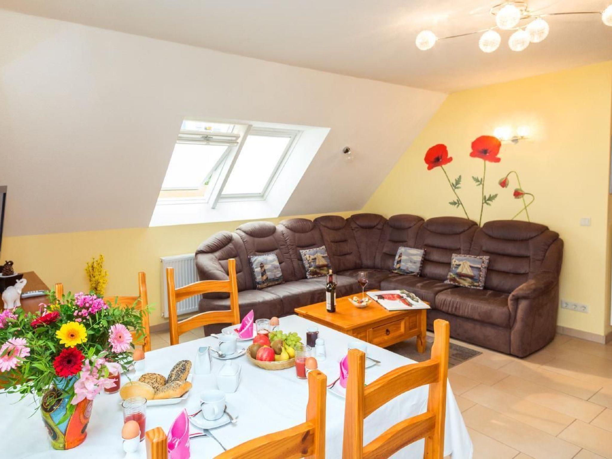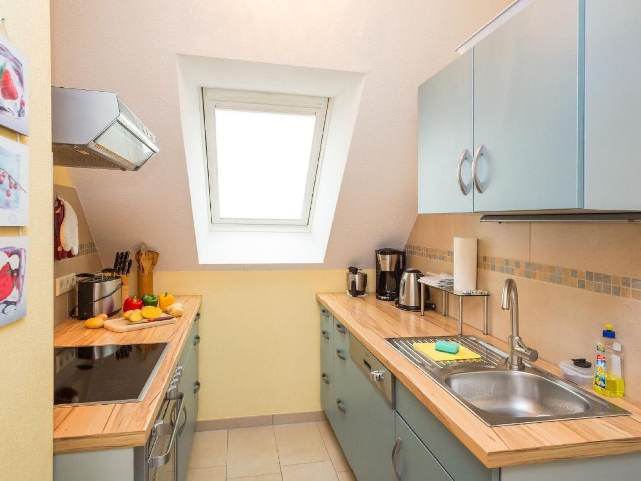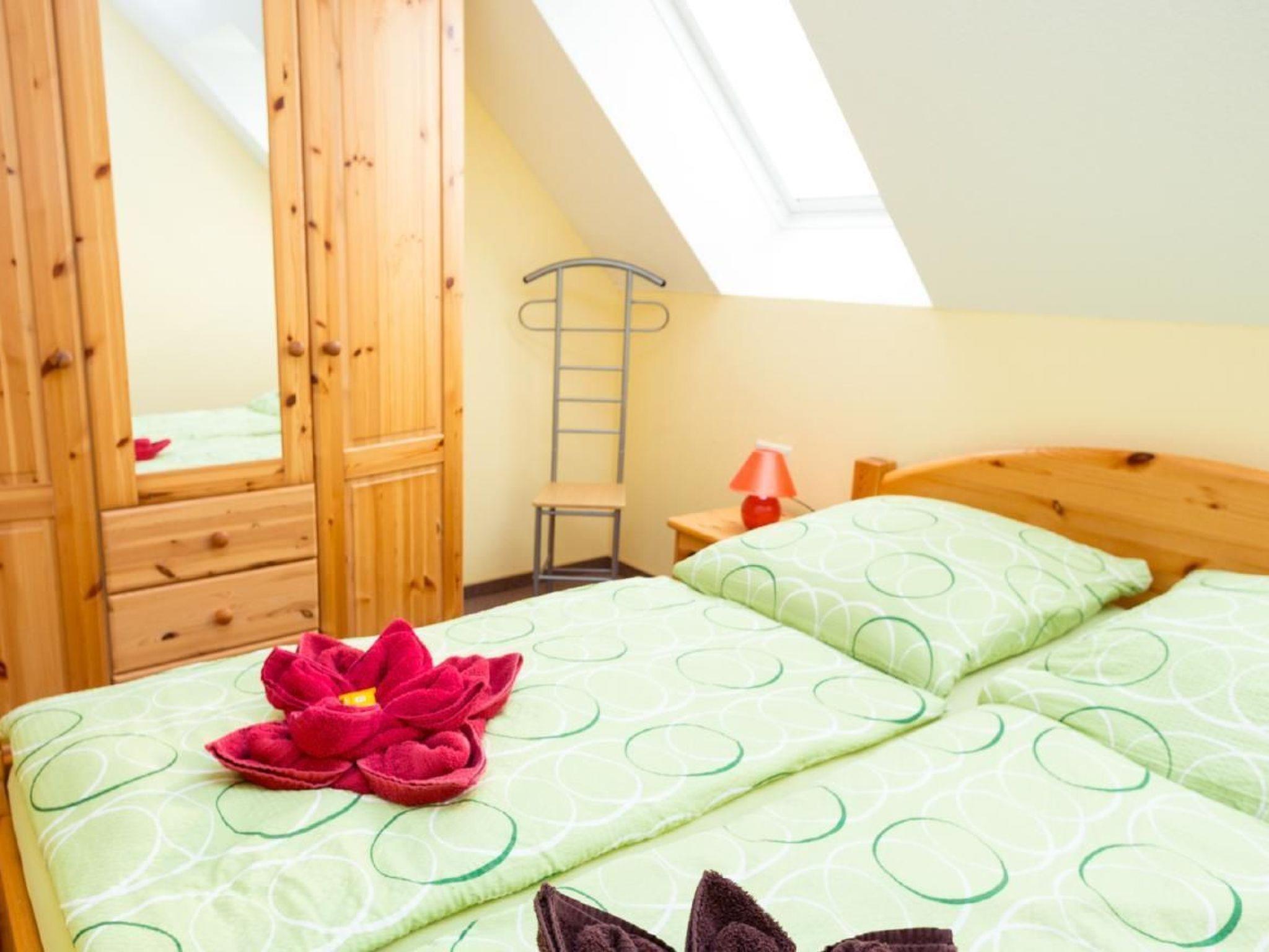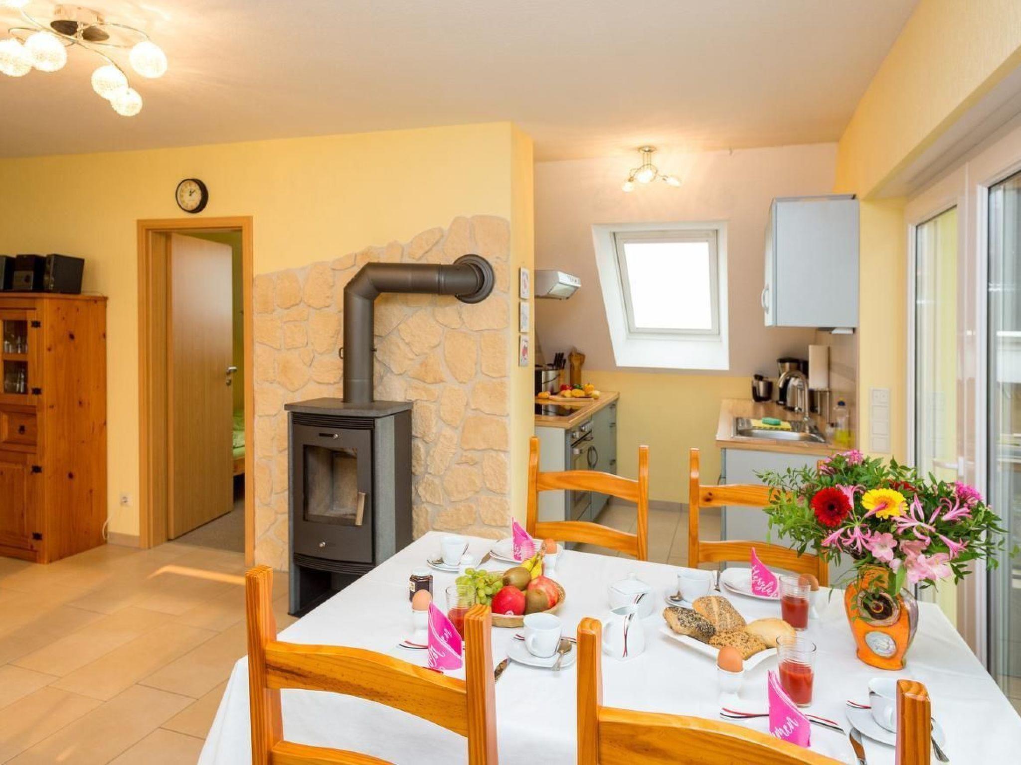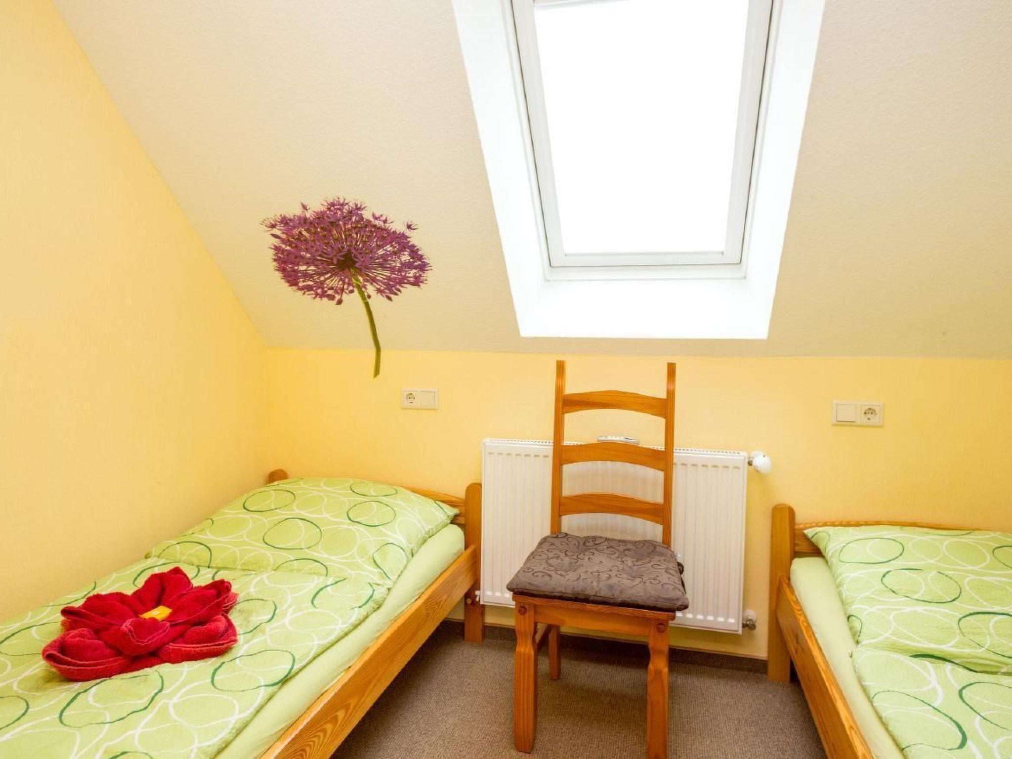 Upper floor flat with 2 bedrooms for 4 people (65 m²)Living room with a large comfortable couch, dining area with table and 4 chairs, satellite TV, hi-fi mini system, high-quality kitchenette, dishwasher, fridge/freezer, oven with 4 ceramic hobs, kettle, coffee maker, egg cooker, toaster and sufficient crockery, bedroom with double bed (adjustable slatted frames) and a wardrobe with mirror and 2 bedside cabinets, room with two single beds and a wardrobe, shower/WC, terrace with seating and lake view, car parking space directly at the house.