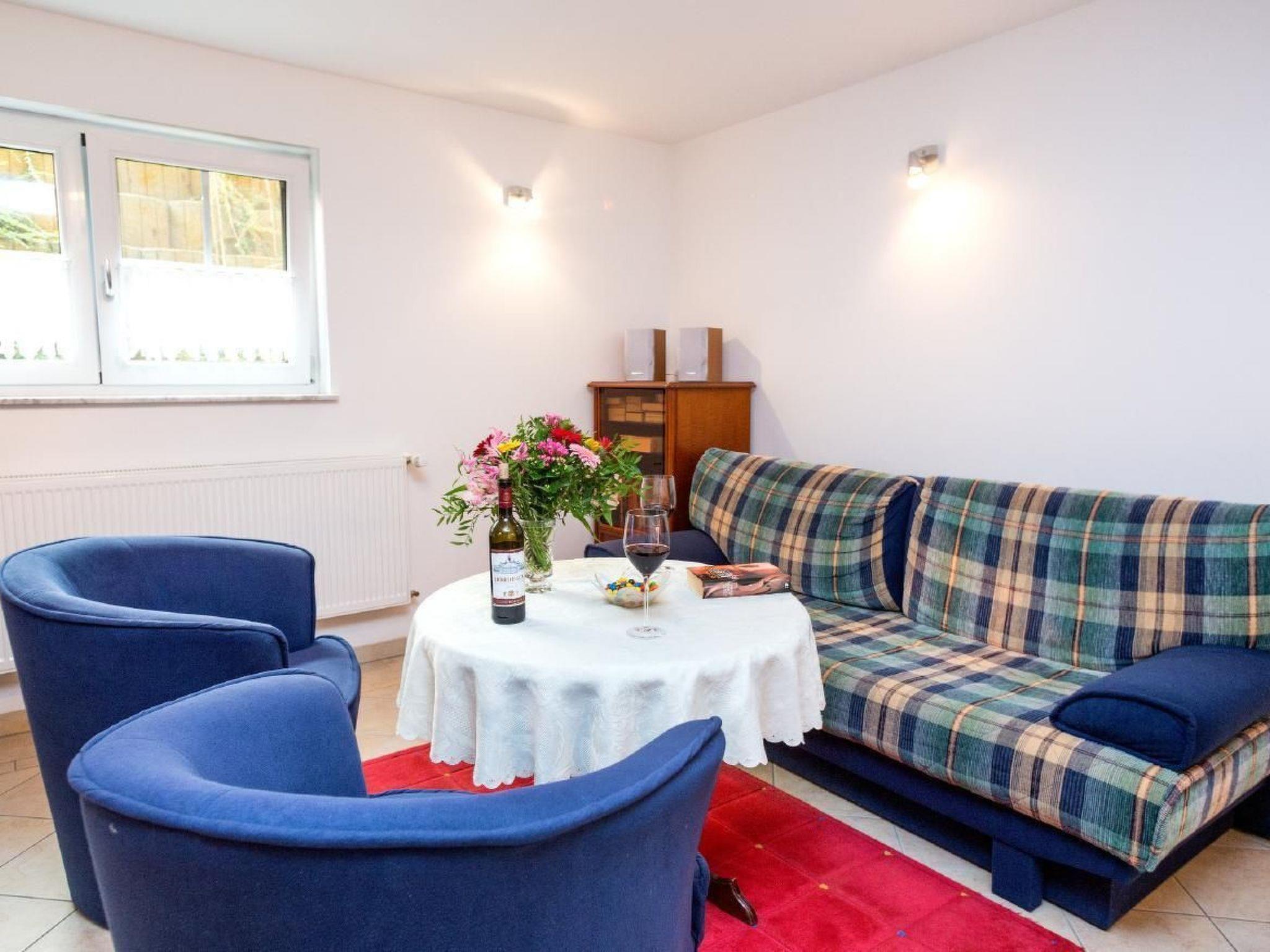 The basement flat is partially below ground level and has open, unobstructed windows in the living room and bedroom, with its own exit to its own terrace. Living/dining room with sofa and sofa bed for two people, satellite TV, hi-fi mini system, high-quality kitchenette with dishwasher, fridge/freezer, oven, ceramic hobs. Bedroom with double bed, shower/WC, terrace with seating and lake view, car parking space directly at the house.