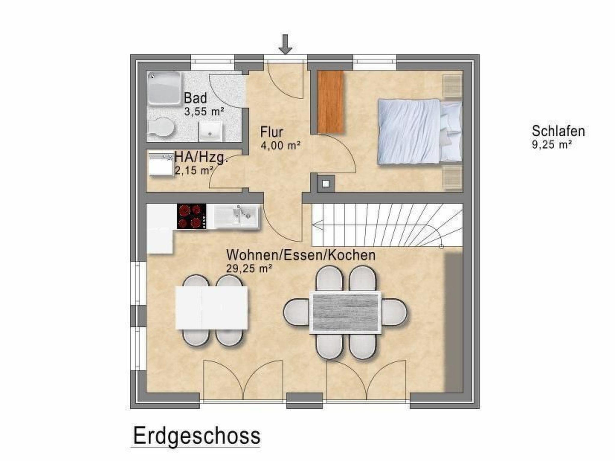 Just unpack and feel at home. The fully equipped holiday home is ready for your dream holiday. Whether as a couple, with friends or as a family, up to six guests are welcome in this holiday home, which has a living space of 97 m² spread over two floors. On the ground floor, you will find a bedroom with a double bed (180 cm x 200 cm), a shower room with WC and an open, fully equipped kitchen-cum-living room with flat-screen TV and wood-burning stove, terrace exit and stairs to the upper floor. Upstairs is the second bedroom with double bed (180 cm x 200 cm), a separate living room, which can also be used as a third bedroom with a comfortable sofa bed and access to the furnished balcony, as well as a bathroom with bath and WC. The comfortable sofa bed offers full sleeping accommodation for a fifth and sixth guest, as it has a slatted frame (1.60 x 2.00 m). The room is also equipped with a flat-screen TV, a wardrobe and a bookshelf. In the first two bedrooms, the double beds are each surrounded by two bedside tables with reading lamps on both sides. The centrepiece of the house is the open-plan kitchen/living room. This allows you to cater for yourself comfortably and extensively with brand-name appliances and a large work surface. The equipment includes a dishwasher, a four-zone ceramic hob with oven, a Cafissimo coffee machine and a fridge with freezer compartment. Pass the wood-burning stove to reach the dining area. Here you can sit down on six comfortable, leather swivel chairs to enjoy a meal together or socialise in the evening. The wall-mounted flat-screen TV with satellite TV provides entertainment in the evening. Plenty of natural light floods in through the exterior doors, making this room pleasantly bright. The bathroom on the ground floor is equipped with a shower cubicle, an undermounted washbasin with illuminated mirror cabinet and a WC. All windows and patio doors are fitted with insect screens and external roller shutters.