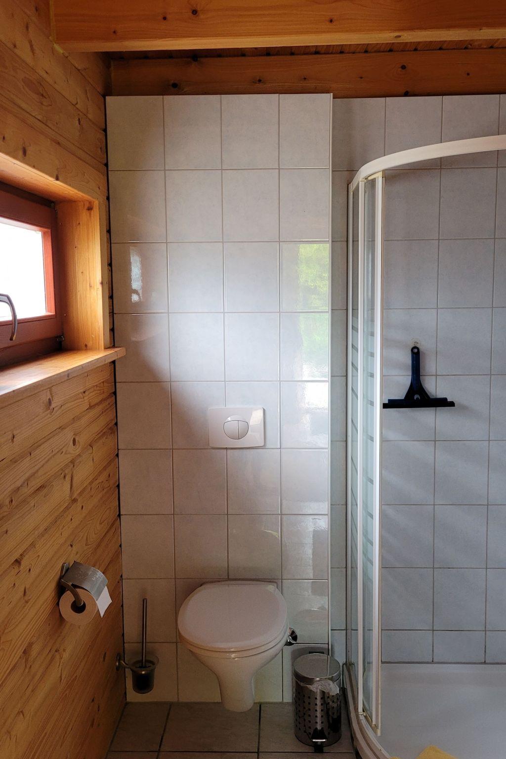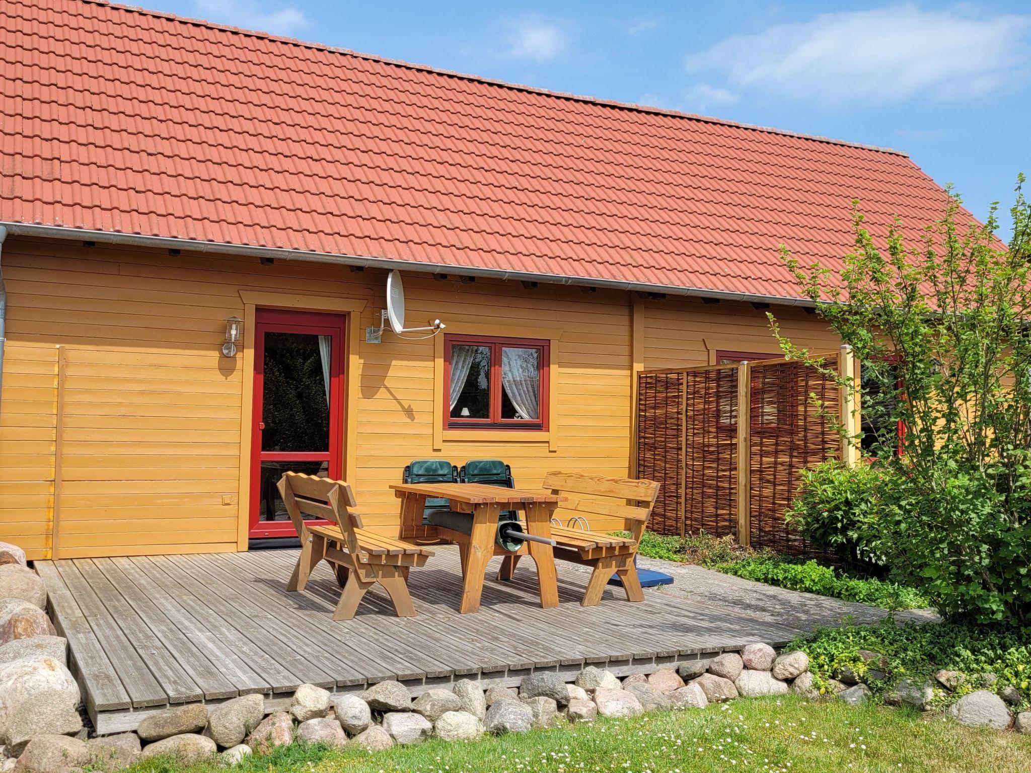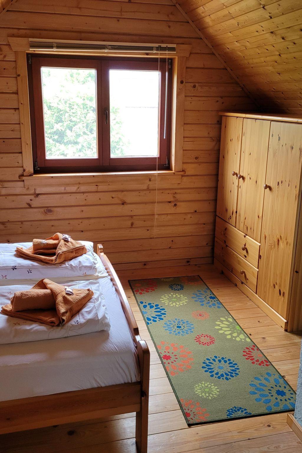 The holiday flat no. 4 is located together with another holiday flat (no. 3) in a wooden house at the beginning of the village. The flat extends over 2 floors. On the ground floor is the living room, the kitchen with dining area and the bathroom with shower/WC and washbasin. A balcony door leads to the outside terrace. The living room, kitchen and dining area are connected as open-plan areas. The living area is equipped with a satellite TV, CD player, radio and a cosy couch. The two bedrooms are located on the upper floor. The first bedroom has a double bed 140 cm wide, the second has two single beds, each 90 cm wide. The terrace is equipped with a parasol and various items of garden furniture. In front of the holiday homes is a 2400 square metre lawn with an uninterrupted view of the surrounding countryside and a 250 square metre fish pond. The village's own bathing area is only a few hundred metres away. The most beautiful beach on the Müritz, with marvellous sand, beach chairs and corresponding facilities, can be reached by bike in 10 minutes. There you can also set sail with the White Fleet or hire a boat yourself. In the neighbouring town of Klink (2 km) there is an indoor tennis court with adjoining bowling alley, as well as a sports field. You can hire bicycles just 200 metres from the holiday flat. A bus stop, from which you can travel to Waren, is only 150 metres away. In Röbel (18 km) you can visit the local thermal baths in the cooler months of the year.