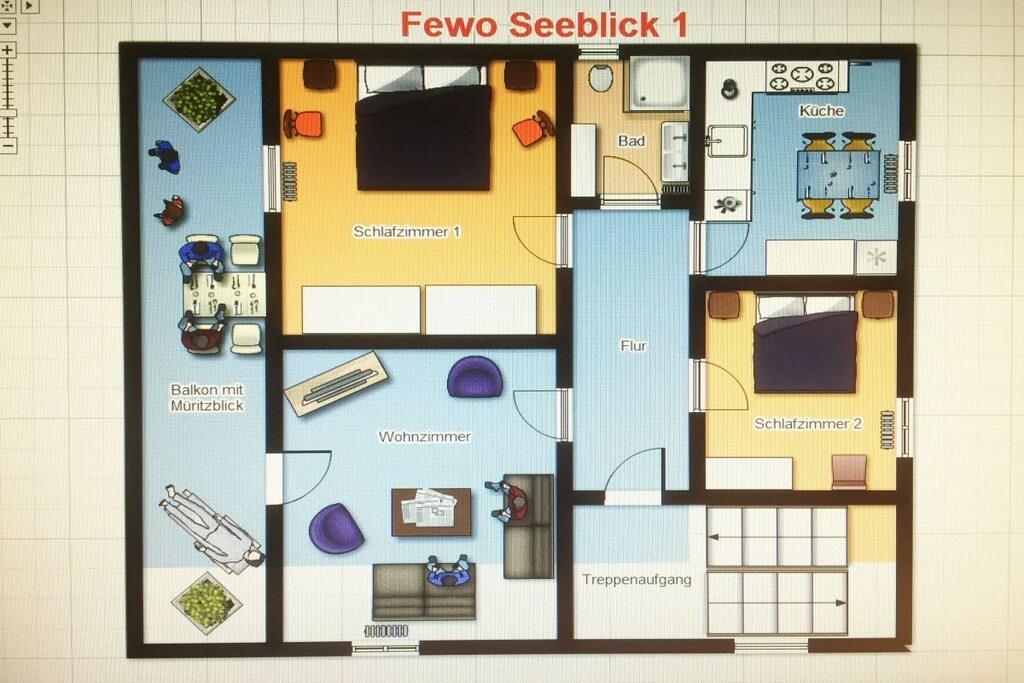 Maritime holiday apartment for 1-6 persons, with 2 bedrooms and 1 large bathroom, directly on the Müritz lake shore, with lake view
