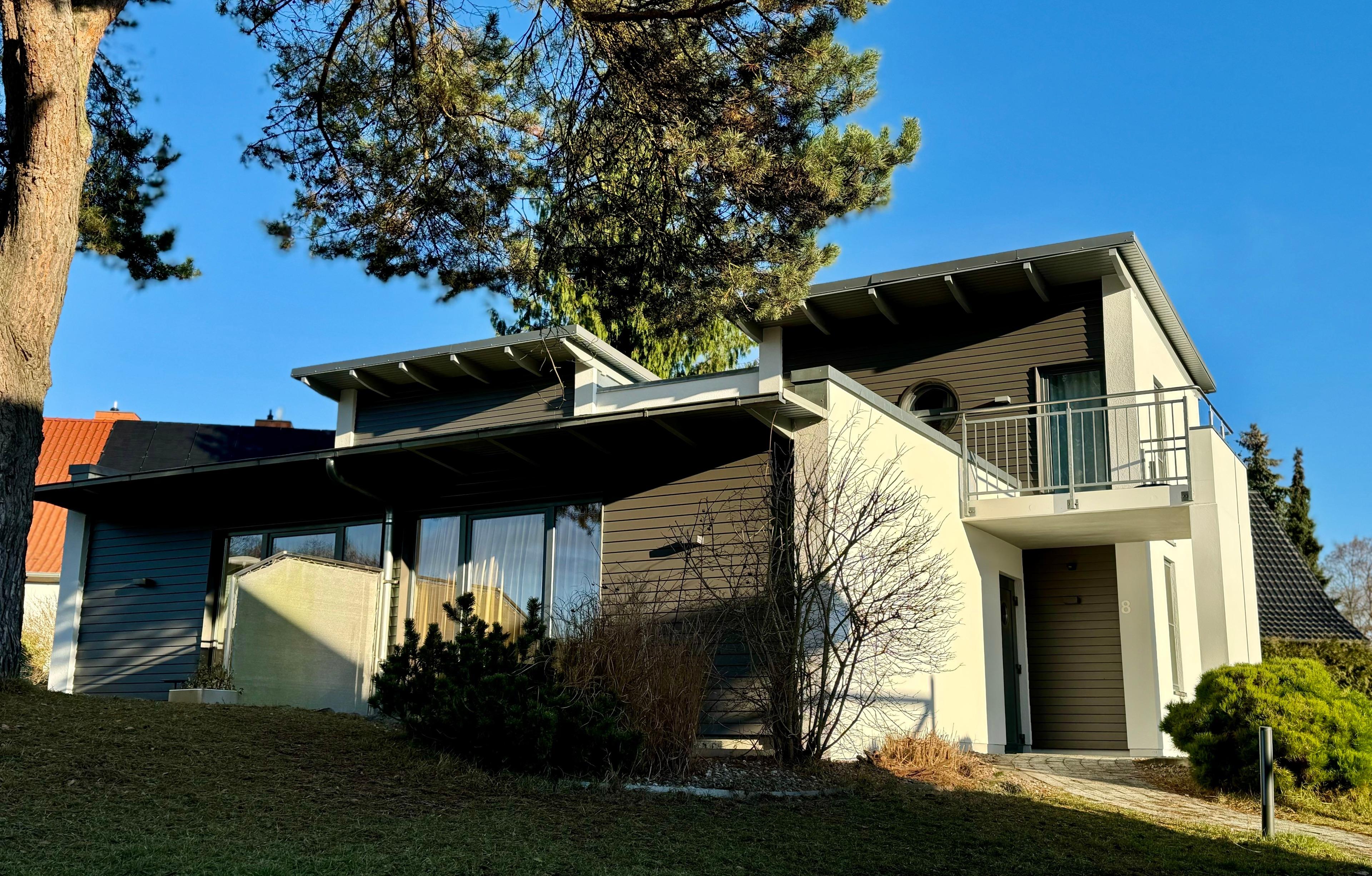 Vor dem Wohnzimmer befindet sich die möblierte Terrasse mit Esstisch, Stühlen, einer Sonnenliege und einem Sonnenschirm.